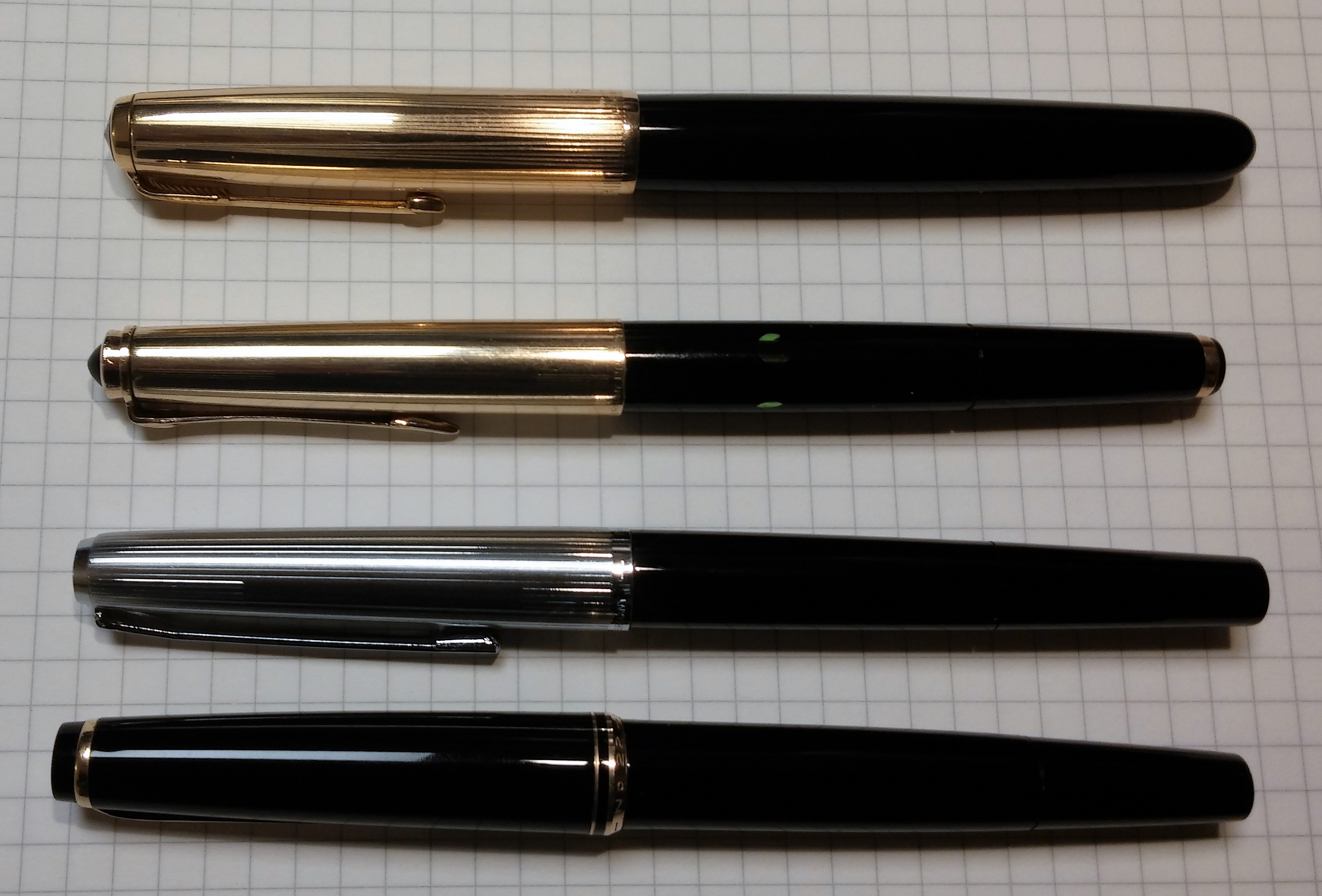 Ecco un confronto con alcune penne coeve: la Parker P51, che ha ispirato il pennino coperto, la successiva Pelikan M20 ed una Montblanc N°22