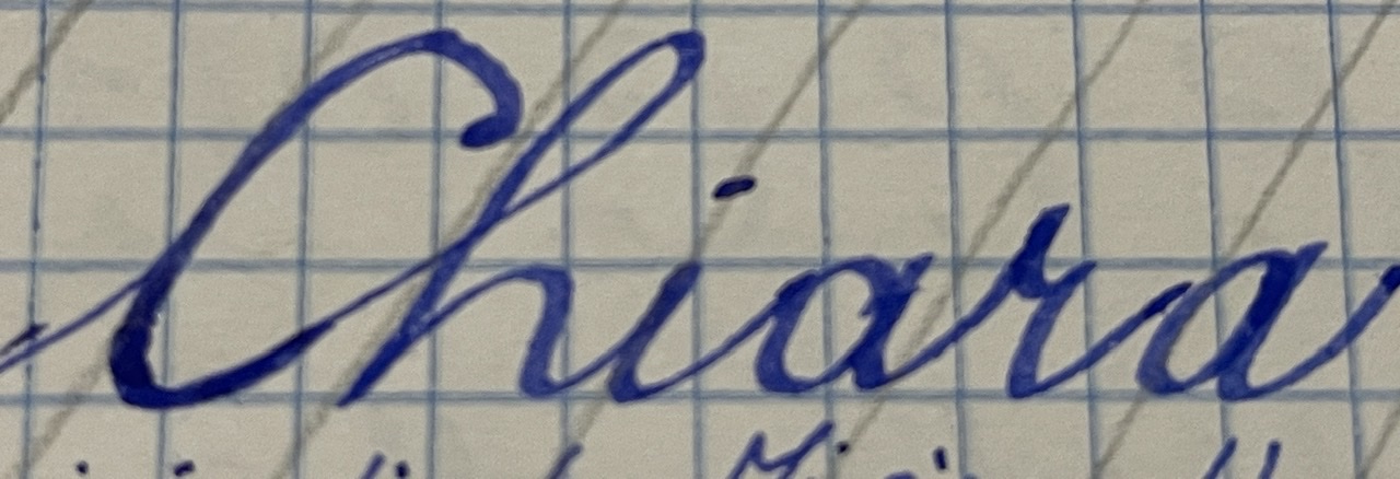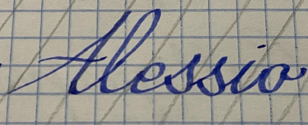 Indubbiamente il pennino tronco non è la scelta migliore. Il tratto grosso si presenta sia in fase ascendente, sia discendente senza possibilità di controllo. Ho fatto comunque qualche prova introducendo le falserighe a 55º e l’effetto non mi dispiace, pur essendo decisamente meno elegante.