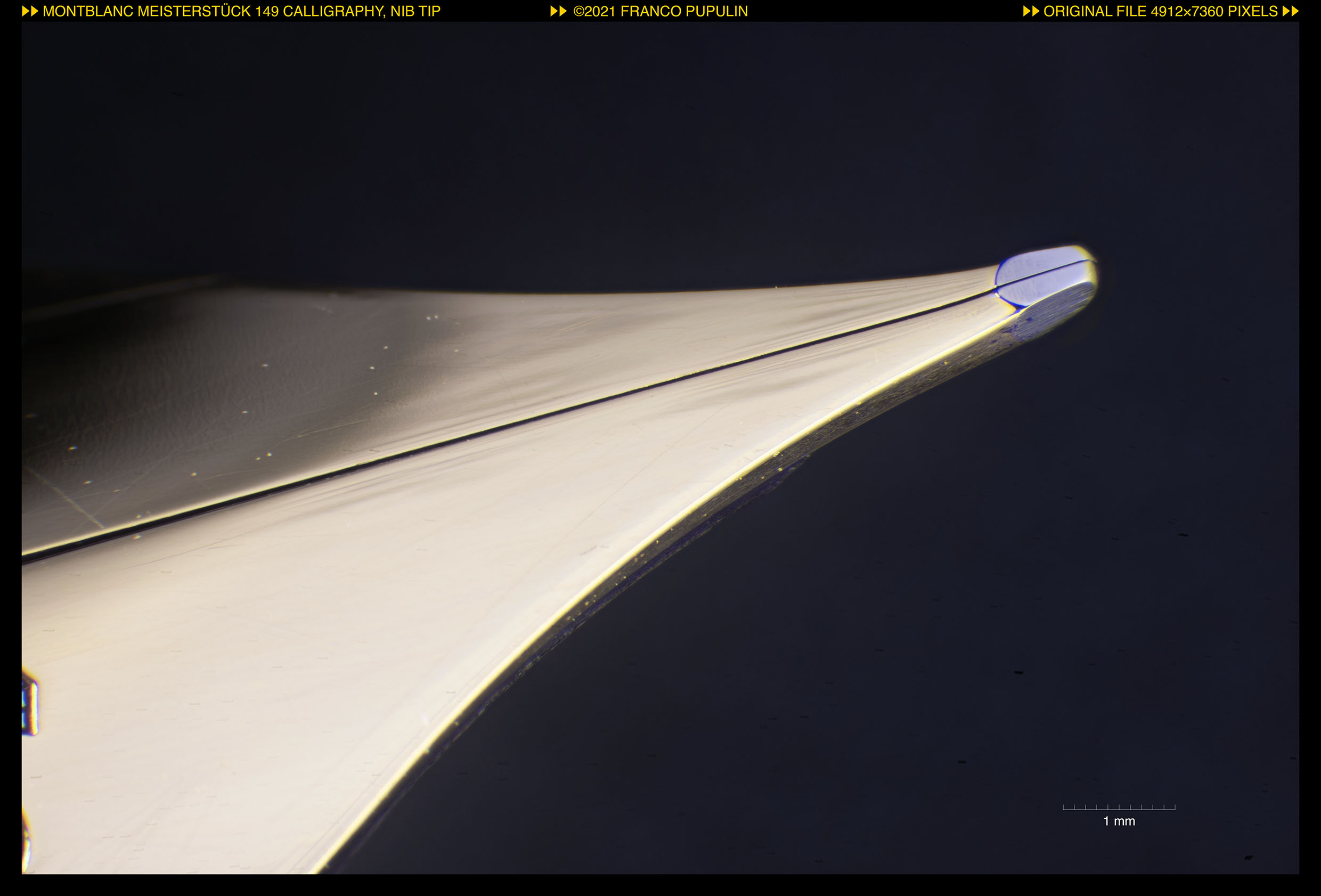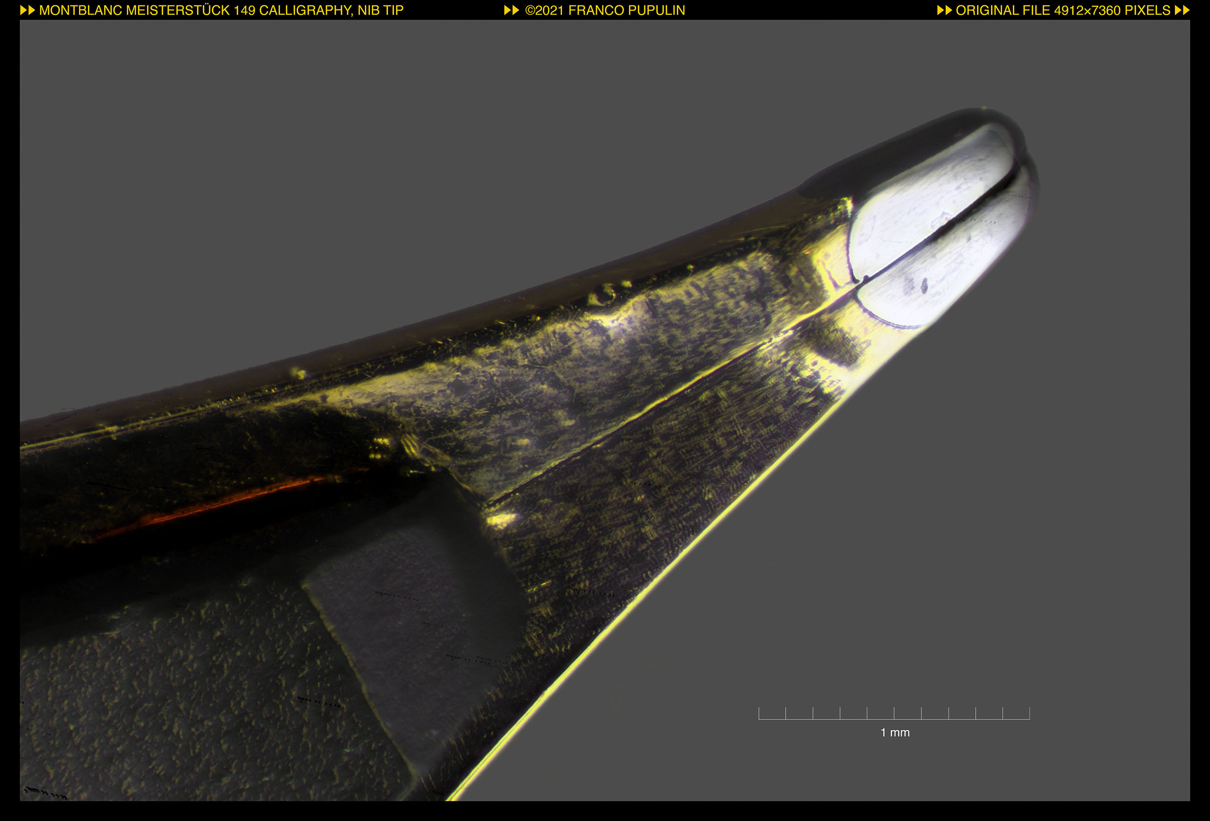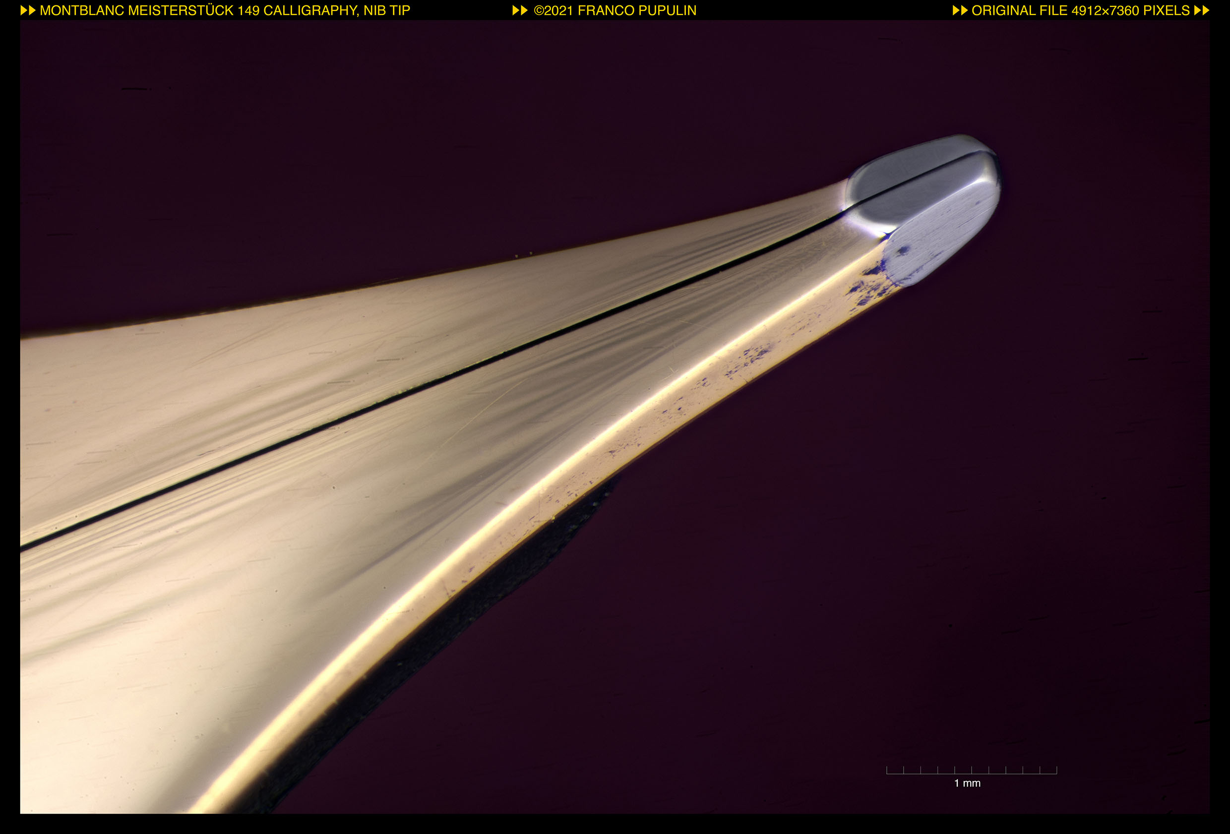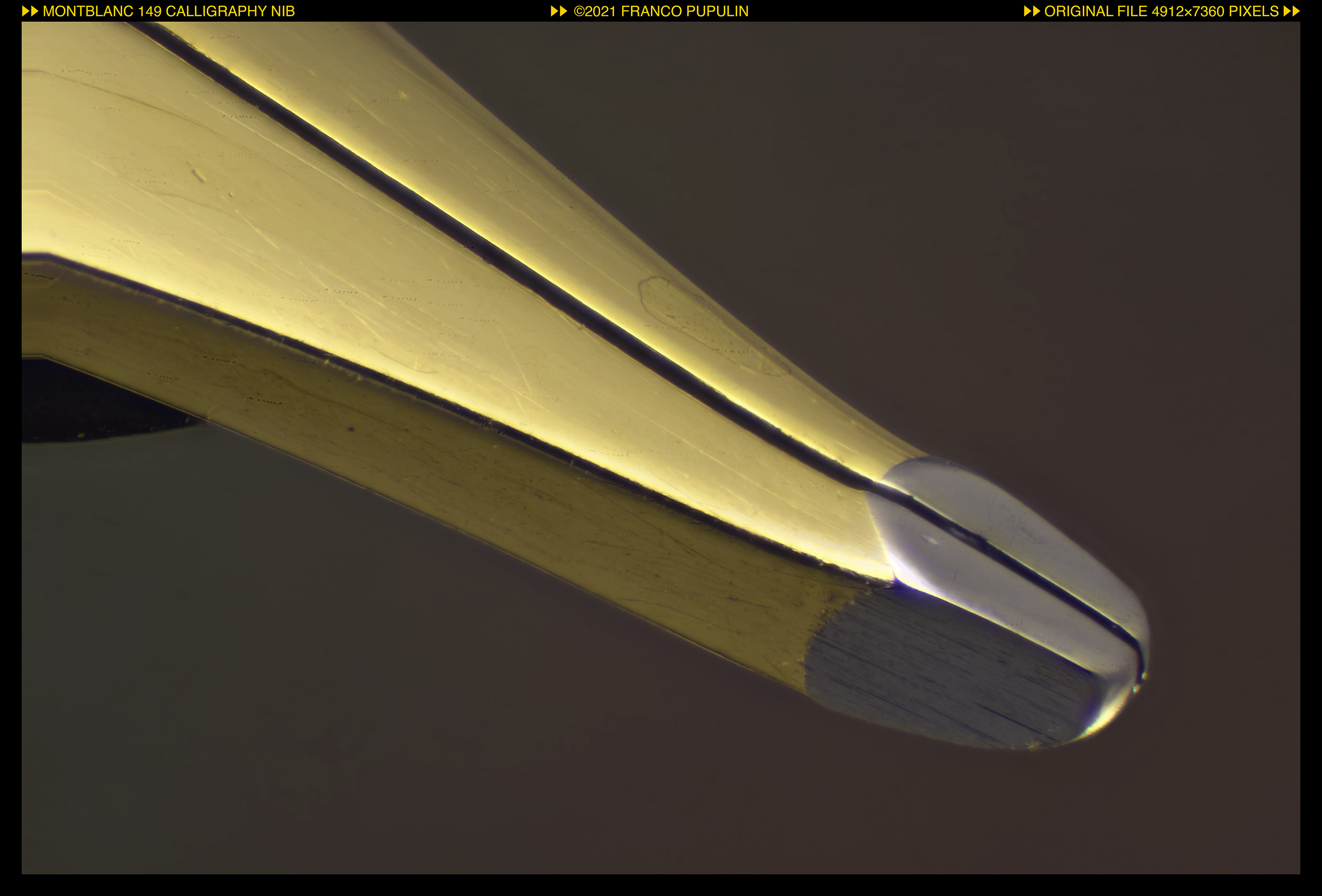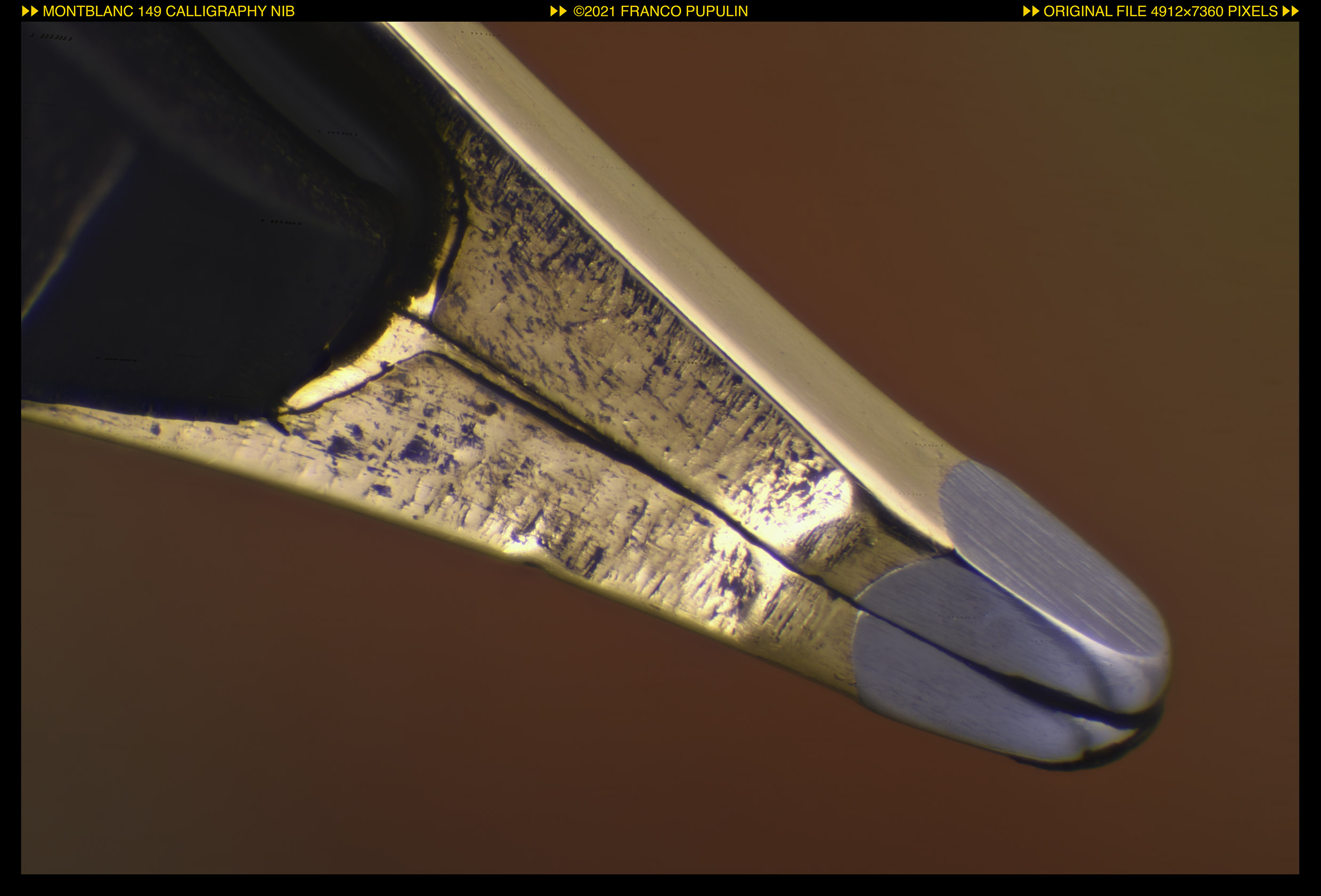 A parte la bellezza delle linee, viste attraverso lo stereoscopio, mi ha colpito la precisione della lavorazione della punta di iridio che, se ben capisco, é rifinita a mano come gli altri pennini della casa di Amburgo. Le foto seguono hanno ingrandimenti di 4x e 6x.