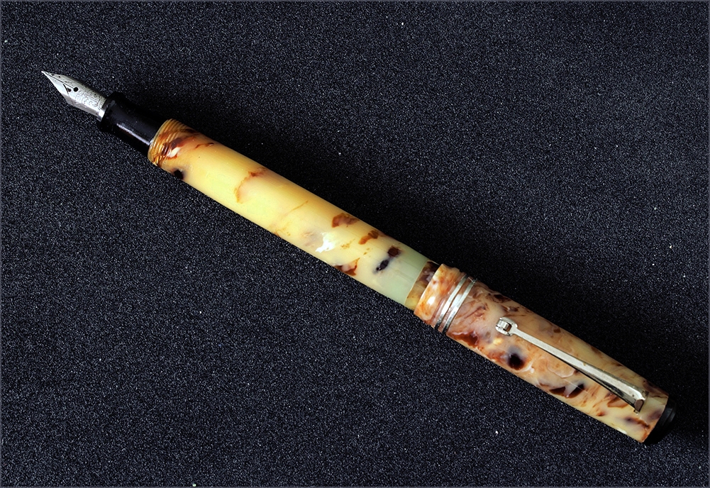 Io ho smesso da tanto la mia attività di ricerca, ma prima del blocco causa Covid, ero andato in un mercatino di roba di seconda mano perchè un amico mi aveva detto che vendevano un ingranditore fotografico non funzionante che sto cercando per recuperare dei ricambi introvabili, ebbene l'ingranditore non c'era più ma sono uscito con questa penna anonima di produzione italiana anni 50 a pulsante di fondo , pennino in acciaio Mercurio, bellissima celluloide color crema con marezzature marrone radica.