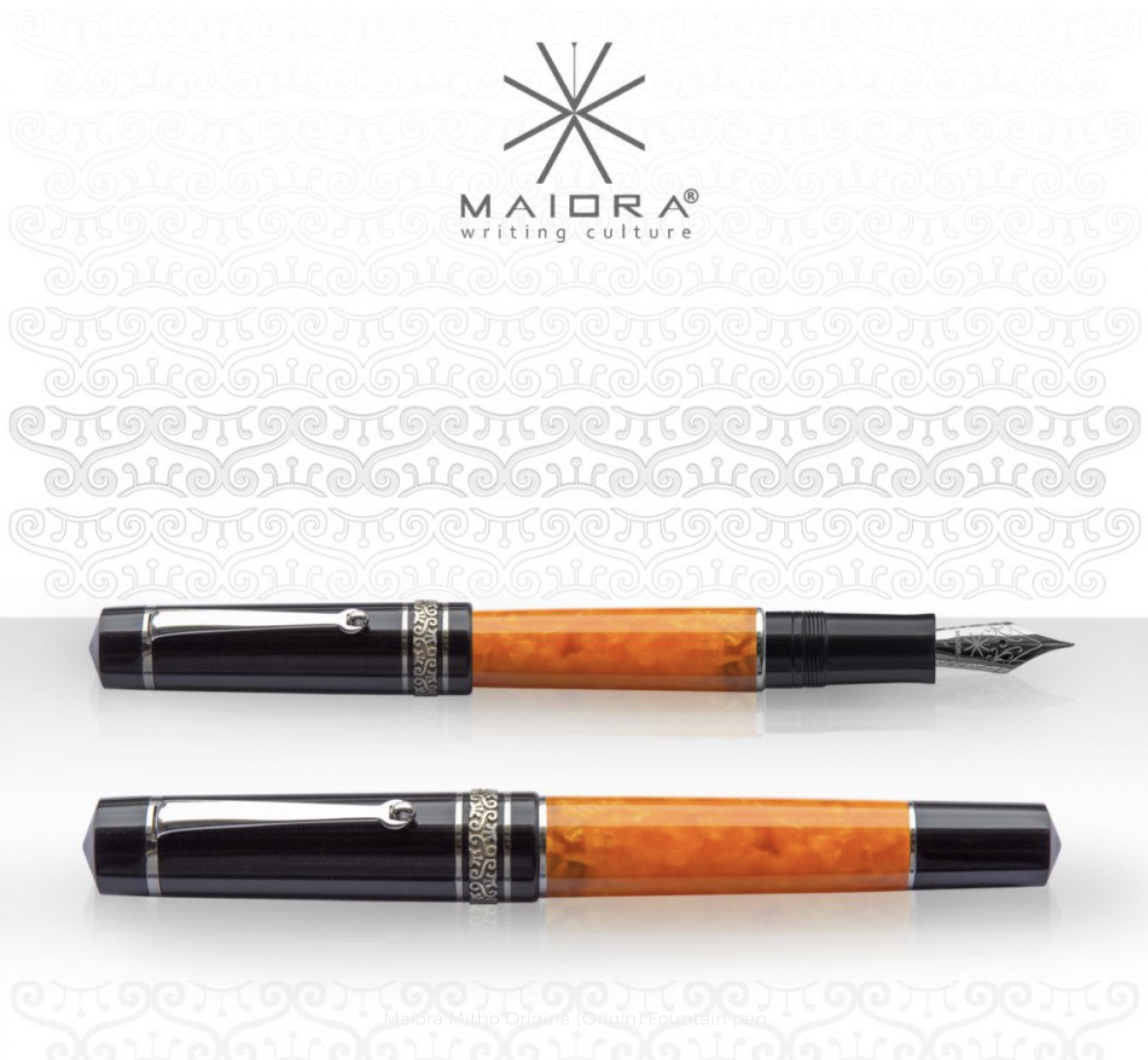 Dunque, con il nome di Mitho, l'azienda Maiora ha "rifatto" la Dolce Vita. Ne hanno diritto perché, così mi pare di capire, i fondatori di Maiora provengono dalla Delta. E di fatto, la Maiora Mitho K Origine (questo é il nome completo della penna) ha la stessa bellissima resina screziata arancione con il cappuccio, il cono di carica e la sezione neri, e un elegante motivo ad altorilievo sulla vera del cappuccio, come la bella invenzione di Delta che si fece conoscere nel mondo con il nome di "Dolce Vita".