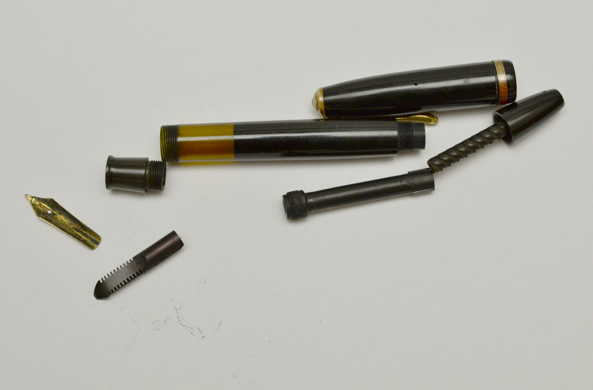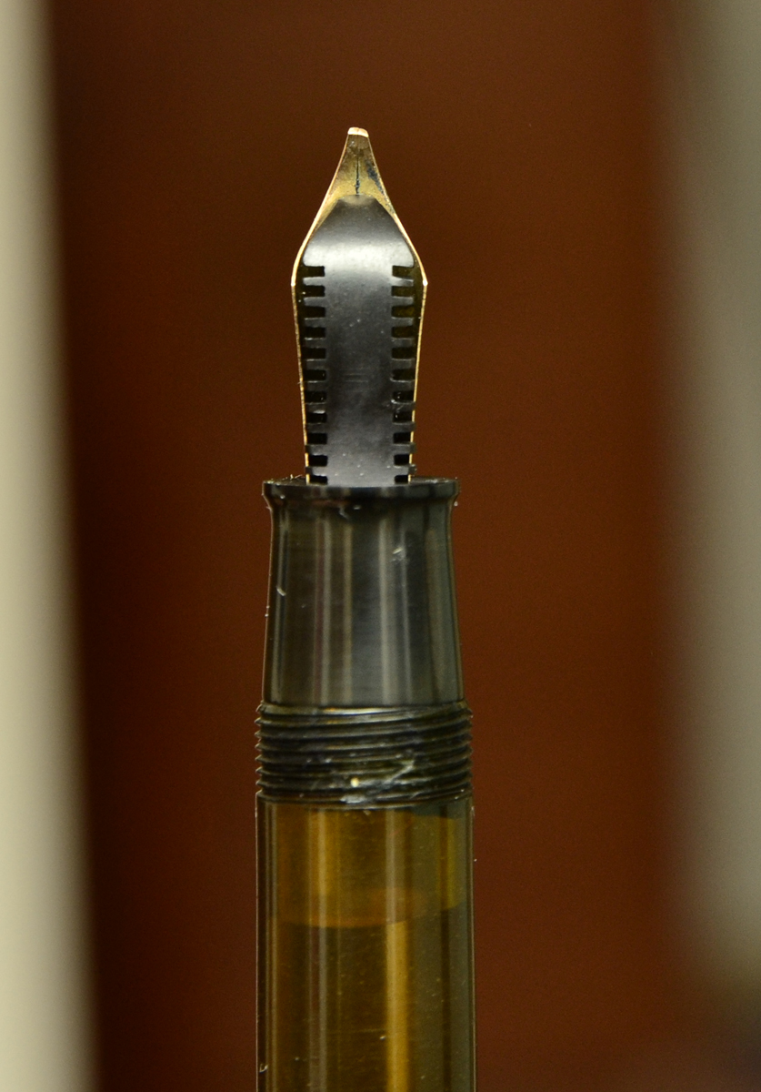Questa Goliarda al contrario delle altre con pennini d'acciaio che usano la pompetta, è del tipo con carica a pistone, da notare il sistema è molto simile a quello della Omas ad ogiva, con lo stesso tipo di sedi all' interno del fusto.