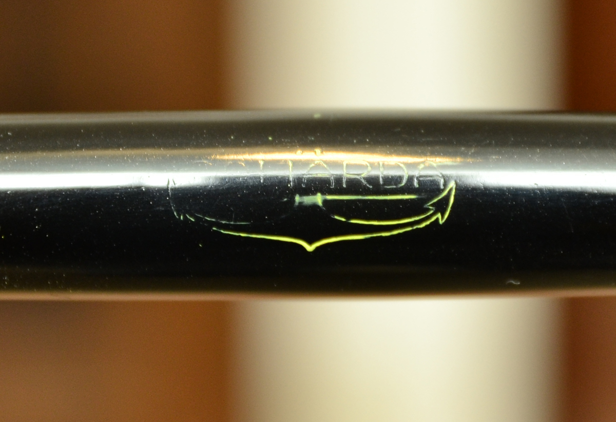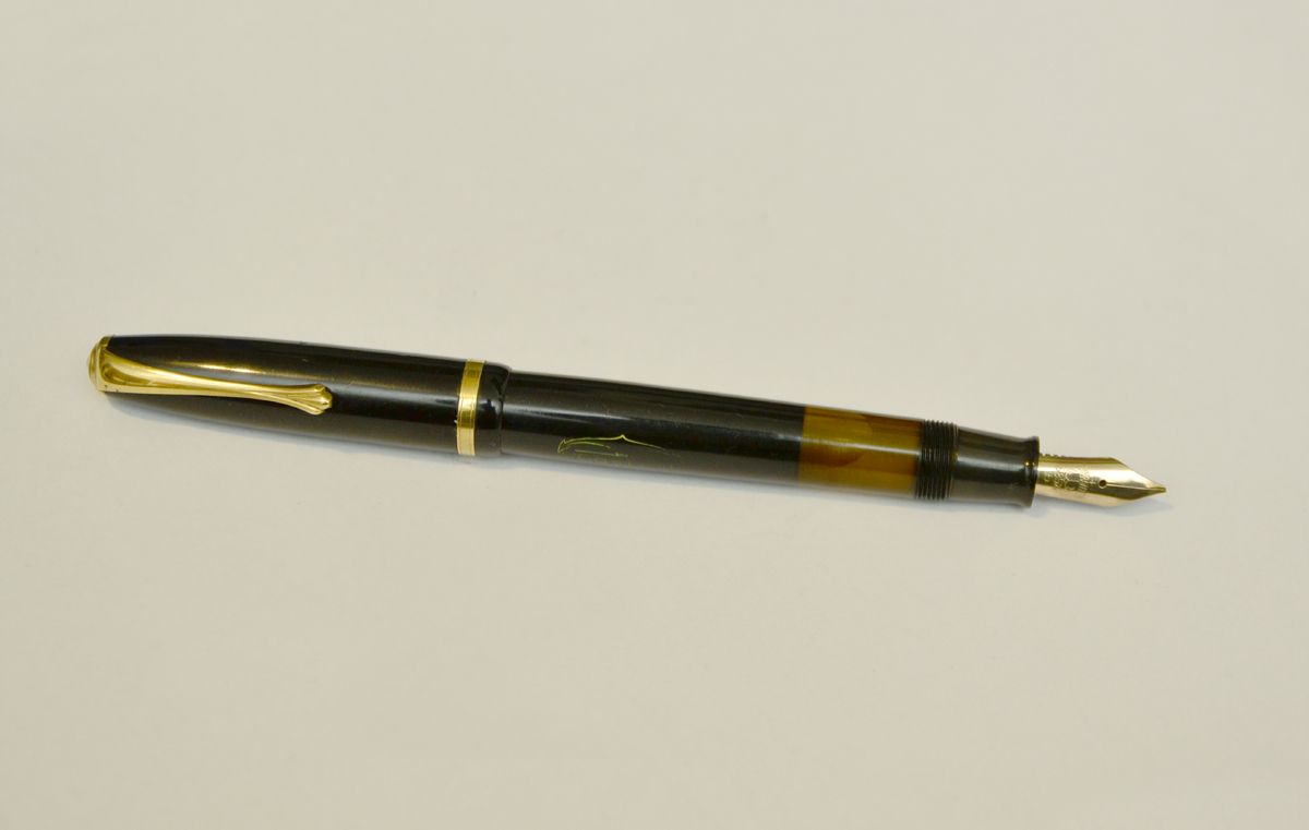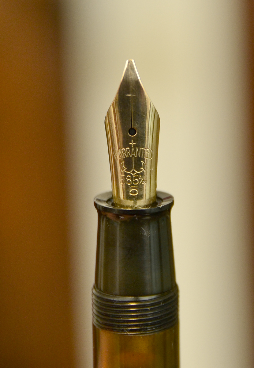 Ha le rifiniture placcate ed il pennino in oro Stub con la scritta Warranted, 585 millesimi , la misura è 5 con inciso un ancora, non credo sia stato modificato perchè mancante dell'iridio, penso sia originale anche perchè visto lateralmente si ispessisce verso la punta.