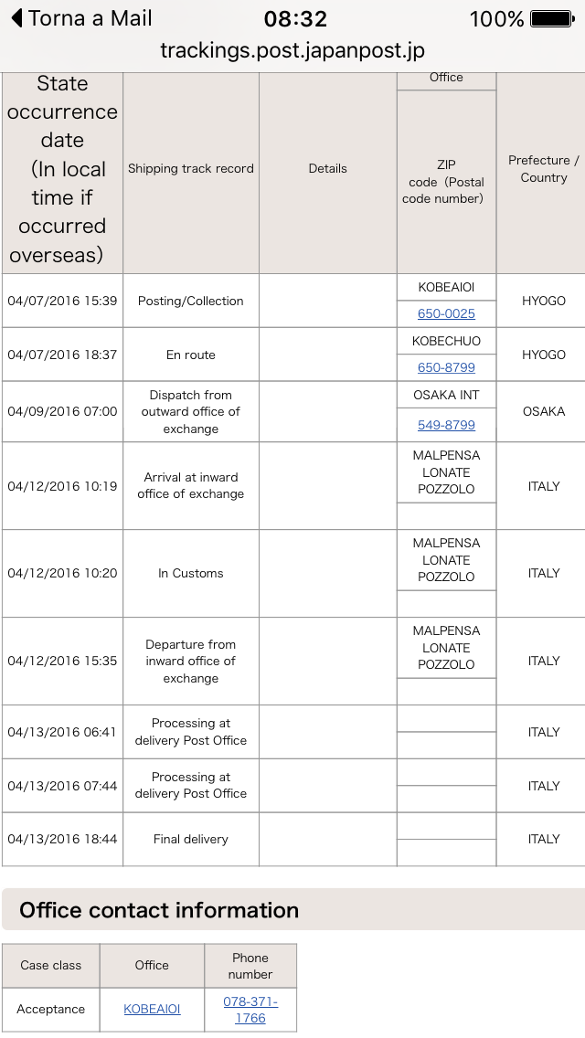 E qui i dettagli delle tempistiche di spedizione e giacenze in dogana. Rapidissimi.