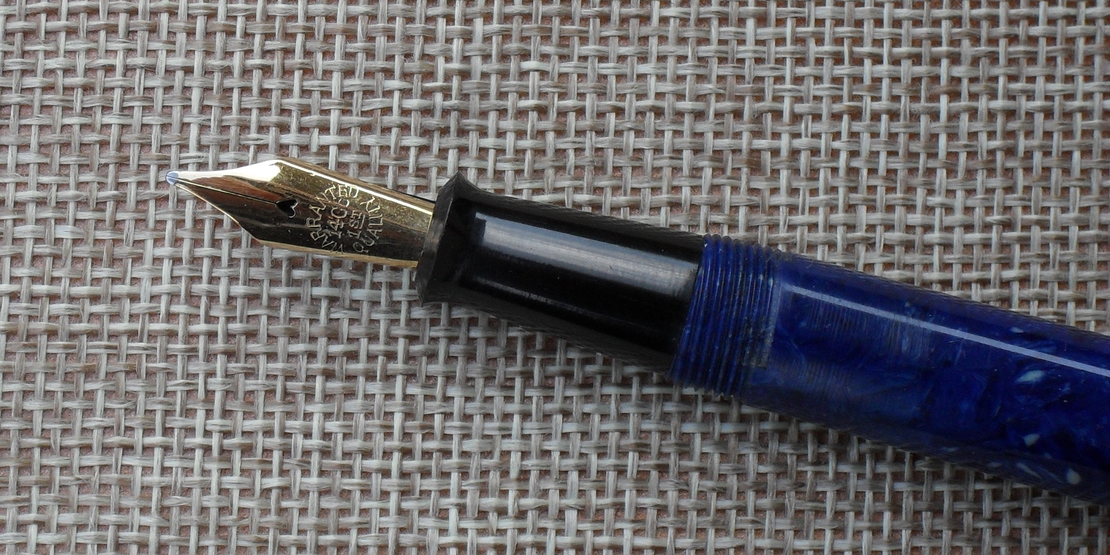 Introdotto nella seconda metà degli anni Venti, quando il colore si è conquistato una bella parte di palcoscenico nel campo delle stilografiche, il modello H.100 viene reso disponibile non solo nel classico nero, da sempre il più venduto sul mercato inglese, ma anche in verde giada e blu lapislazzuli, per citare solo quelli dei quali siamo certi. La penna che potete ammirare è in ottime condizioni e recava ancora attorno al cappuccio la fascetta originale, che esplicita la durata della garanzia: 25 anni, segno evidente di notevole confidenza nella qualità del prodotto. Trattandosi di una semplice fascetta di carta, e non di un adesivo, è stato molto semplice rimuoverla senza danneggiarla, per mostrare la stilografica in tutta la sua incontestabile bellezza.