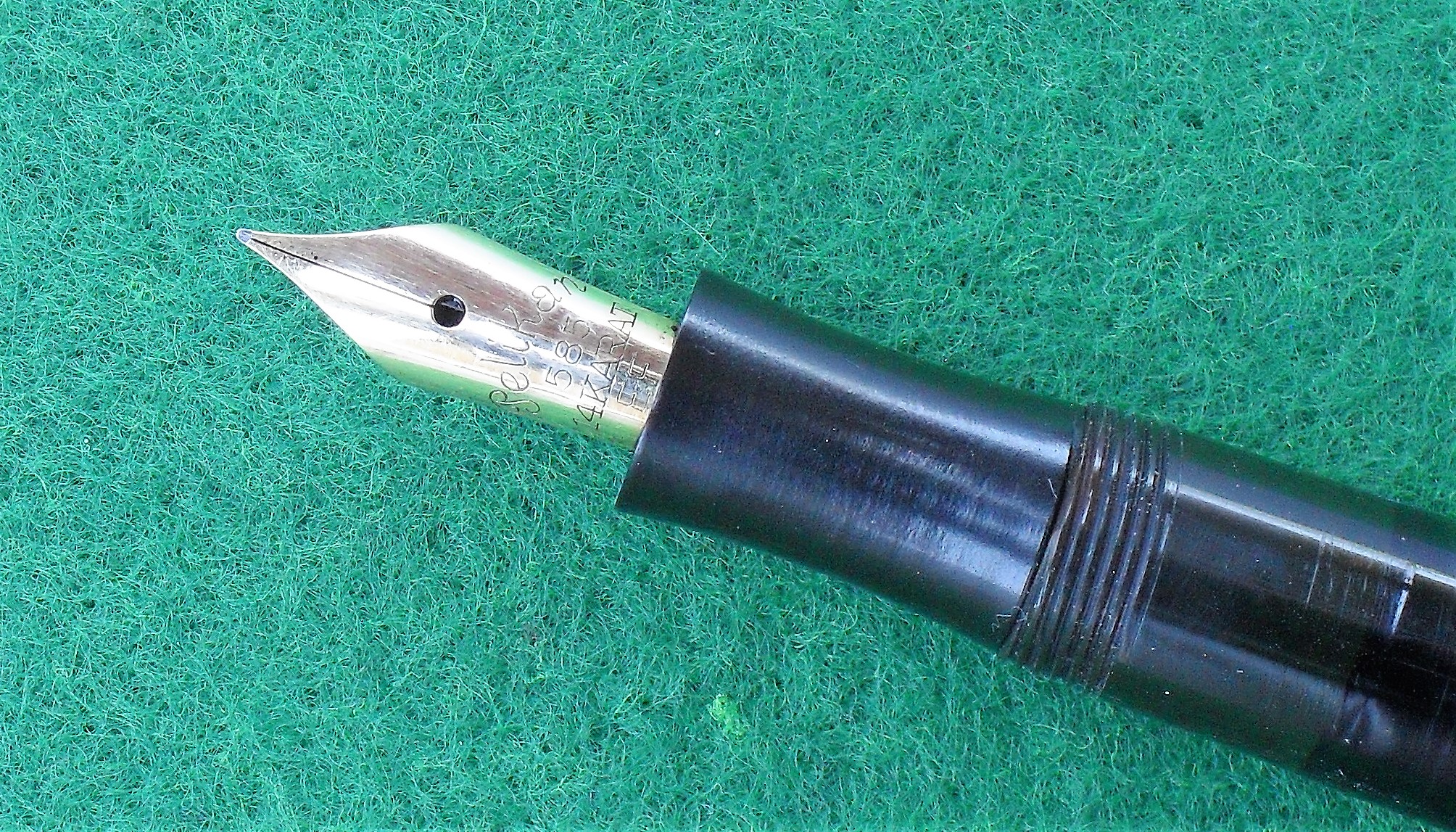 L’unica vera pecca di questo esemplare, almeno da un certo punto di vista, è la mancanza del pennino originale, anche se il Globus extrafine flessibile installato può benissimo essere una sostituzione dell’epoca ed essere così considerato, perlomeno, coerente. Certamente, fa parte a pieno titolo della storia della penna. Tra l’altro, scrive benissimo.