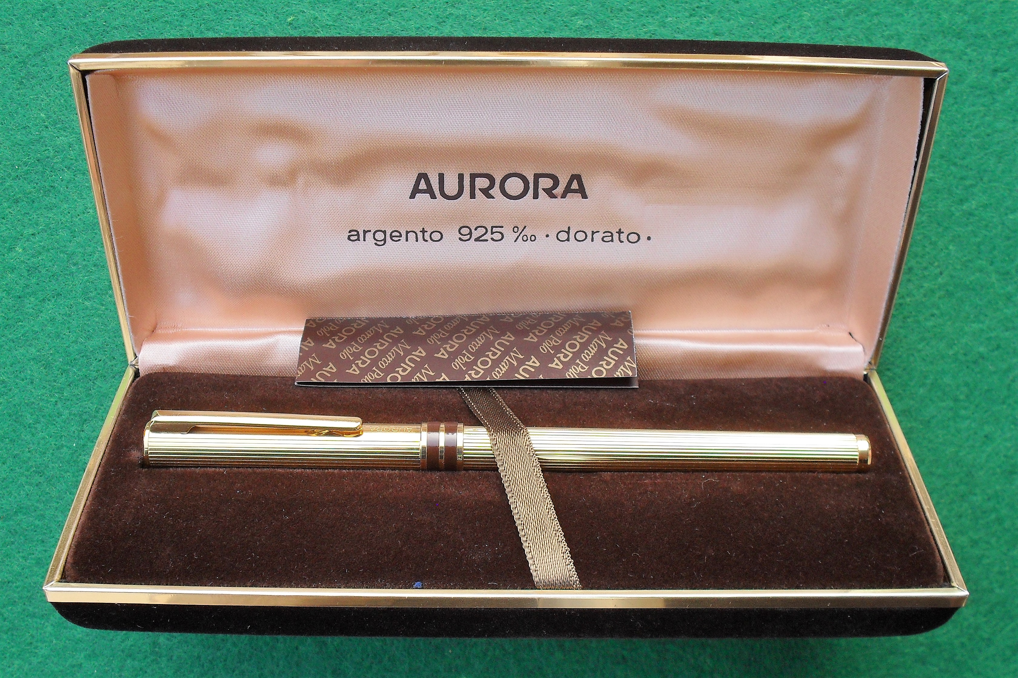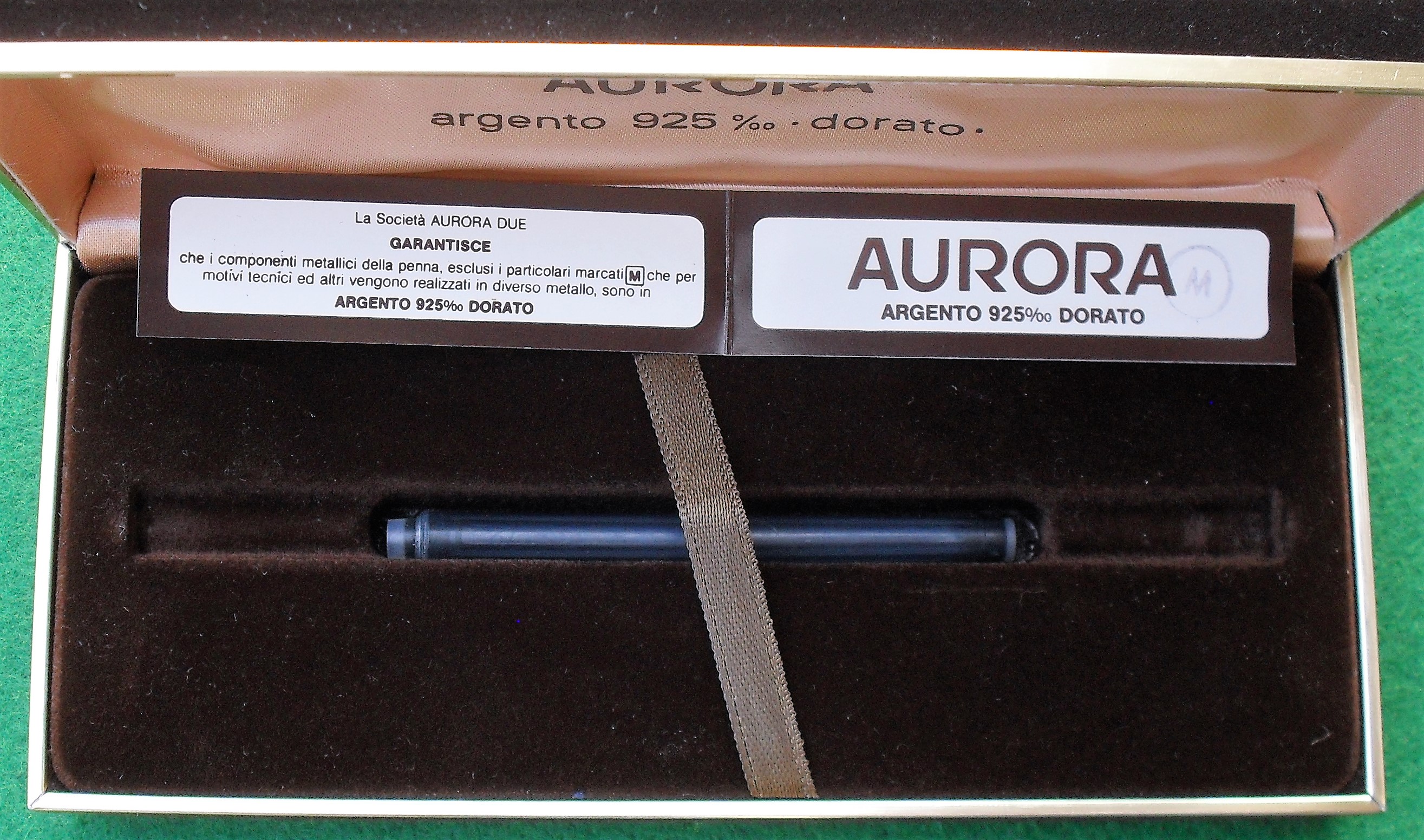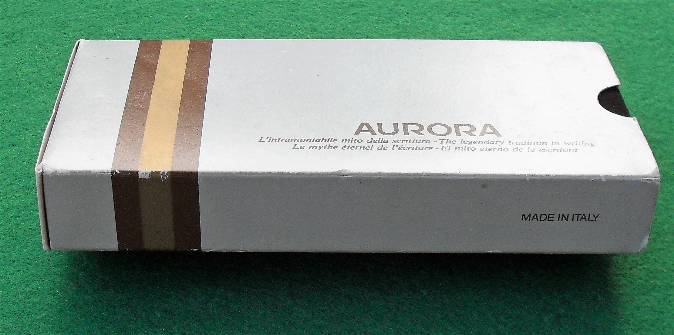 In allegato posto la scatola del 1982 per la versione sfera in acciaio con inserti dorati, e non ho motivo di pensare che per la stilografica fosse diversa. La confezione è economica in plastica rigida color marrone tendente al nero, all’interno stampo in plastica vellutata con tappetino in cartoncino marrone e logo aurora. Color crema e marrone la soprascatola. Naturalmente le versioni in argento, oro o vermail avevano confezioni più curate.