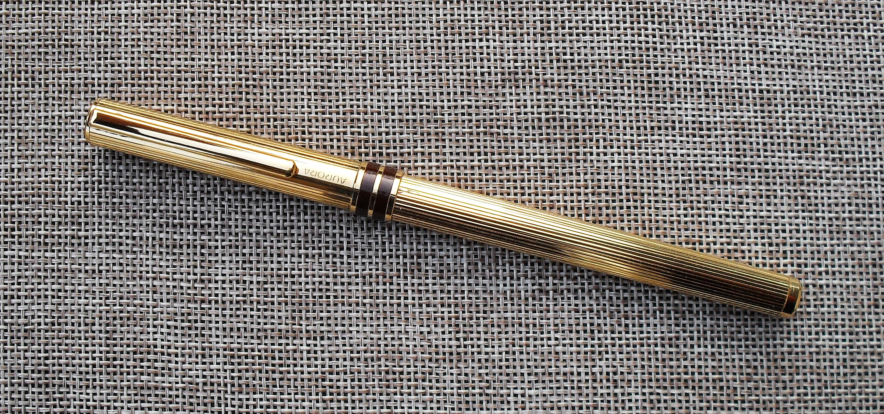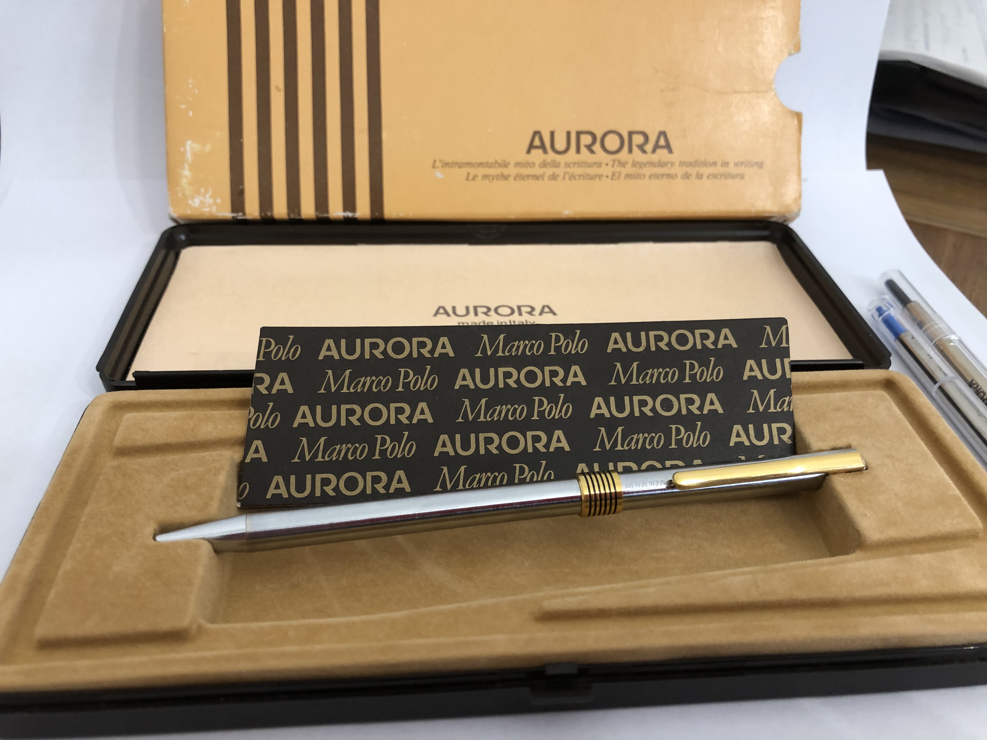 Con la recensione d’una Omas 80 e con l’acquisto d’una bella coppia d’Aurora Auretta lusso, penne sottili in acciaio spazzolato, mi si è dischiuso l’universo degli strumenti di scrittura in metallo. L’Aurora Magellano (viewtopic.php?f=72&t=25364), attualmente una delle mie stilografiche preferite, mi ha confermato in questo interesse e così ho deciso d’acquistare un’Aurora Marco Polo. Questo modello fu “vestito” in tanti modi: dal metallo spazzolato all’argento massiccio, dal nero al blu, dal rosso mattone al vermeil, per citare solo quelli dei quali ho contezza.