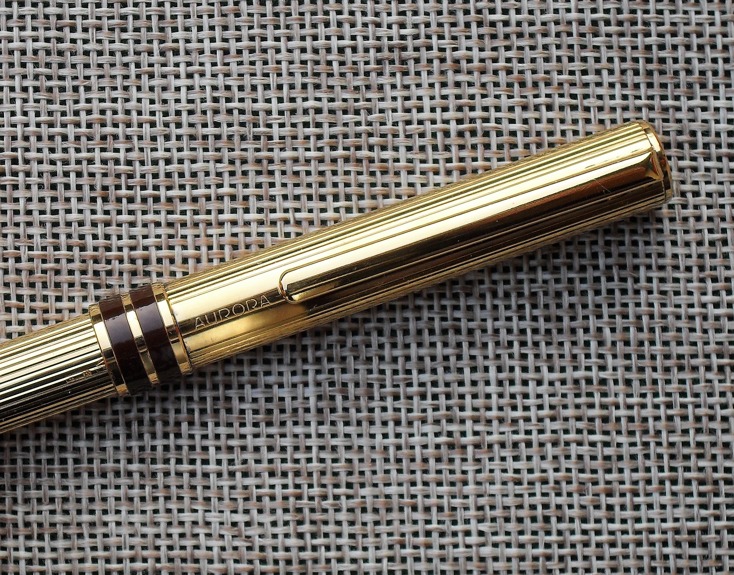 Da quanto apprendo, la Marco Polo fu introdotta nel 1982, sulla scia del successo dell’Aurora Hastil, disegnata tredici anni prima da Marco Zanuso, la progenitrice di tutte le stilografiche cilindriche sottili ed anche la più famosa, primo strumento di scrittura ad essere esposto al MOMA di New York, tempio dell’arte contemporanea (https://www.moma.org/collection/works/1919). Come abbiamo visto, della Marco Polo furono proposte diverse versioni, almeno fino al 2000. La cosa è certa, perché in quell’anno sulle confezioni la cifra 2000 fu accoppiata al nome della penna, creando la “Marco Polo 2000”. Dunque, questo modello fu presente sul mercato per almeno 18 anni. Un buon record, specialmente tenendo conto del consumismo moderno. Dal mio punto di vista, quella che vi presento è una delle varianti più eleganti e sofisticate. A testimonianza del materiale pregiato, sia il fusto sia il cappuccio portano impressi la cifra 925 (in un’ellisse) ed il punzone di Aurora (n. 5 Torino), il più antico in attività (almeno nel torinese), se non vado errato. Le due bande in smalto marrone scuro che caratterizzano la vera del cappuccio donano alla penna classe ed originalità, accompagnandosi morbidamente alla finitura dorata. Ho apprezzato la circostanza della presenza sia della confezione originale, in un bel velluto marrone scuro con dorature e rivestimenti interni in cromie coordinate, sia della sovra scatola, anch’essa caratterizzata da scritte e bande coordinate marrone ed oro e completa di fascetta descrittiva del modello, atta a facilitare la gestione dei prodotti riposti a scaffale: un dettaglio che raramente si trova. Relativamente a quest’ultimo elemento, mi chiedo quale fosse il significato di uno dei due codici: infatti, mentre mi sembra probabile che 306 sia il numero del modello, forse MP 265 si riferisce alle finiture (MP potrebbe significare marrone placcato e 265 potrebbe riferirsi al vermeil)?