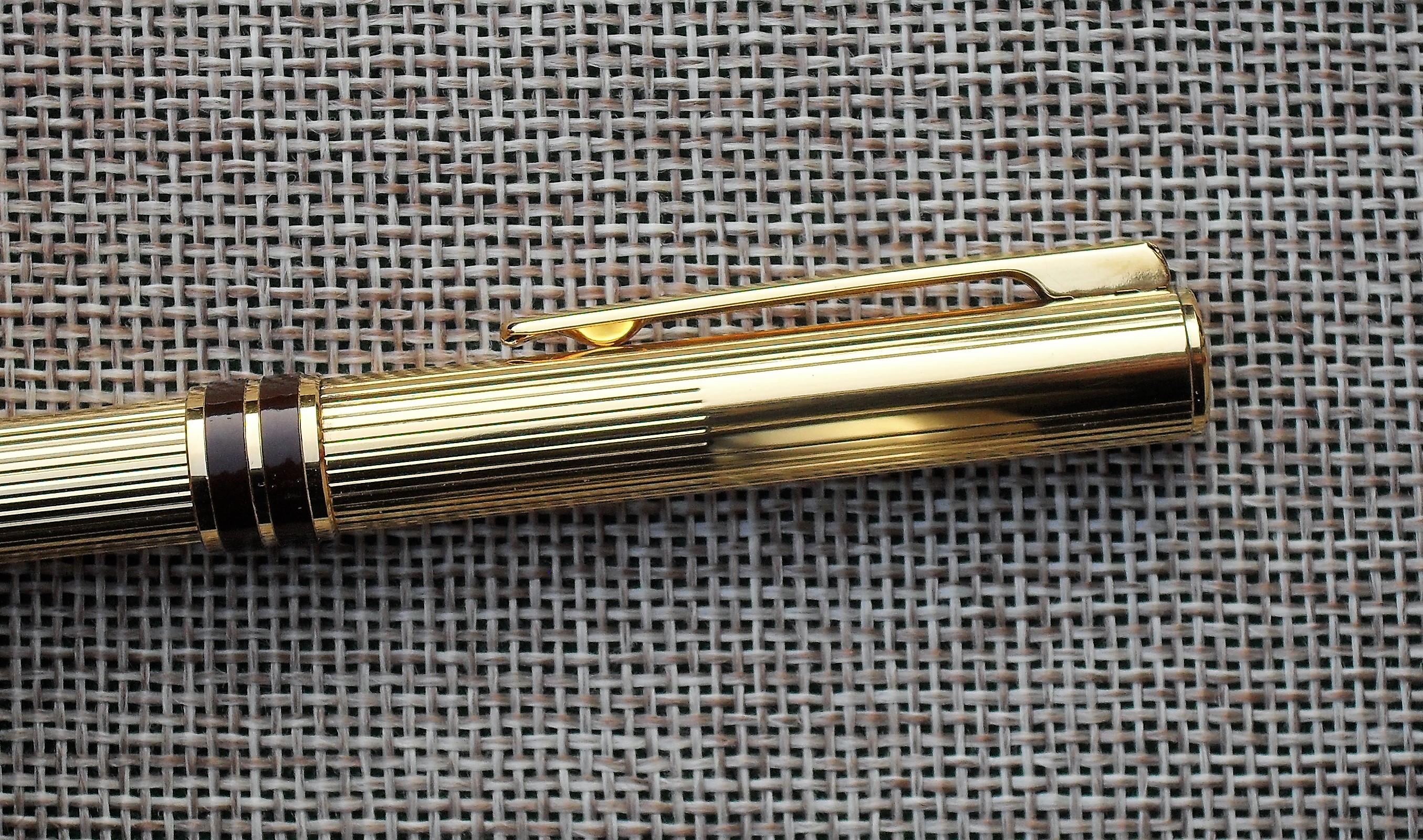 - materiali: corpo e cappuccio in argento massiccio 925/1000 dorato, clip in acciaio dorato, pennino in acciaio dorato, sezione in materiale plastico. Il gruppo di scrittura, che successivamente verrà ereditato dalla Magellano, è disegnato per integrarsi molto bene, anche visivamente, con le linee rigorose del fusto e del cappuccio, slanciate e rese ancora più eleganti dalla fine rigatura. La clip, del primo tipo a testa squadrata, completa la penna in modo coerente e discreto. Il cappuccio si chiude con uno scatto convincente e si calza sempre a scatto, facendosi un tutt’uno con il fusto. La clip è dotata di buona elasticità ed assicura un’ottima presa. Alla sommità del lato del cappuccio è ricavato un riquadro liscio, adatto all'incisione: un dettaglio molto elegante.