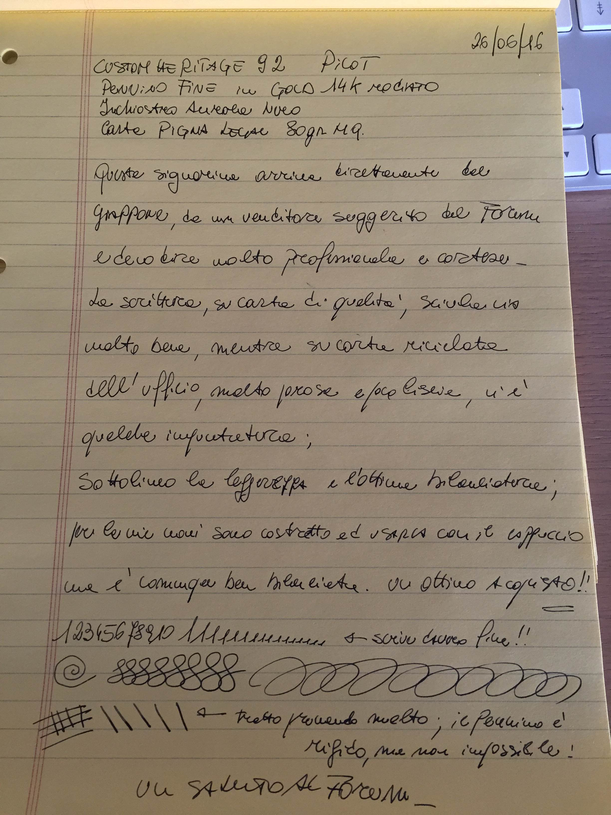il pennino, io amo il Fine vero, è stupendo ma risente abbastanza della qualità della carta ed il flusso non è mai abbondante, ma segue alla perfezione anche la scrittura veloce senza perdere un colpo;