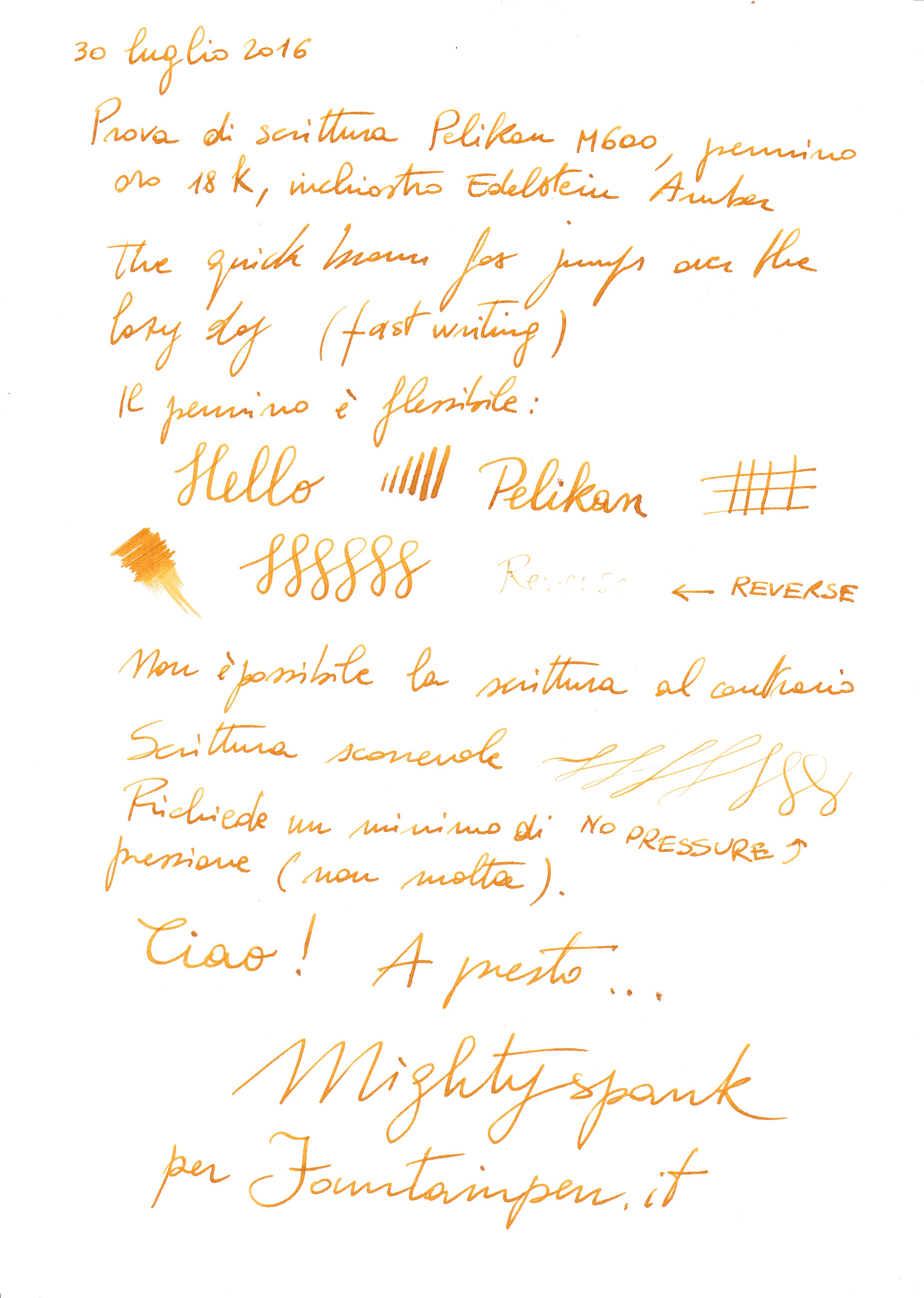 La peculiarità di questo pennino, che mi risulta prodotto per il mercato italiano, dato che la M600 montava normalmente un pennino a 14 carati, è quella di essere flessibile. Potete notare le variazioni di tratto nella prova di scrittura. Si passa da un medio a un BB e oltre. La sensazione che offre è molto particolare. Intanto è un medio mentre di solito si tratta di pennini fini flessibili e poi ha una risposta tutta sua, comunque gradevolissima.