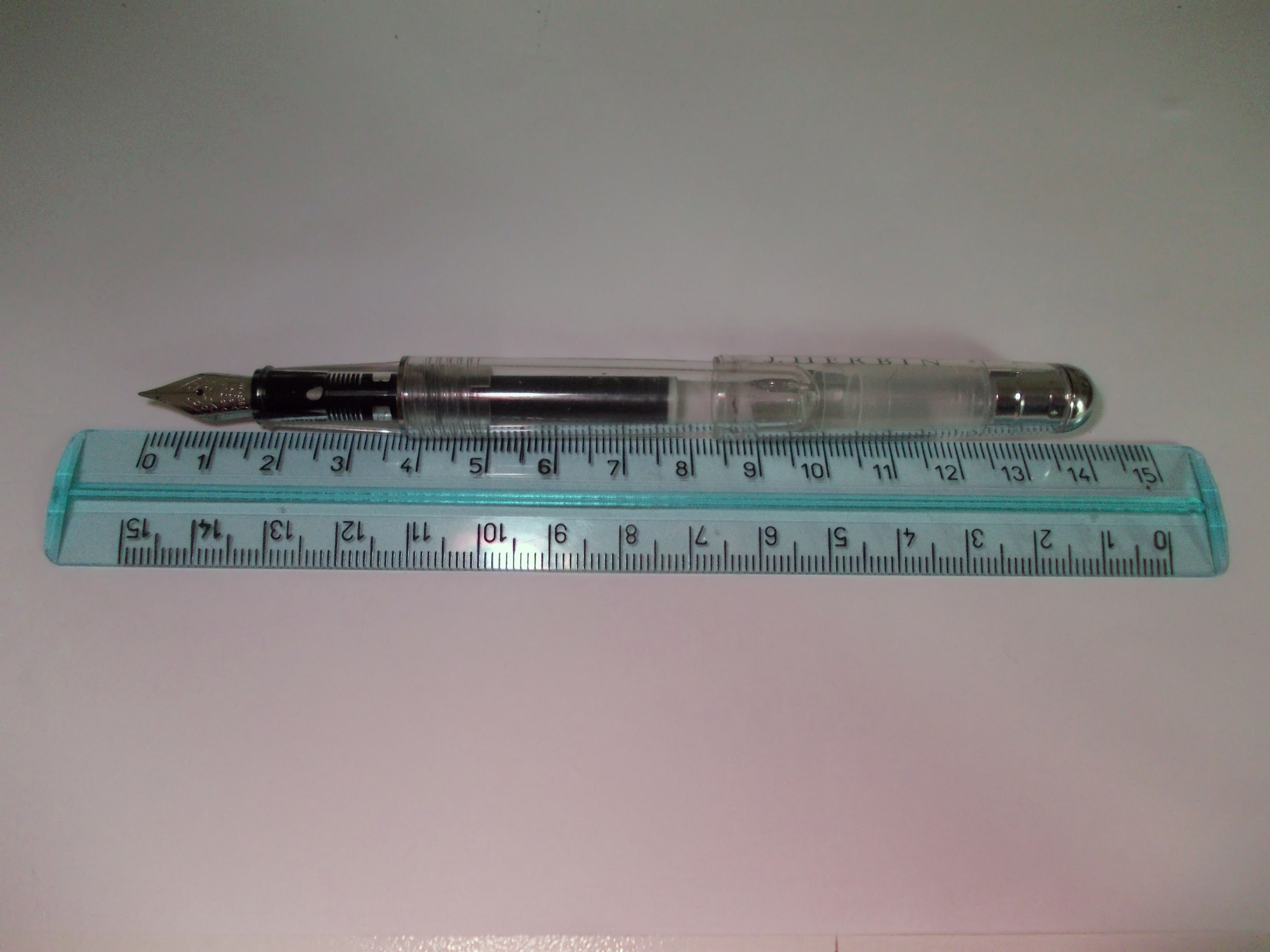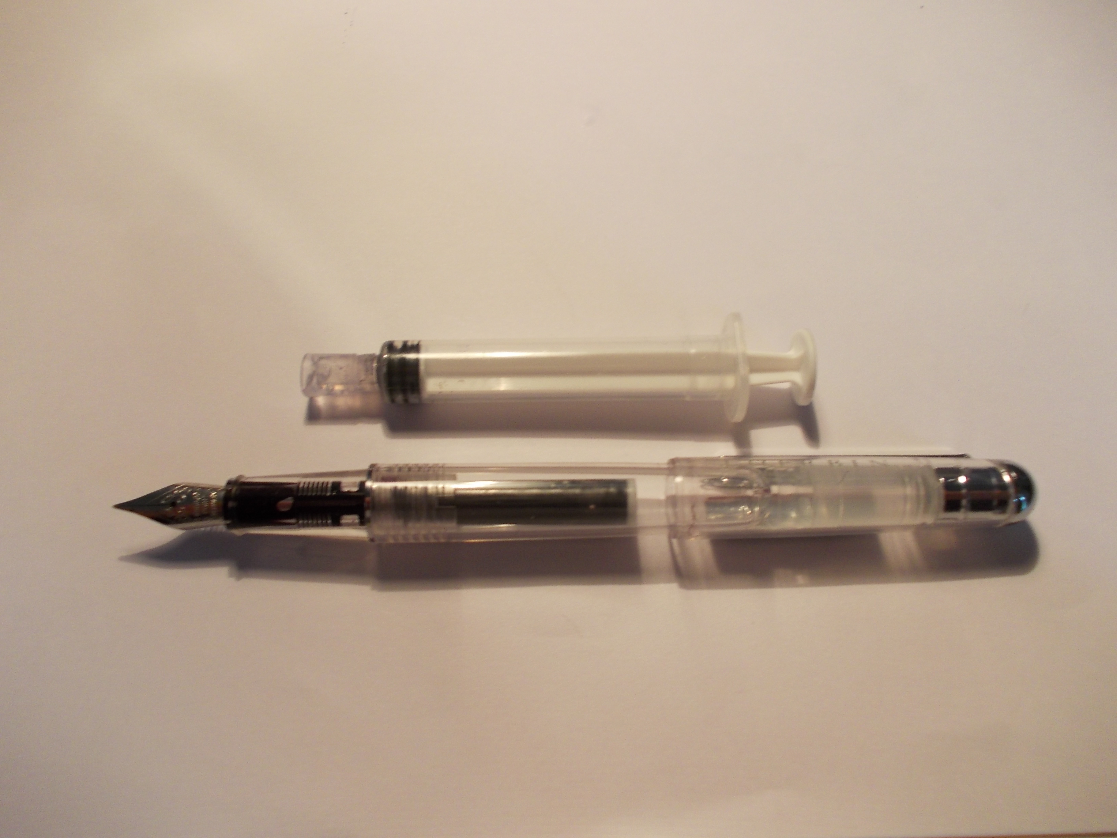 Caricata con una cartuccia pelikan 4001 di inchiostro nero non è partita subito bene, anche dopo aver intinto il pennino. Ho pensato allora di sottoporla ad un robusto lavaggio con una "lavatrice" di mia invenzione, fatta con una piccola siringa e un pezzo di cartuccia (tipo Auretta) montato alla rovescia al posto dell'ago. Dopo la cura la penna è partita subito. Ecco le sue caratteristiche: