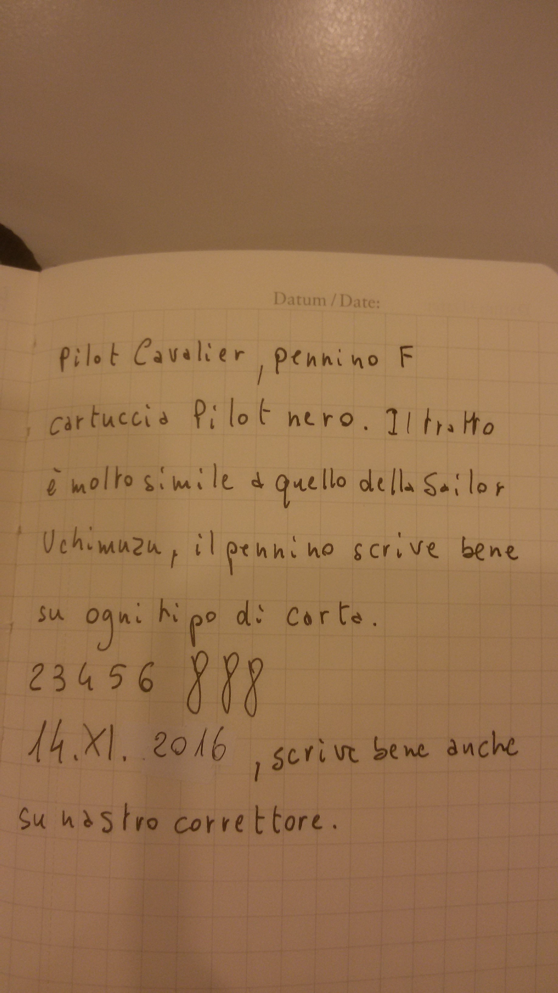 Scrittura: ottima davvero. Caricata con una cartuccia proprietaria di inchiostro nero, è partita immediatamente. L'ho usata molto negli ultimi cinque giorni, e non presenta alcuna incertezza, scrive molto bene su vari tipi di carta ( io la utilizzo prevalentemente sui taccuino Leuchtturm 1917), con tratto sottile ma al tempo stesso ben definito, insomma, più che soddisfacente per chi ama il tratto fine. Il tratto non è molto diverso da quello della Sailor Uchimuzu .