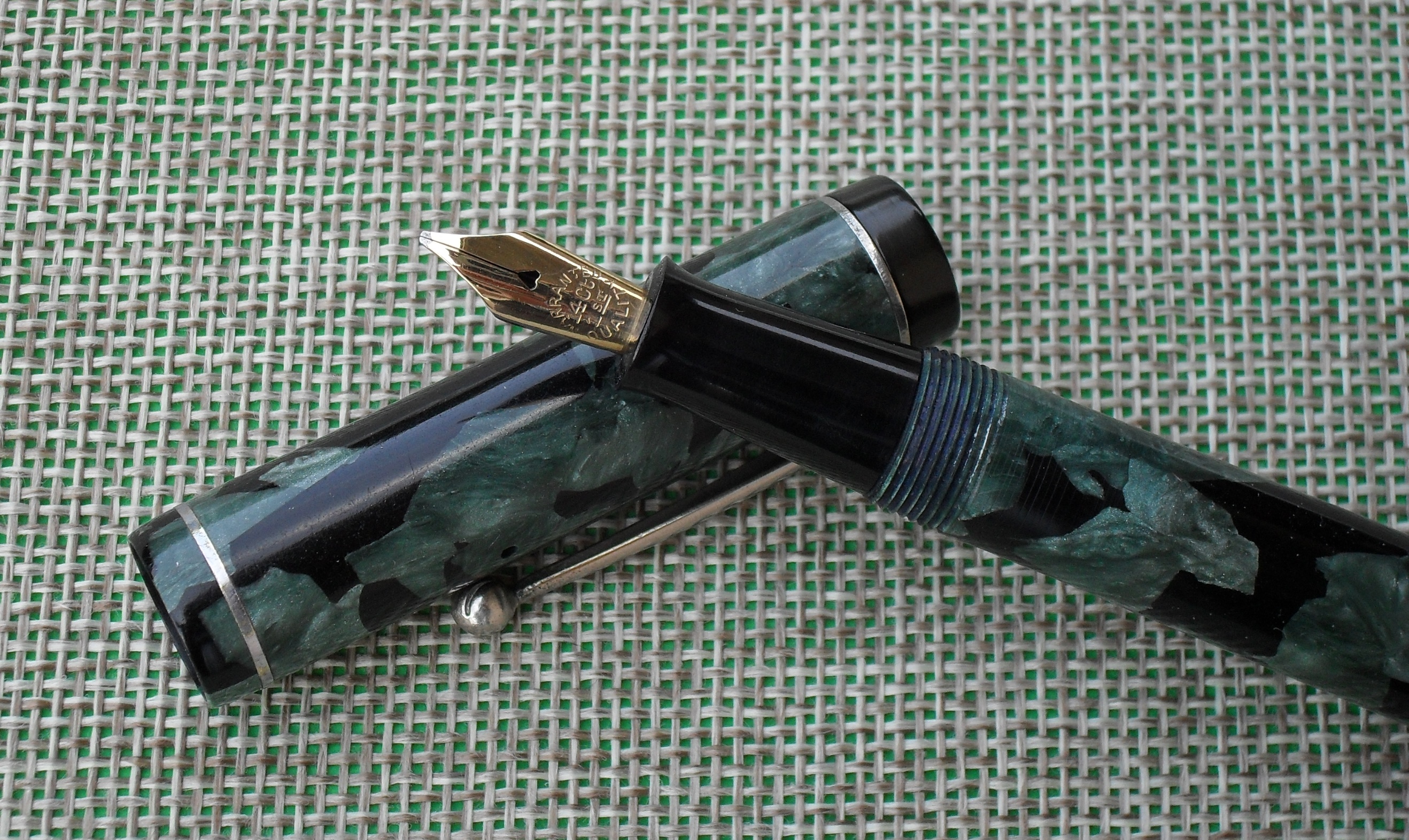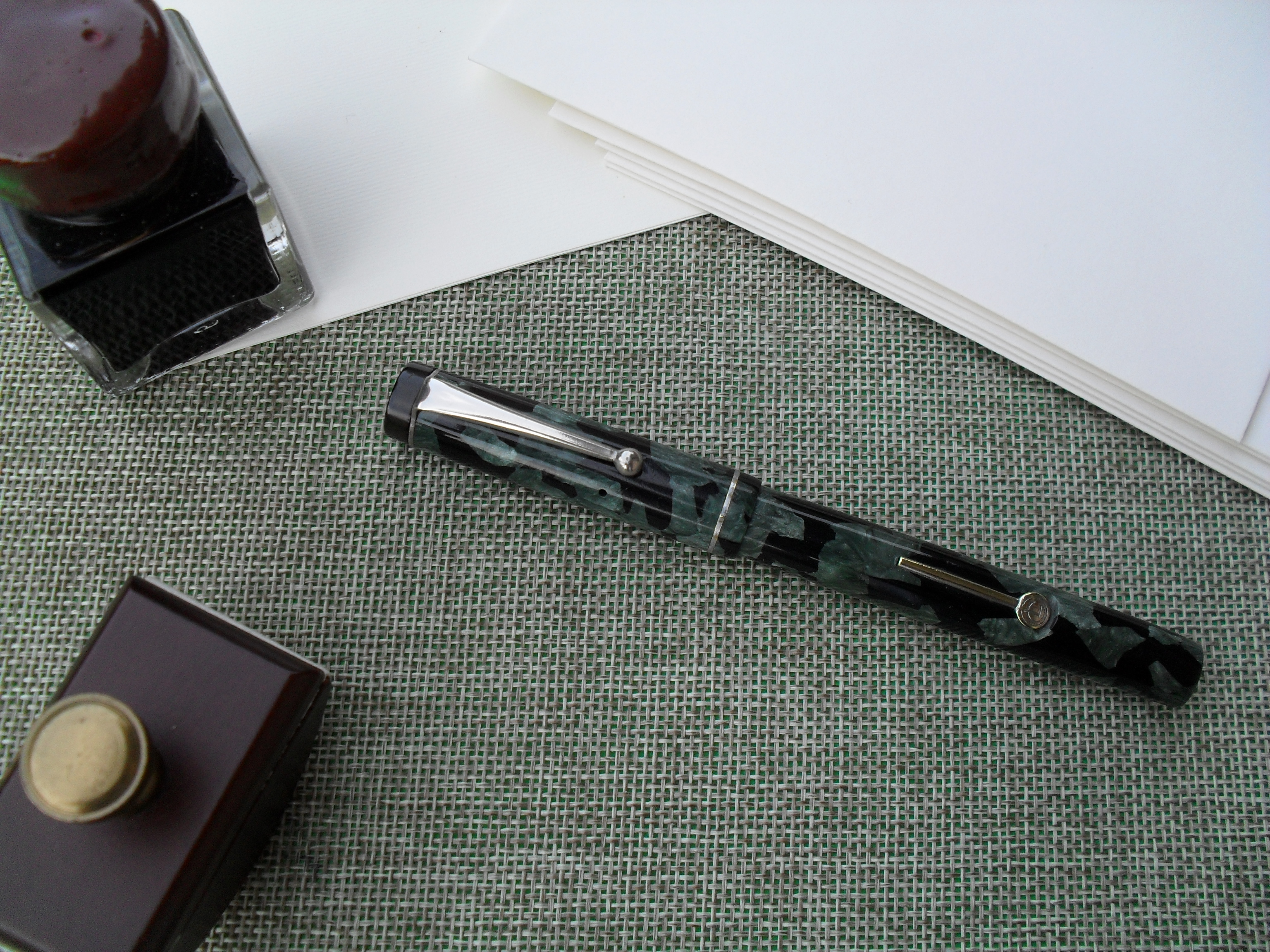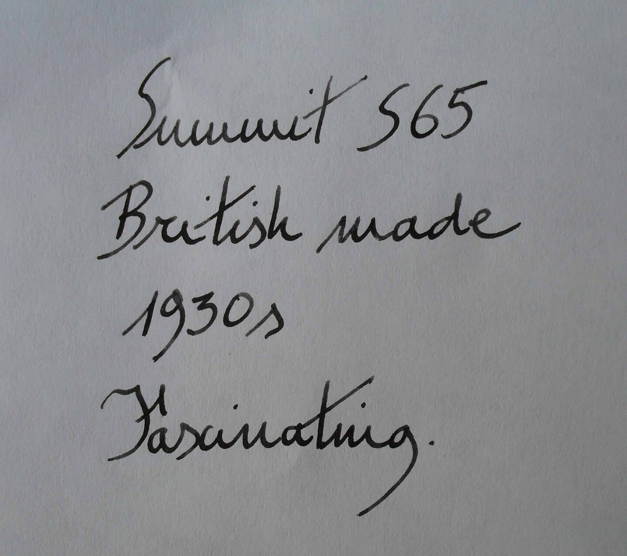 Ve la propongo in tutta la sua semplice bellezza. Come ho già avuto modo d’affermare in passato, la qualità dei prodotti Summit è sempre stata ottima e questa S.65 non fa eccezione. Fabbricata in celluloide, con sezione, alimentatore e terminale del cappuccio in ebanite, offre finiture rodiate ed un pennino d’oro a 14 carati che, pur non essendo molto grande, scrive benissimo, fattore del resto comune alla produzione di pennini inglese dell’epoca.