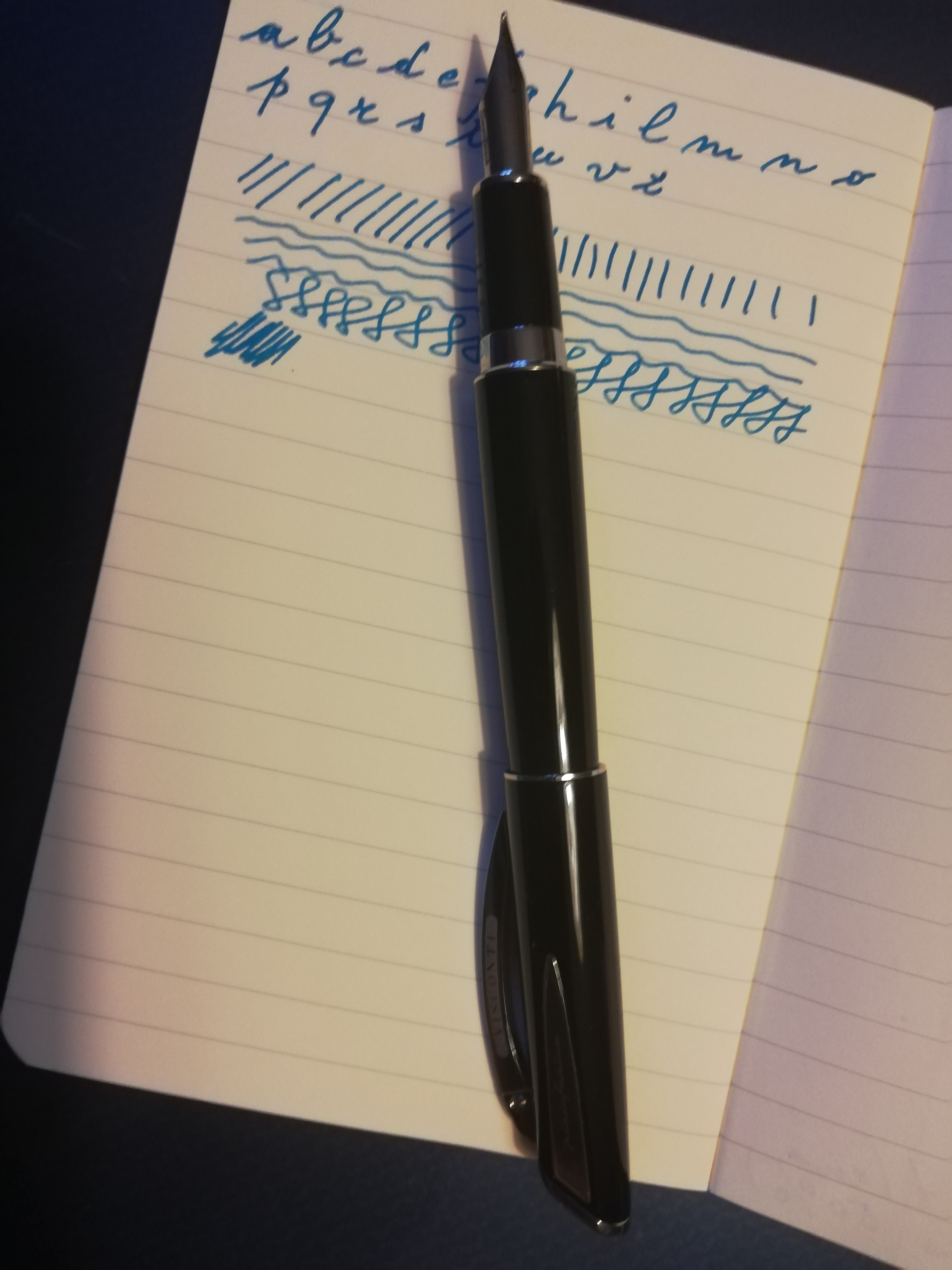 E' una penna dalle dimensioni tradizionali (vedi foto in compagnia). L'aspetto generale è piuttosto massiccio, ma il bilanciamento è ottimo e si scrive tranquillamente con il cappuccio innestato per lunghe sessioni. La chiusura è a calamita. Il caricamento è a converter (incluso). L'estetica è a discrezione, però la scorrevolezza di scrittura è eccellente. E' questo il punto di forza. L'aspetto estetico molto "techno" è di gusto personale (a mer personalmente piace).