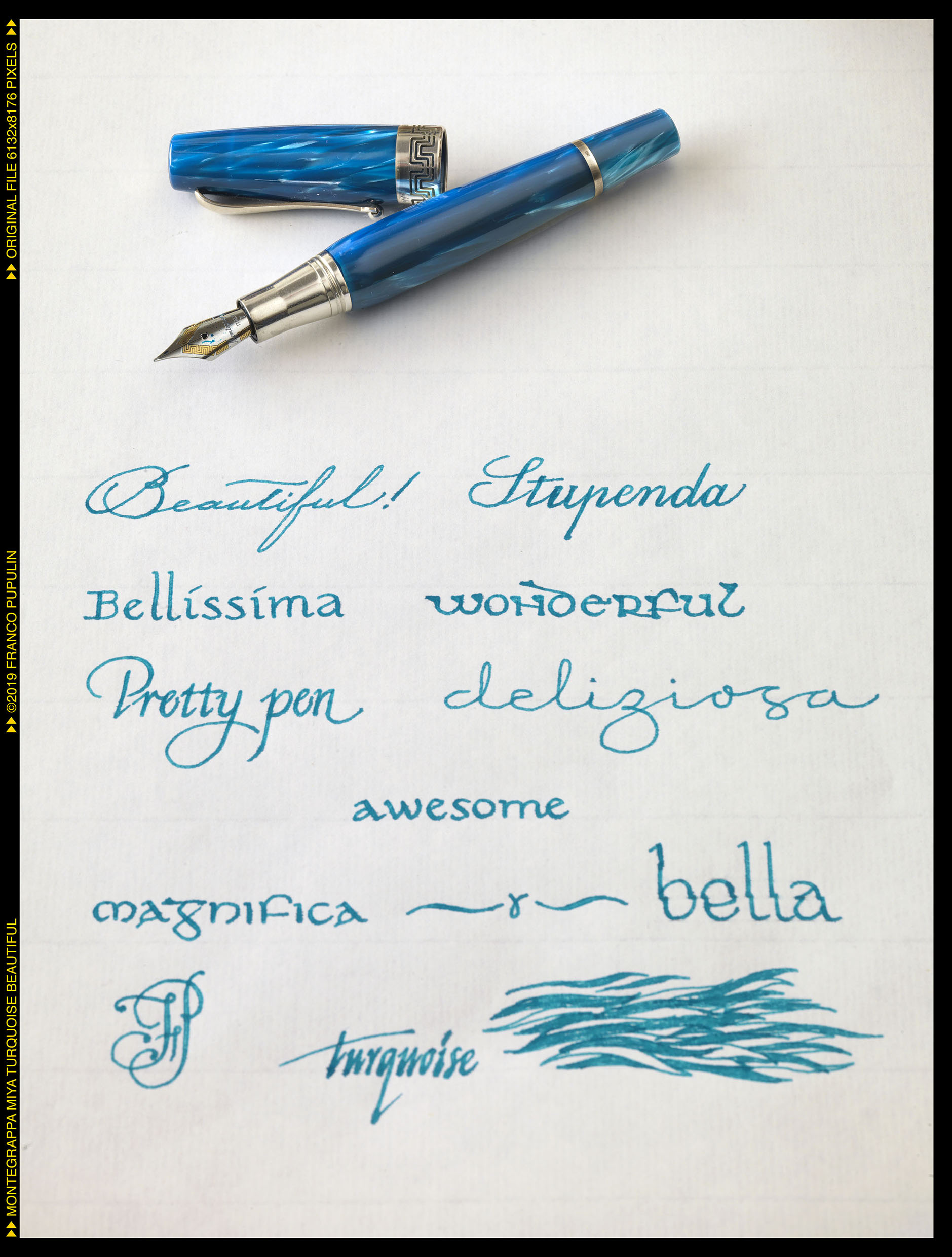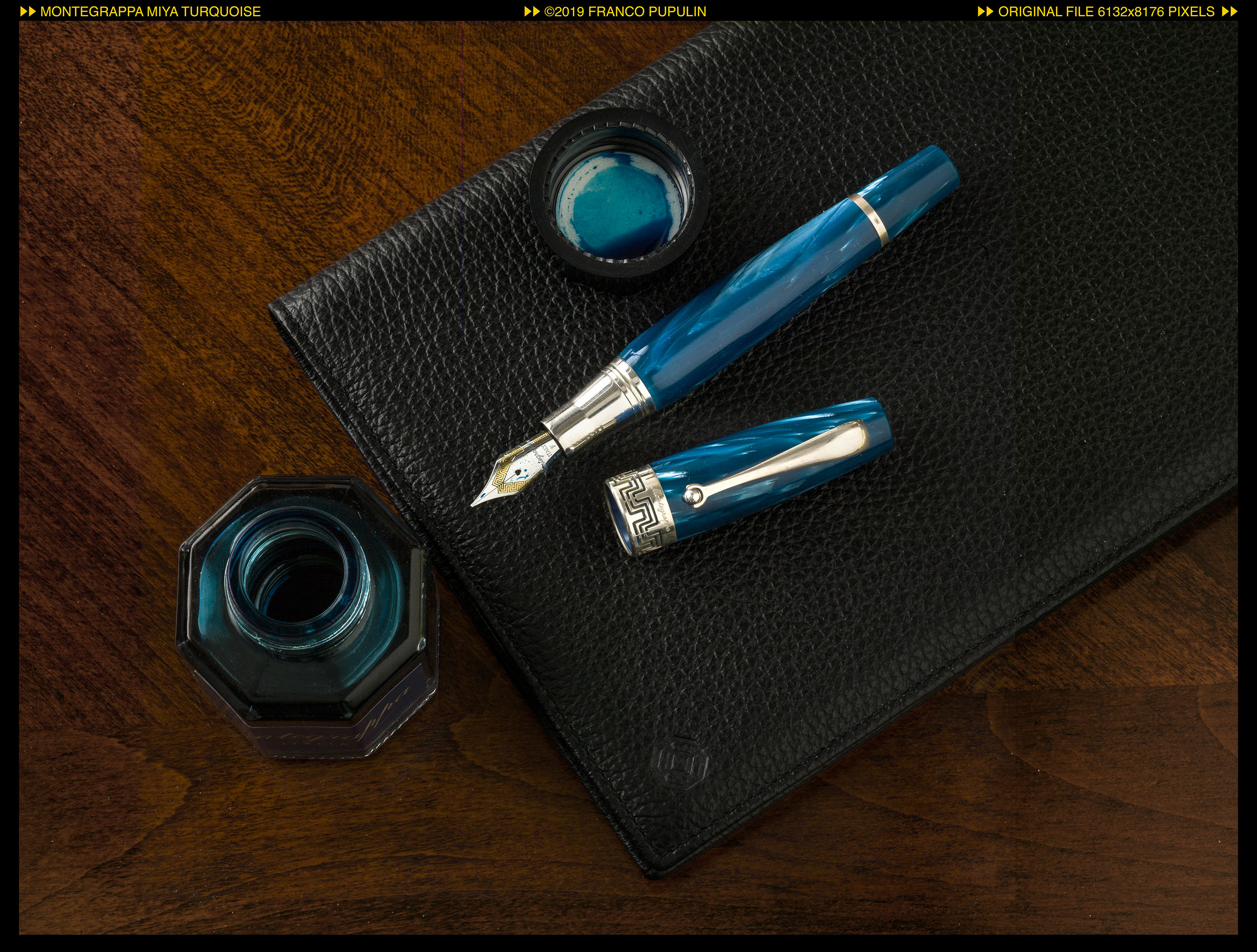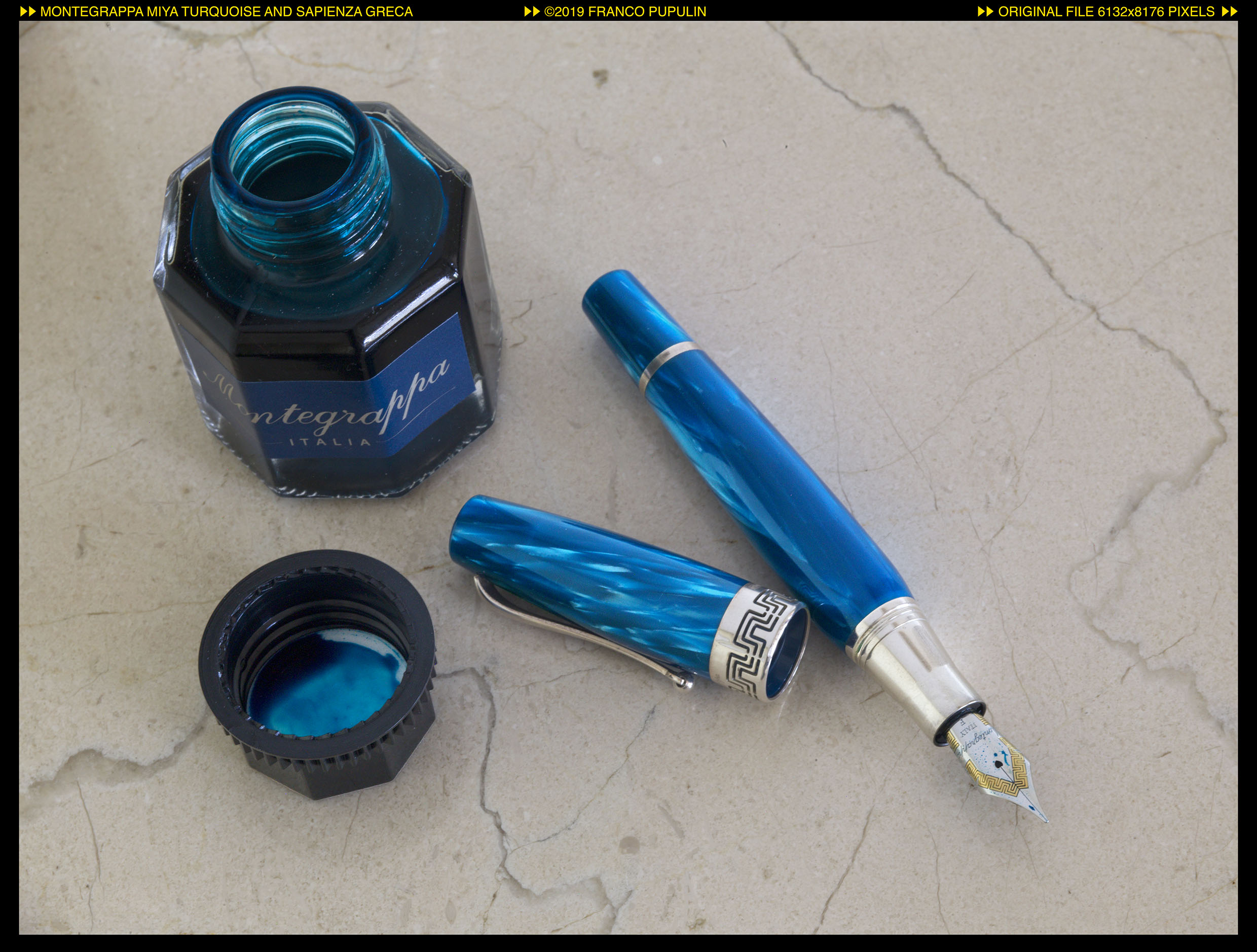 Turchese é la mia prima Miya, ma non la prima in famiglia. Mia figlia Margherita, che ne é una appassionata, ne possiede due in celluloide rossa e gialla, e una Miya Argento in celluloide turchese. Ricordo che quando la Argento arrivò, alcuni anni fa, il cappuccio originale era stato sostituito - probabilmente inavvertitamente – dal venditore con quello di una Miya Argento Blu Notte, così che l’anellino di celluloide sul cappuccio non corrispondeva al colore della penna. Fu quella la prima opportunità nella quale sperimentammo lo squisito servizio di assistenza di Montegrappa, che sostituì gratuitamente l’anello di celluloide con uno del colore corretto, su una penna ormai non più in produzione da diversi anni. L’effetto dell’anellino turchese sul cappuccio d’argento é splendido.
