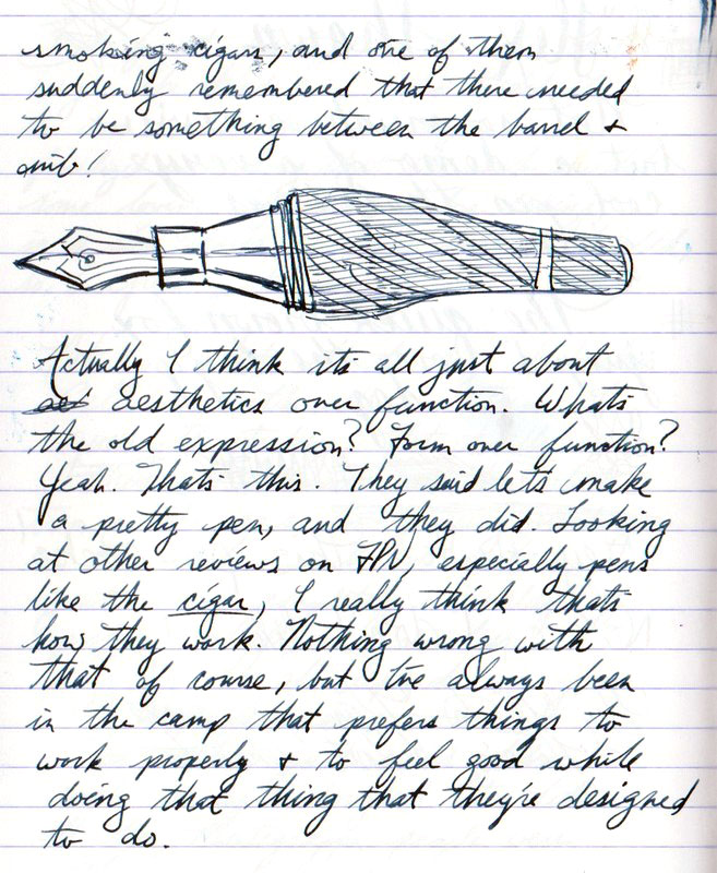 Il pennino deve essere un numero 5, e nel complesso lo trovo un po’ piccolo per le dimensioni della penna. Dal punto di vista della scrittura, peró, il mio Fine é semplicemente perfetto: educato, preciso, umido ma non incontrollato, elastico, scorrevole ma “presente”. Proprio come piace a me….