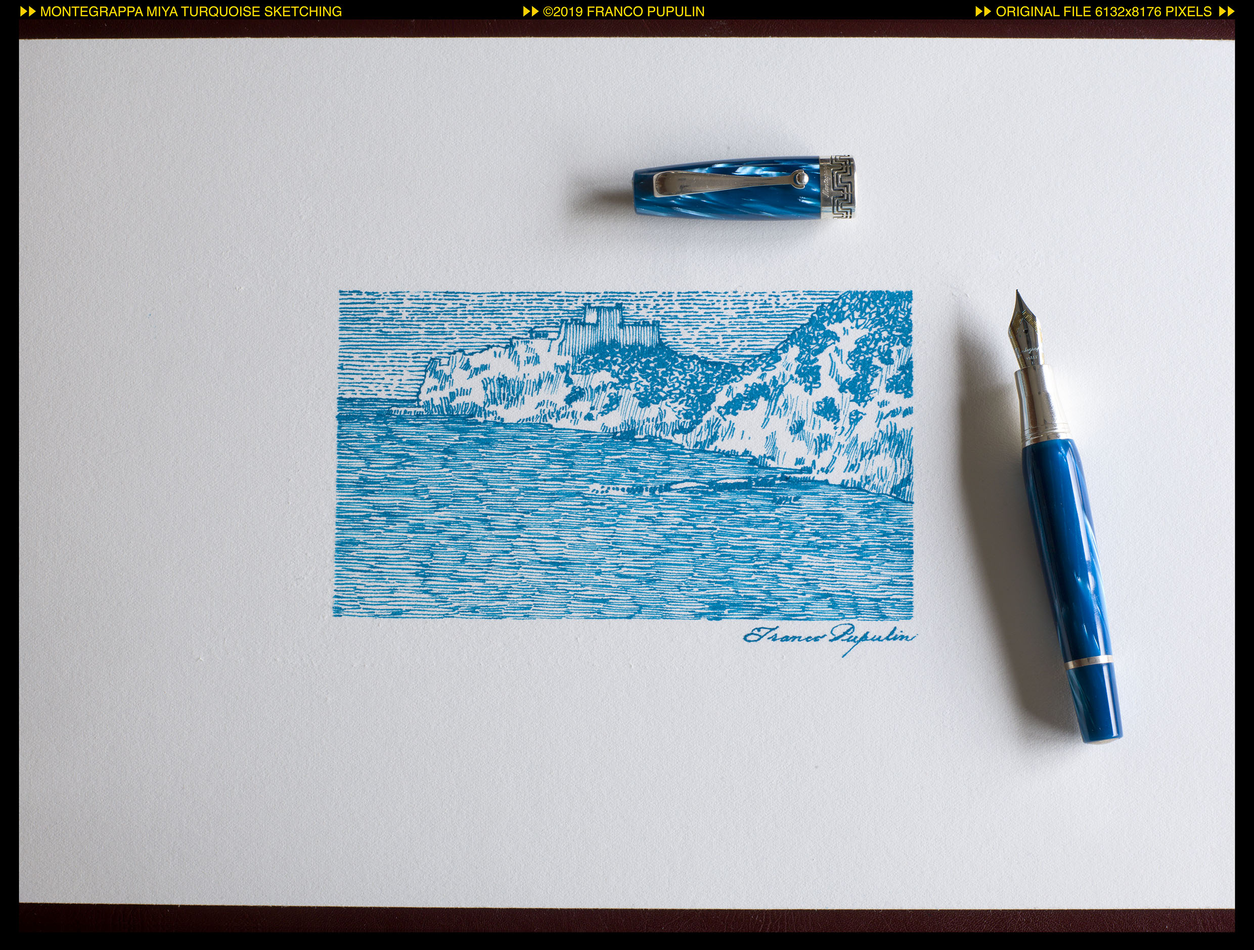 Che cos’altro avrei potuto utilizzare nella mia Turchese se non un inchiostro dedicato, di famiglia, come il Turchese di Montegrappa? E che cos’altro avrei potuto tentare, con una penna e un inchiostro di questo colore, se non una veduta marina, di un bel mare turchese?
