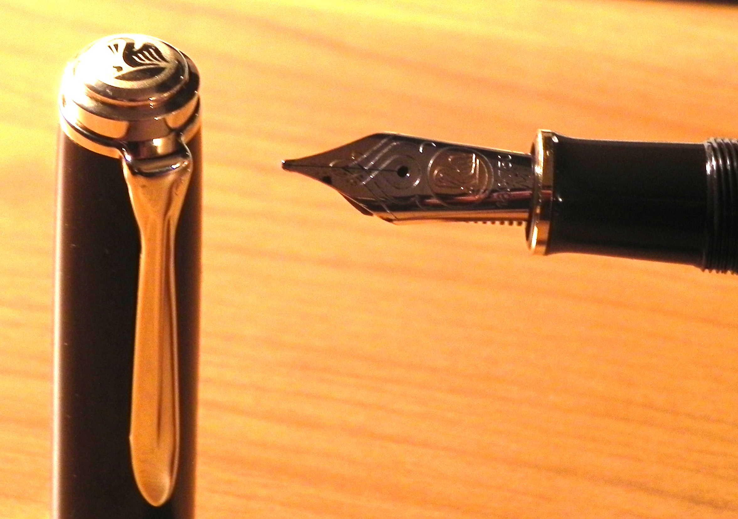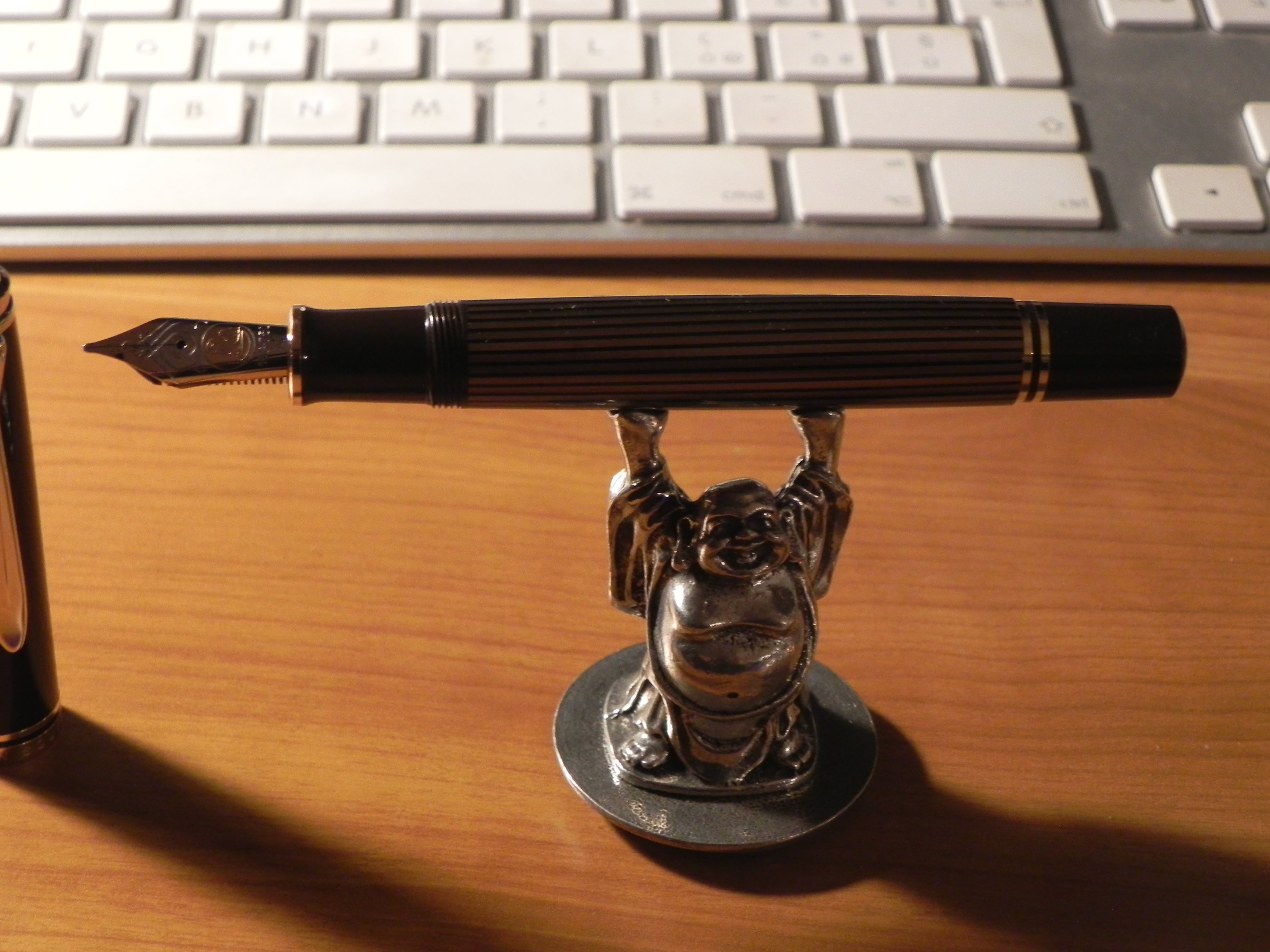 Le impressioni di scrittura sono ottime: il pennino è scorrevole in tutte le direzioni e il tratto M, seppure un po' abbondante come da tradizione della casa, non mi sembra da idrante (questo almeno su carta Rhodia e Clairfontaine che utilizzo solitamente con le Pelikan, tende invece ad allargare un po' troppo su carte più comuni come quella da fotocopie o dei quaderni scolastici Pigna). Si tratta di un pennino che io trtovo eccellente ma non adatto ad una grafia minuta. Ho anche l'impressione che il pennino monocolore rodiato della M805 Stresemann scriva un po' meglio di questo, ma non mi sento di pronunciarmi in modo troppo drastico e definitivo perché potrebbe essere che questo M abbia semplicemente bisogno di essere usato un po' di più.