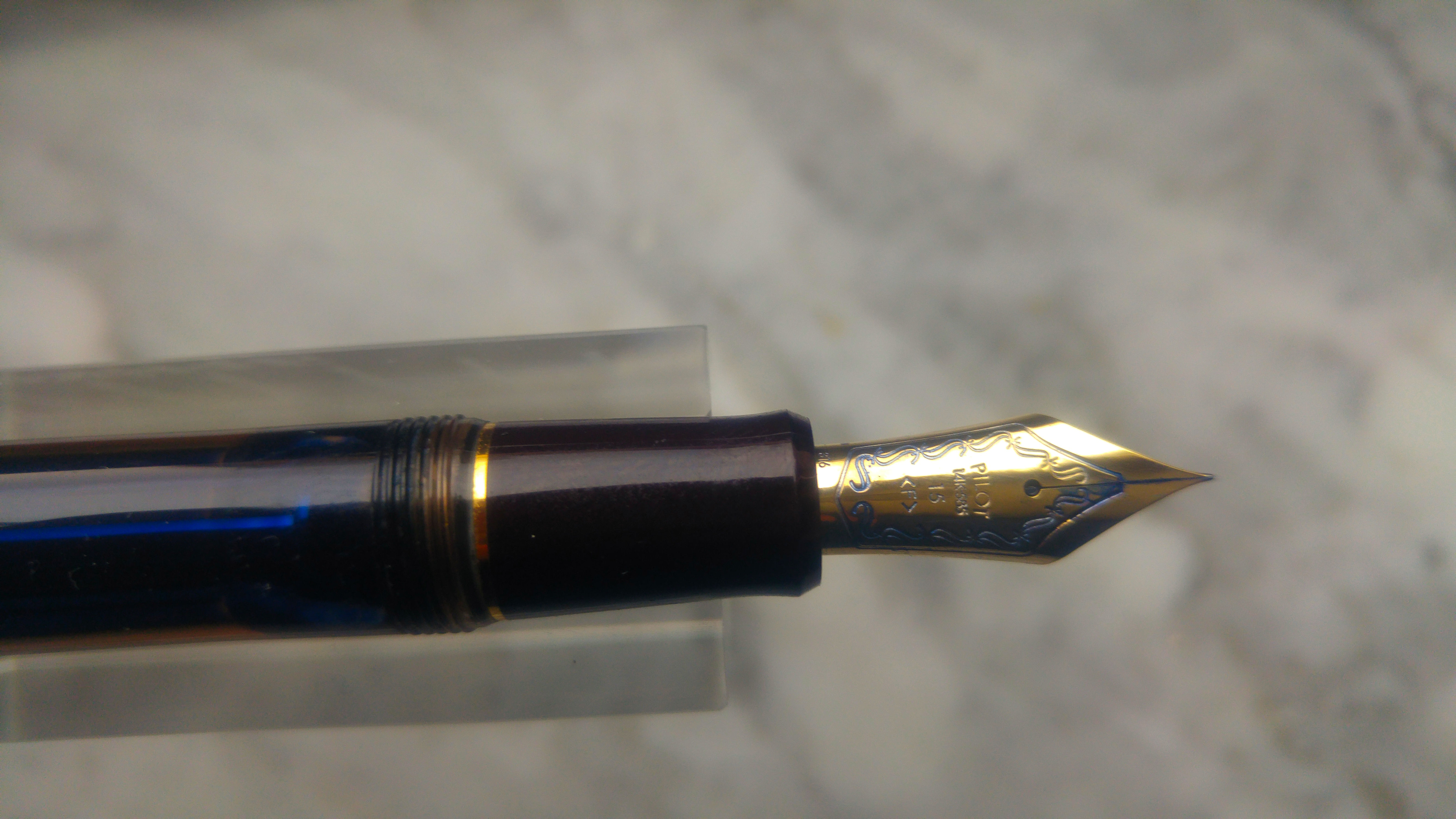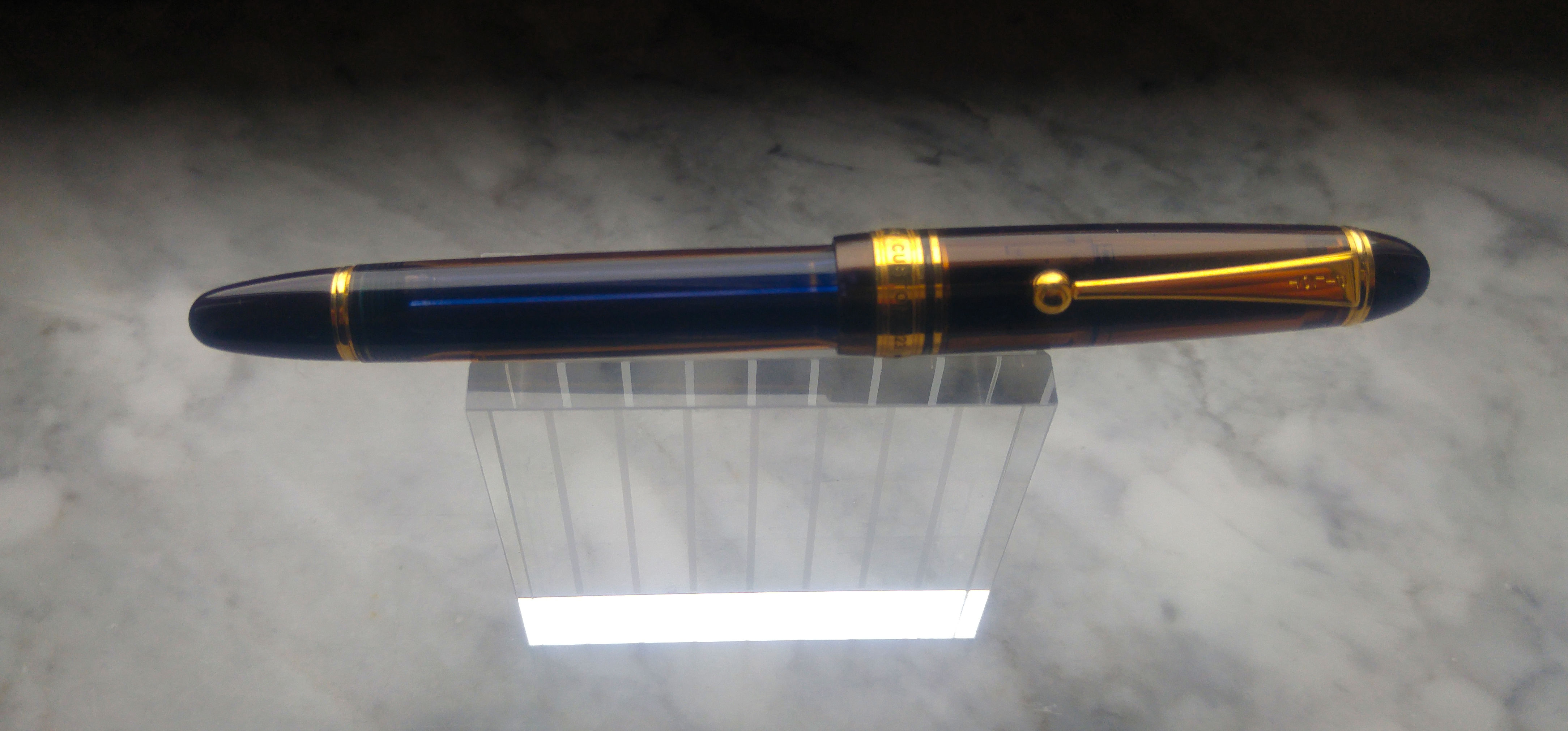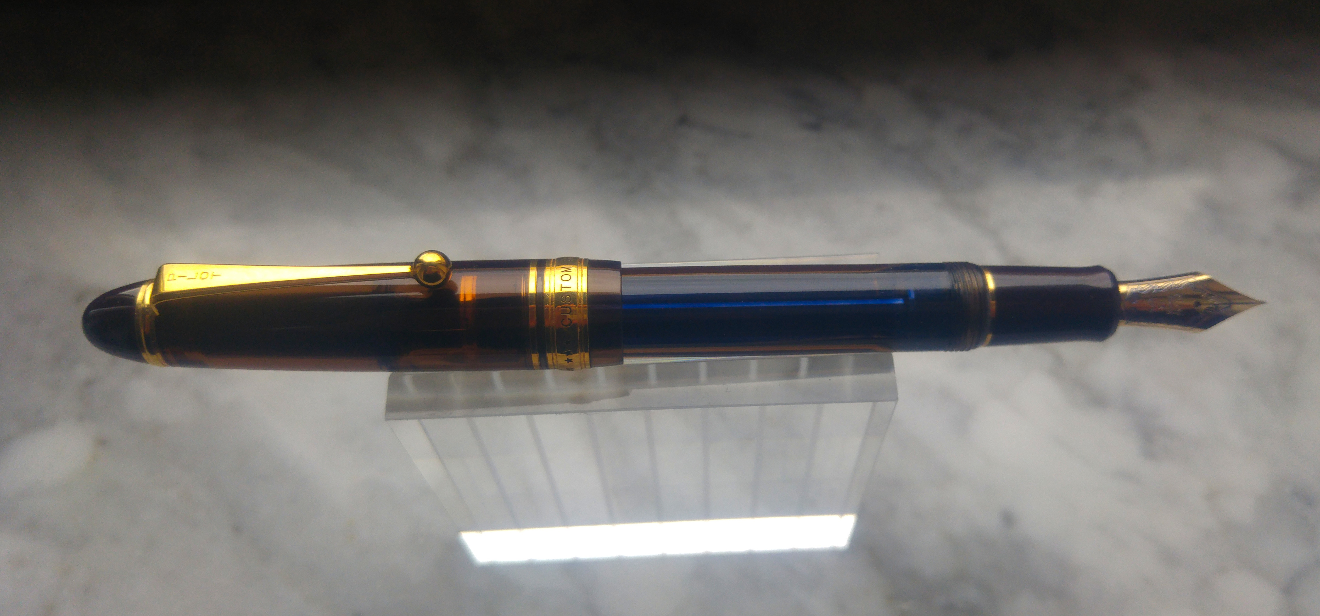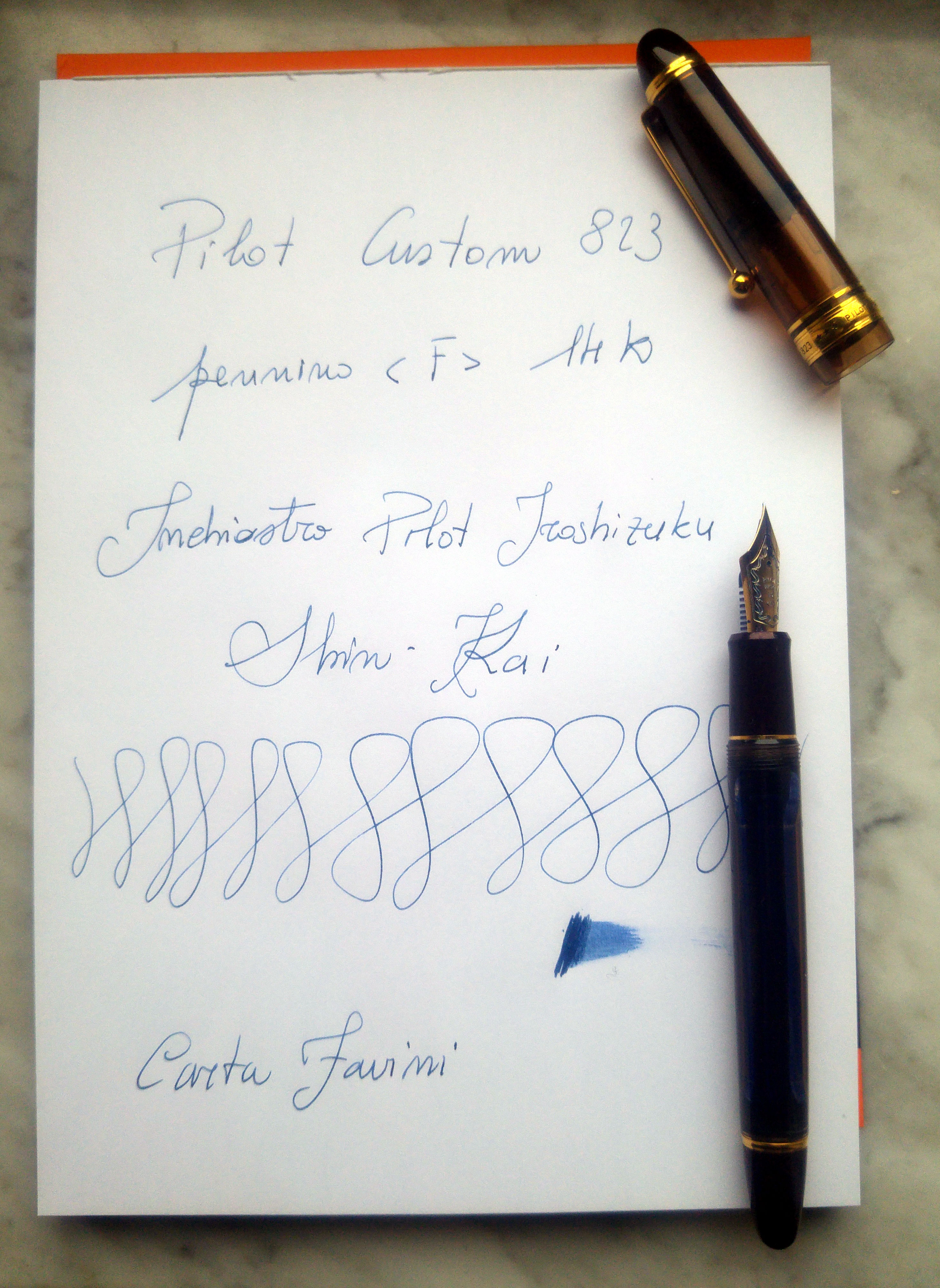 Un mesetto fa sono incappato in questa Pilot Custom 823 e viste le recensioni generalmente positive l’ho presa seppur con qualche riserva. Appena arrivata invece mi ha immediatamente colpito positivamente per la sua estetica, materiali e dimensioni. La 823 non è una penna piccola, è leggermente più lunga di una 146, penna a cui direi che i designer di Pilot si sono ispirati. La prima cosa che mi ha colpito è stato il materiale, finalmente una penna che da una sensazione di solidità ed un acrilico di una bella tonalità marrone trasparente, poi il pennino molto bello e di dimensioni generose, più grande del pennino della 146. Se proprio devo trovare un elemento estetico che non mi soddisfa in questa penna è la clip, ma questo è ovviamente un giudizio prettamente personale. La penna è una Vacuum Filler, senza l’impiego di calamai particolari sono riuscito a caricarla un po' oltre i ¾ della capacità totale del fusto, considerando che la capacità massima è di 2,5ml direi che siamo intorno ai 2ml. Il mio esemplare è dotato di pennino <F> che scrive indiscutibilmente bene, molto caratteristico l'alimentatore in plastica di colore blu. Il flusso è semplicemente perfetto e il tratto è giusto, non eccessivamente fine come ci si potrebbe aspettare da un Fine proveniente dal Sol Levante. Essendo una Vacuum Filler bisogna ricordarsi di aprire la valvola svitando il fondello per lasciar passare l’inchiostro verso la sezione, altrimenti dopo un po' si rimane a secco. Di contro, per chi viaggia in aereo garantisce che non ci siano indesiderate fuoriuscite di inchiostro a causa di sbalzi di pressione.