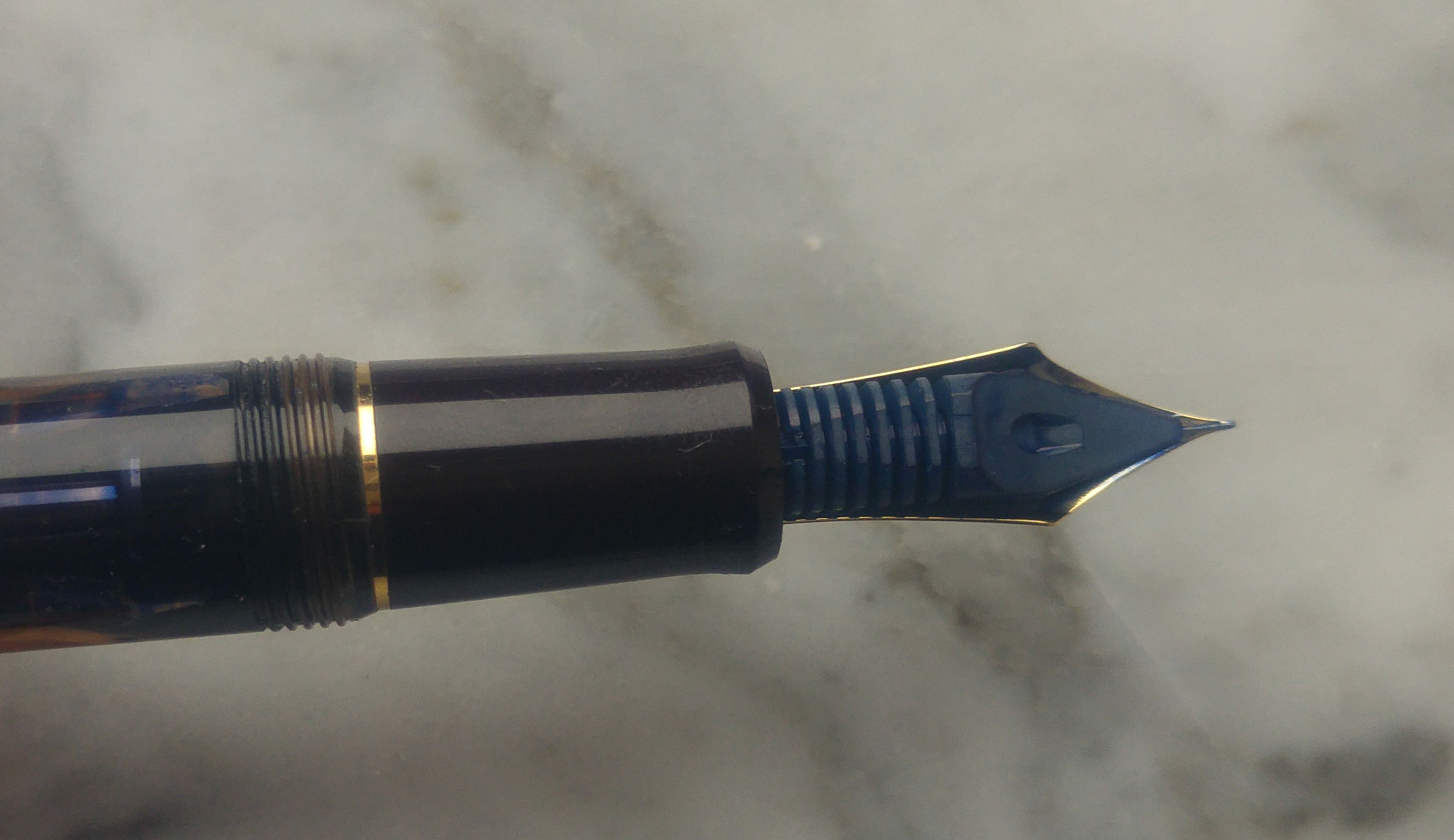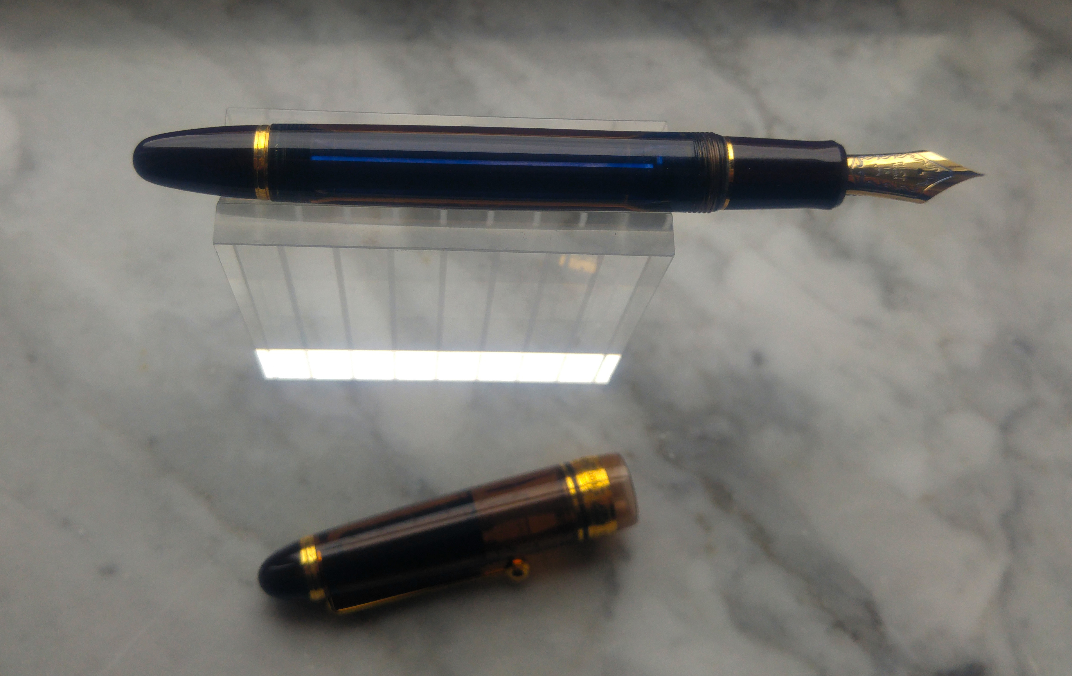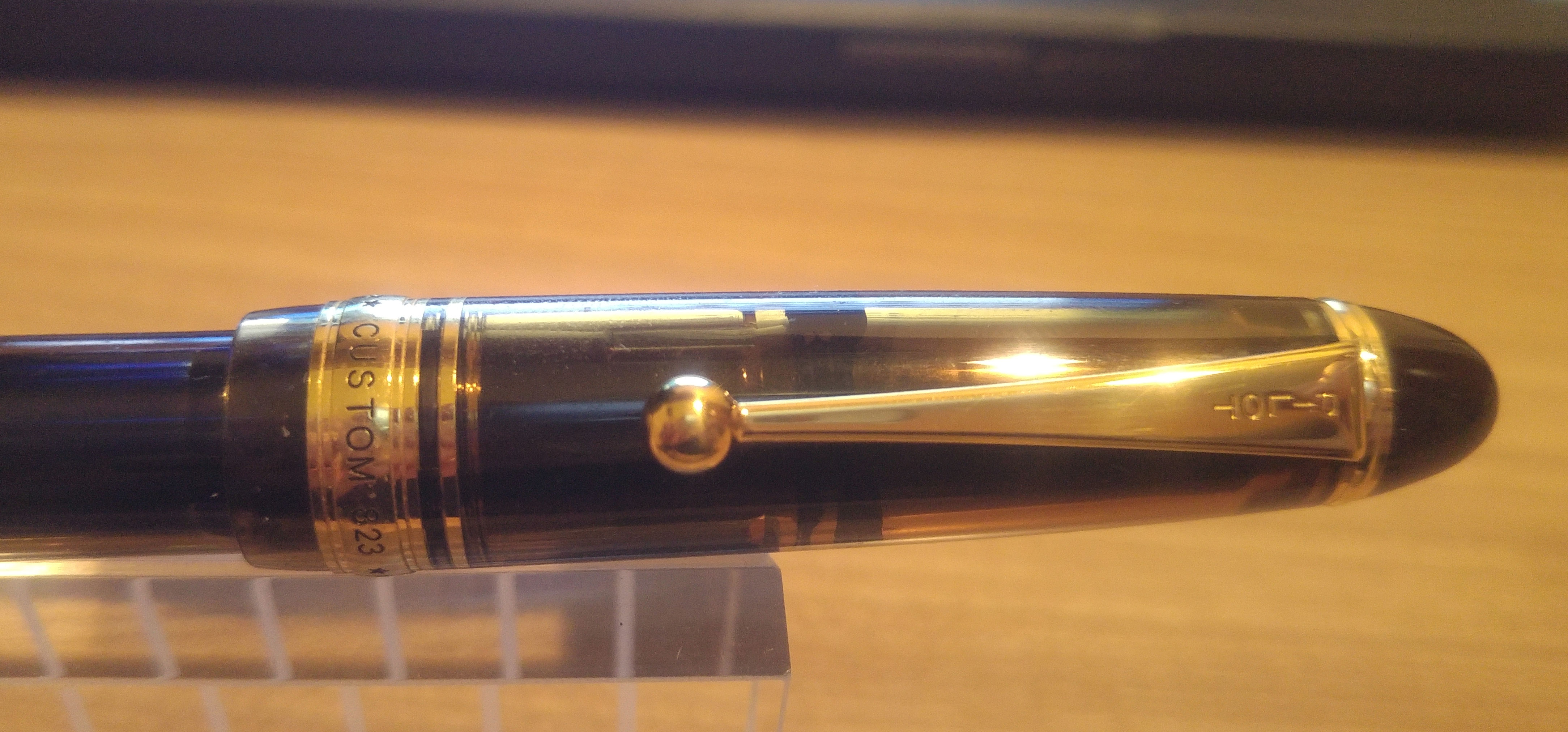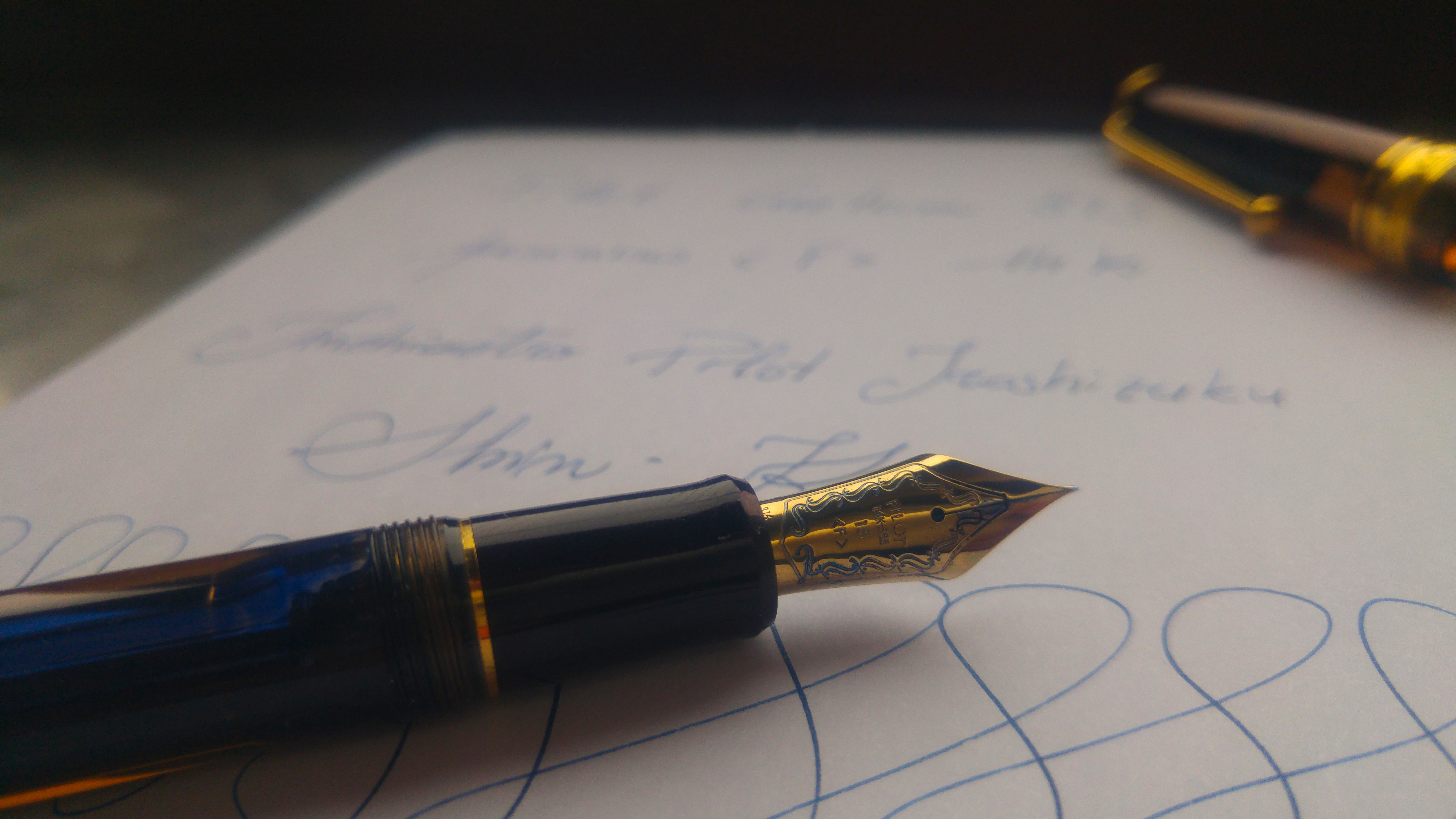 Un mesetto fa sono incappato in questa Pilot Custom 823 e viste le recensioni generalmente positive l’ho presa seppur con qualche riserva. Appena arrivata invece mi ha immediatamente colpito positivamente per la sua estetica, materiali e dimensioni. La 823 non è una penna piccola, è leggermente più lunga di una 146, penna a cui direi che i designer di Pilot si sono ispirati. La prima cosa che mi ha colpito è stato il materiale, finalmente una penna che da una sensazione di solidità ed un acrilico di una bella tonalità marrone trasparente, poi il pennino molto bello e di dimensioni generose, più grande del pennino della 146. Se proprio devo trovare un elemento estetico che non mi soddisfa in questa penna è la clip, ma questo è ovviamente un giudizio prettamente personale. La penna è una Vacuum Filler, senza l’impiego di calamai particolari sono riuscito a caricarla un po' oltre i ¾ della capacità totale del fusto, considerando che la capacità massima è di 2,5ml direi che siamo intorno ai 2ml. Il mio esemplare è dotato di pennino <F> che scrive indiscutibilmente bene, molto caratteristico l'alimentatore in plastica di colore blu. Il flusso è semplicemente perfetto e il tratto è giusto, non eccessivamente fine come ci si potrebbe aspettare da un Fine proveniente dal Sol Levante. Essendo una Vacuum Filler bisogna ricordarsi di aprire la valvola svitando il fondello per lasciar passare l’inchiostro verso la sezione, altrimenti dopo un po' si rimane a secco. Di contro, per chi viaggia in aereo garantisce che non ci siano indesiderate fuoriuscite di inchiostro a causa di sbalzi di pressione.