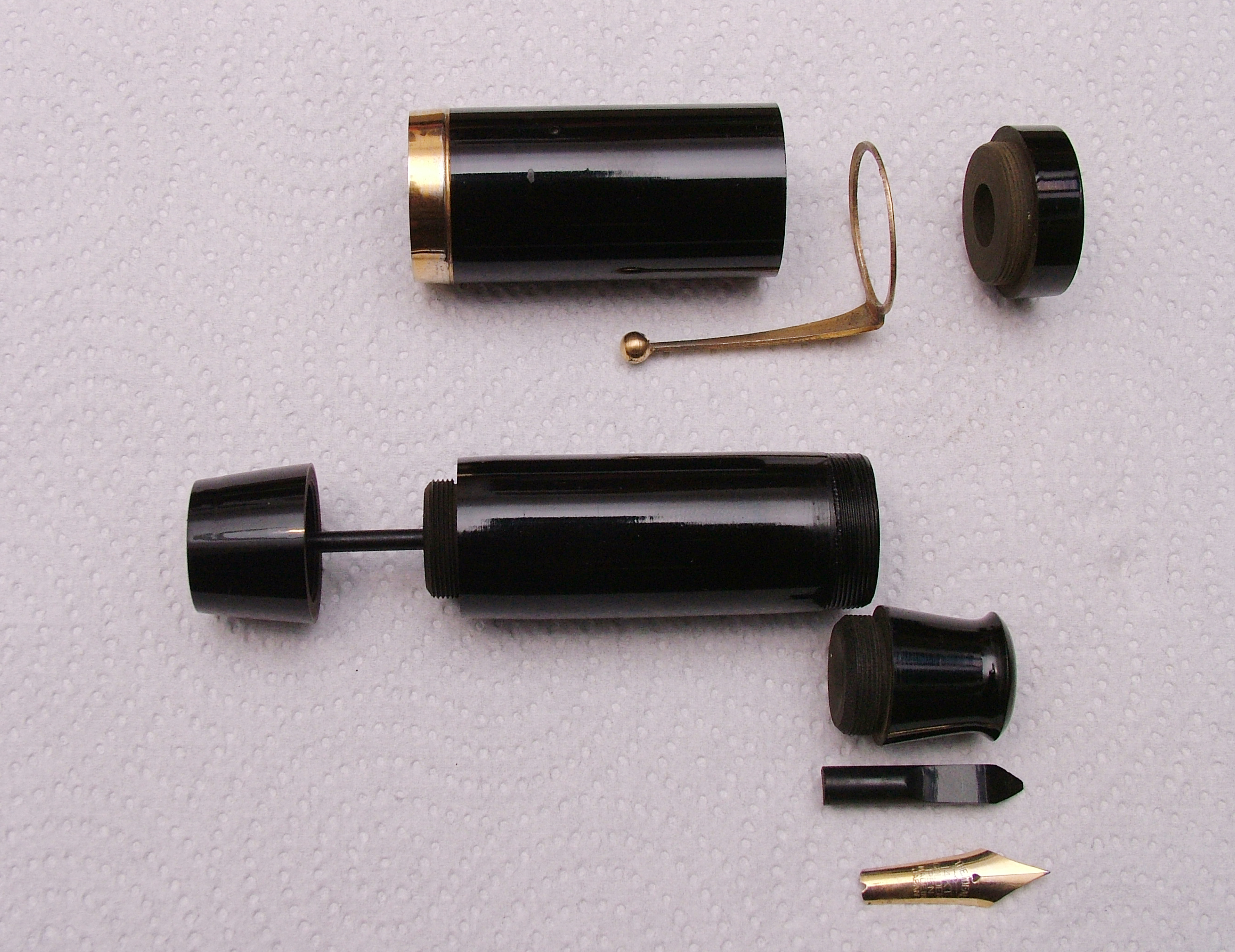 Il sistema di caricamento è a “contagocce di sicurezza” tipico delle stilografiche giapponesi fino agli anni ’30 cosa che mi fa pensare che sia di quegli anni. Per poterla caricare bisogna svitare la sezione e con un contagocce inserire l’inchiostro nel serbatoio. Molto curioso questo sistema di alimentazione: per poter usare la stilografica bisogna svitare il fondello ed alzare leggermente l’alberino ad esso collegato in modo da scostare il pistoncino dalla sezione permettendo così l’afflusso dell’inchiostro al pennino.