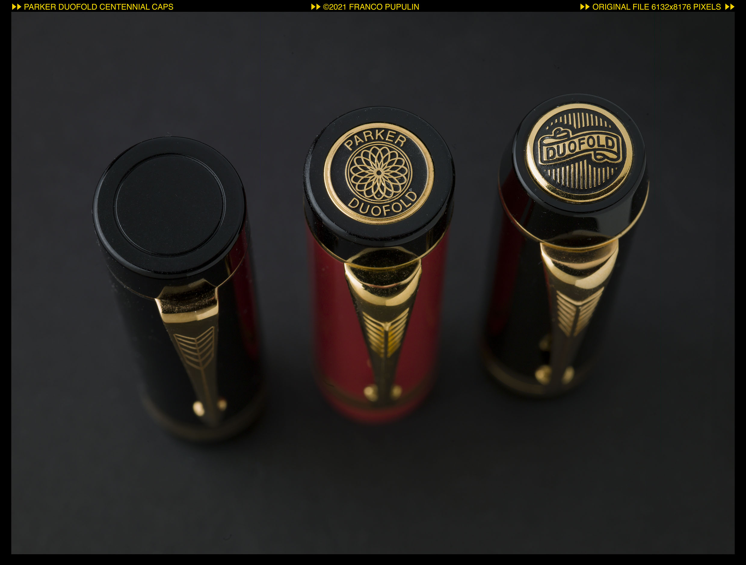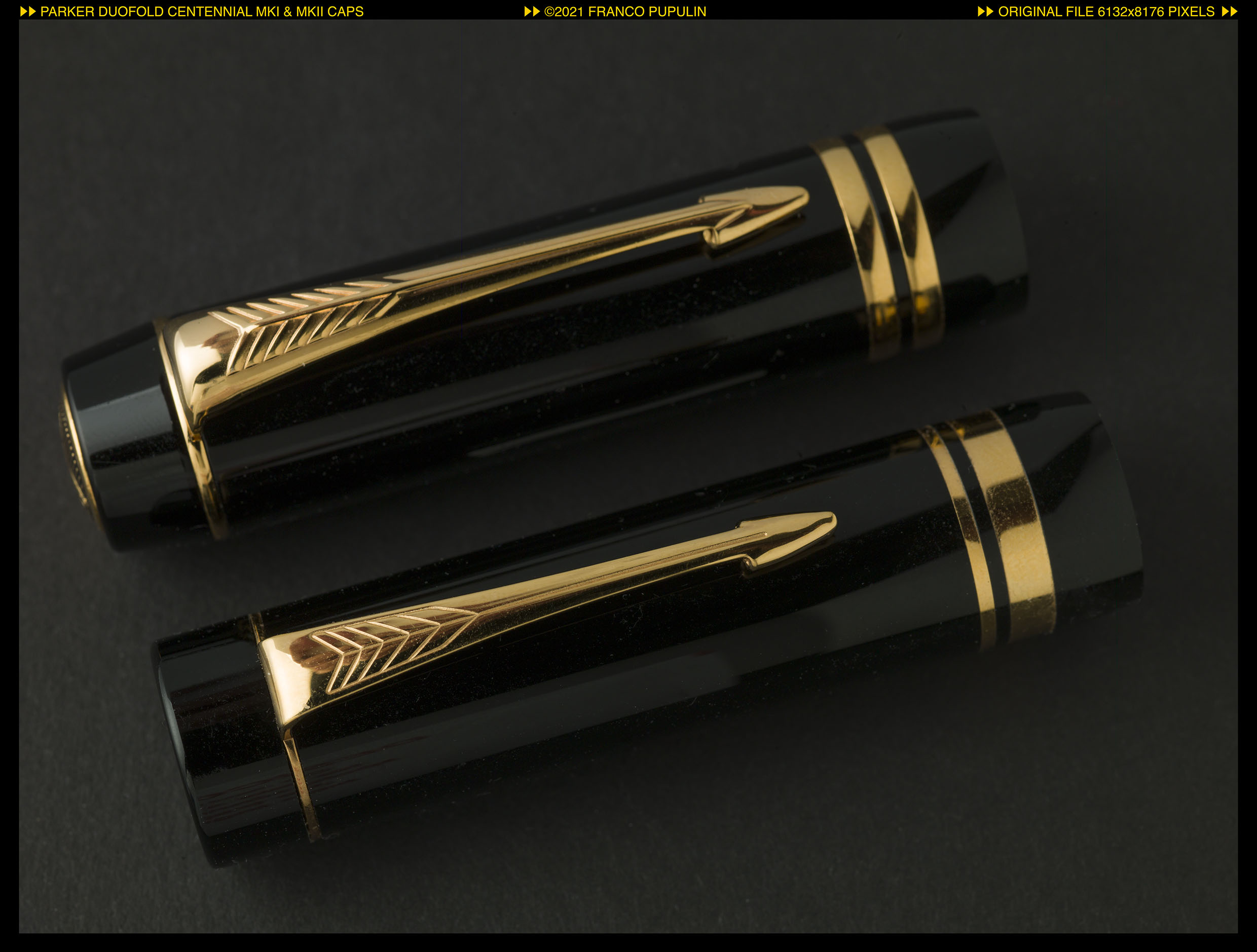 Il terminale cilindrico del cappuccio della prima Centennial é senza dubbio più “true to the original”, la Duofold degli anni’20, ma in quest’ultima il terminale era realmente piatto (per questo il modello era anche definito flat top), mentre nella Centennial MKI presenta un leggero affossamento circolare, che lascia pensare sia stato disegnato per inserirvi qualcosa. Di fatto, siccome fu in realtà commercializzato “nudo”, dà effettivamente l’impressione che sulla cima del cappuccio manchi qualcosa. Giá con la presentazione della Orange Special Edition nel 1990 questa mancanza fu ovviata inserendo sulla sommità del cappuccio un piccolo medaglione metallico, con un disegno storico della marca Parker (il Duofold Pendulum). Da allora il medaglione fu conservato, e la MKII presenta sulla sommità del cappuccio un motivo dorato con un cartiglio e il nome Duofold (il Duofold banner). Questo medaglione completa la penna e le conferisce un disegno più organico e con miglior finitura.