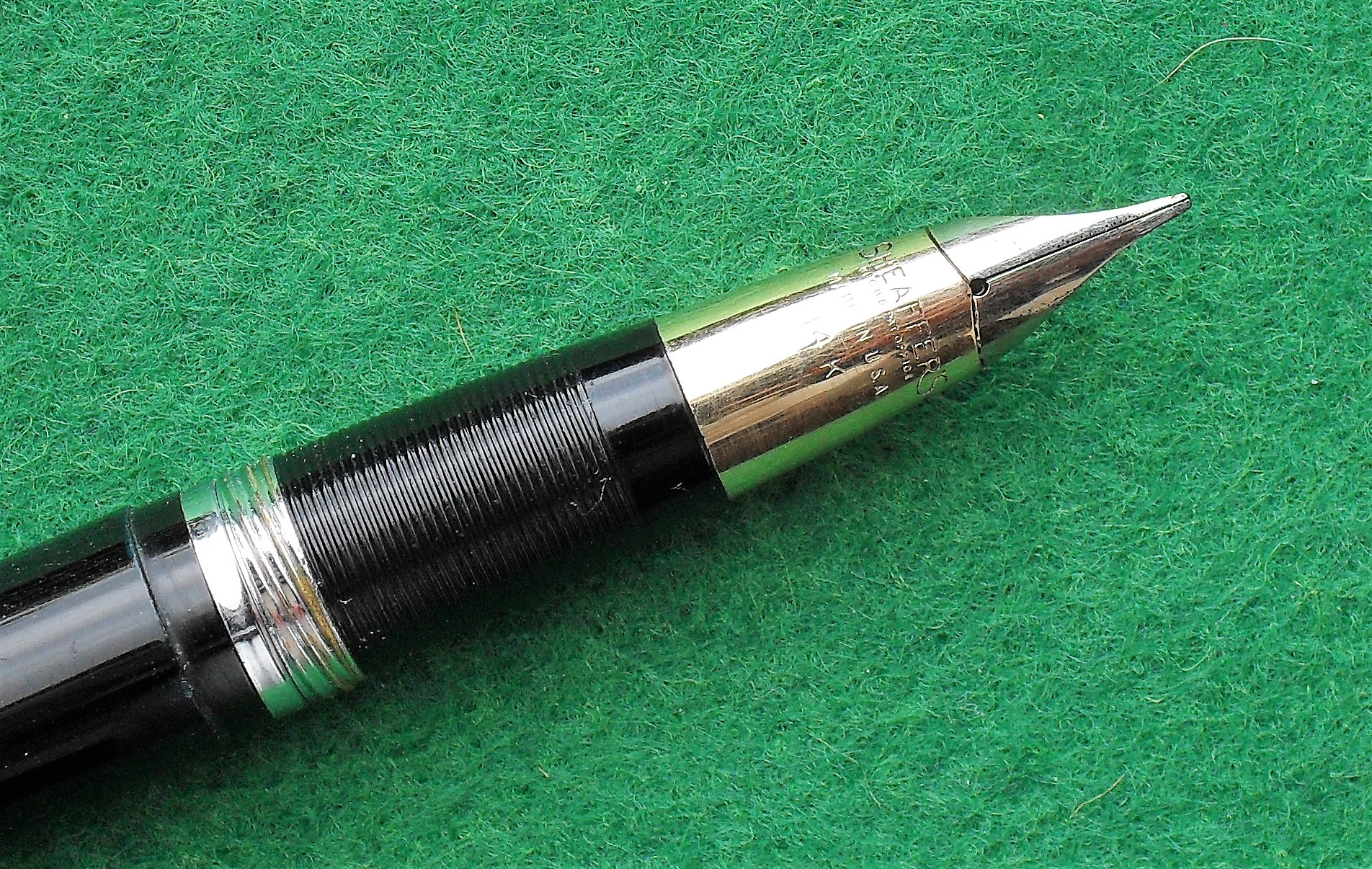 Il pennino Triumph visse un revival fra il 1989 ed il 1998, quando Sheaffer offrì la nuova stilografica “Crest”. La Valiant che vedete fu prodotta prima del 1958, anno nel quale Sheaffer’S cessò di marchiare i pennini “Triumph” con i codici relativi. La sigla “M5” dichiara un pennino d’oro a 14 carati di punta media, con “maschera” anteriore rivestita in palladio.