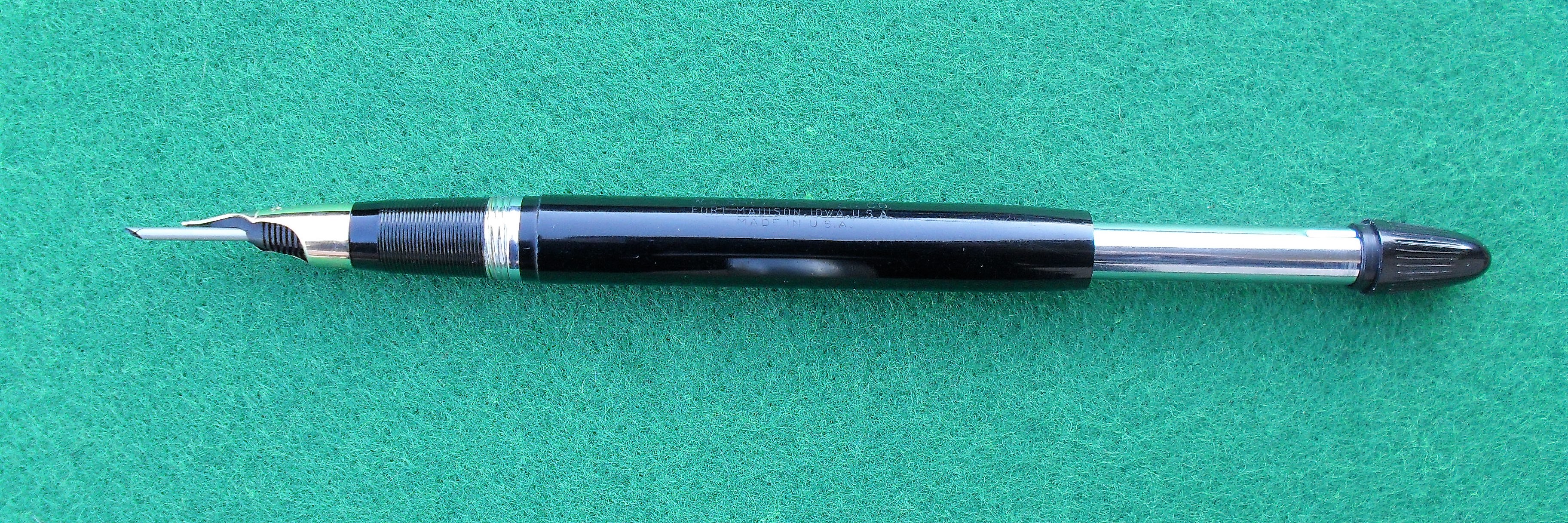 Curiosa l’incisione, sopra le classiche scritte relative al produttore, del monogramma “AN”, immagino relative al proprietario, ma, diversamente da quanto accade comunemente in questi casi, con caratteri molto simili a quelli dell’incisione standard, sia per tipologia sia per dimensione. Il cappuccio si chiude in un giro completo e non ha fori d’aereazione. La clip è fissa, molto resistente e di disegno coerente con la forma della penna, oltre che con lo stile in voga al tempo. Anche oggi, mantiene la sua eleganza, grazie anche alla sua sobrietà.