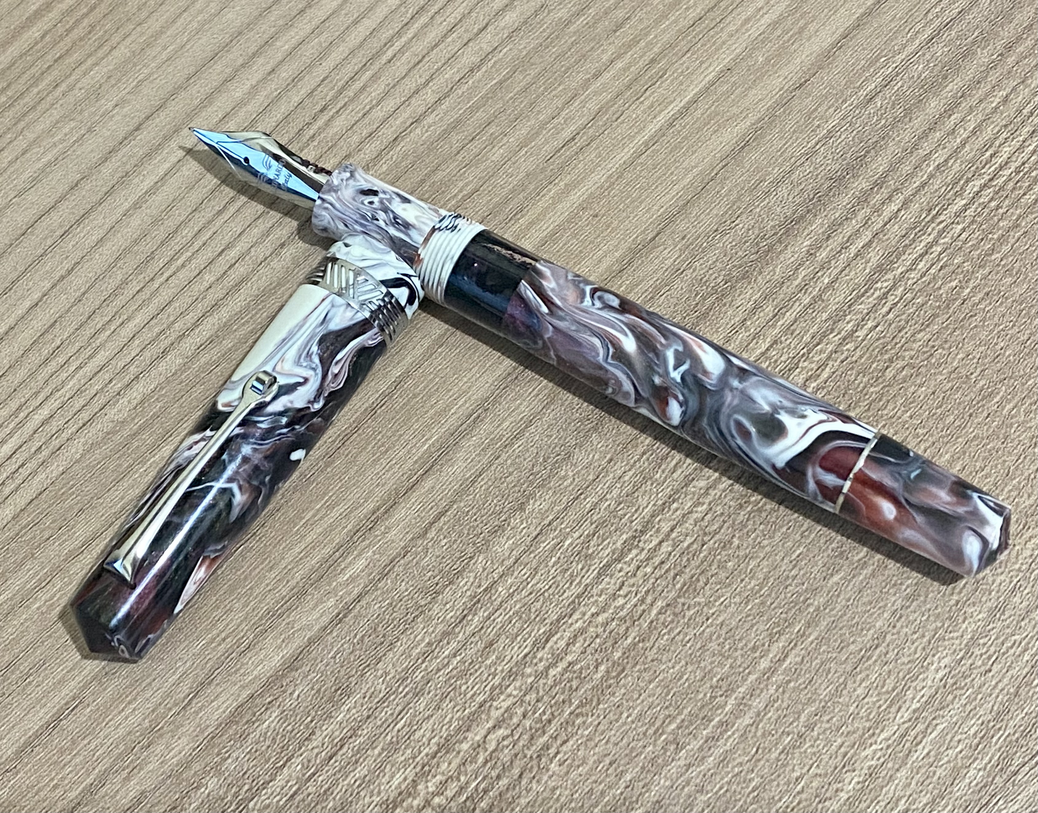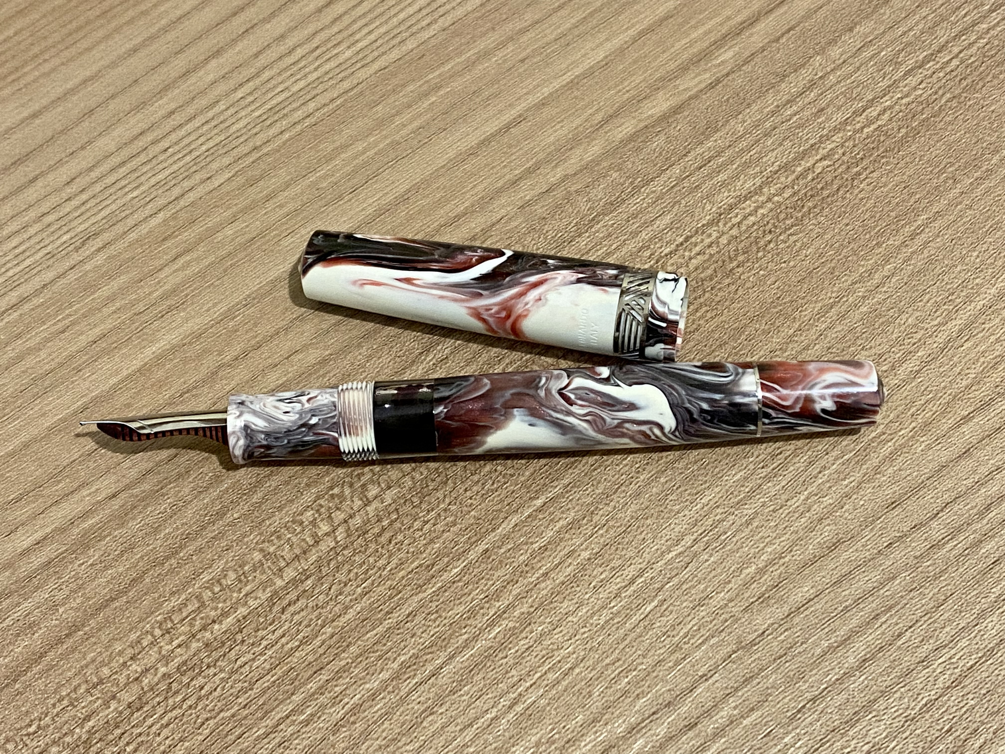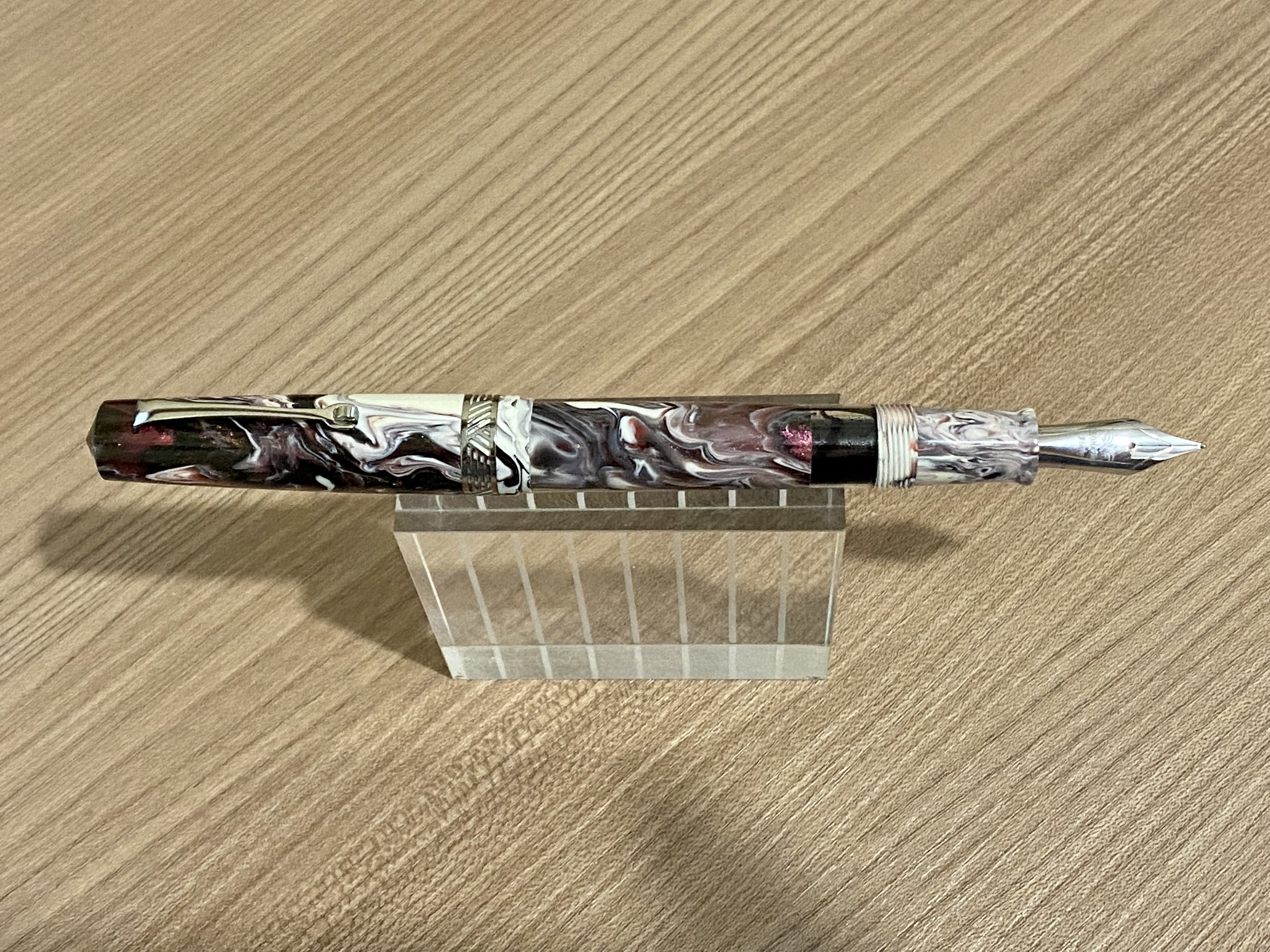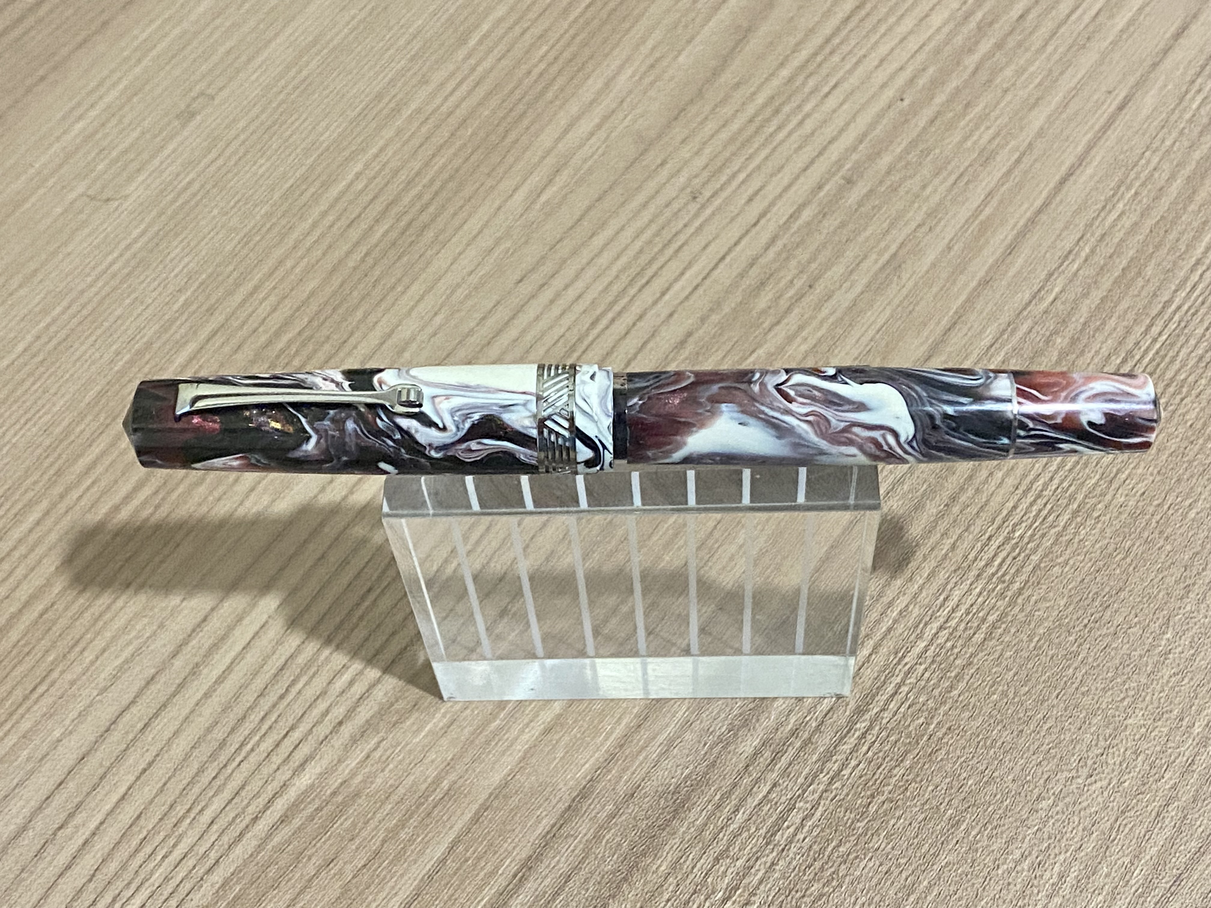 Una penna realizzata con una delle più belle resine finora viste, una resina che per la prima volta mi ha fatto apprezzare due cose che non sono nelle mie corde, le finiture rodiate e il bianco su una penna; penne artigianali al 100% perché tutte realizzate al tornio parallelo da Ciro Matrone a differenza della produzione standard dove le parti in resina/celluloide sono tornite su macchine CNC (per chi fosse all'oscuro Ciro Matrone è il fondatore di Delta e padre di Salvatore fondatore di Leonardo Officina Italiana), numero limitato ad una ventina, conduttore in ebanite rossa fatto in casa e con la chicca di essere stato anche lucidato.