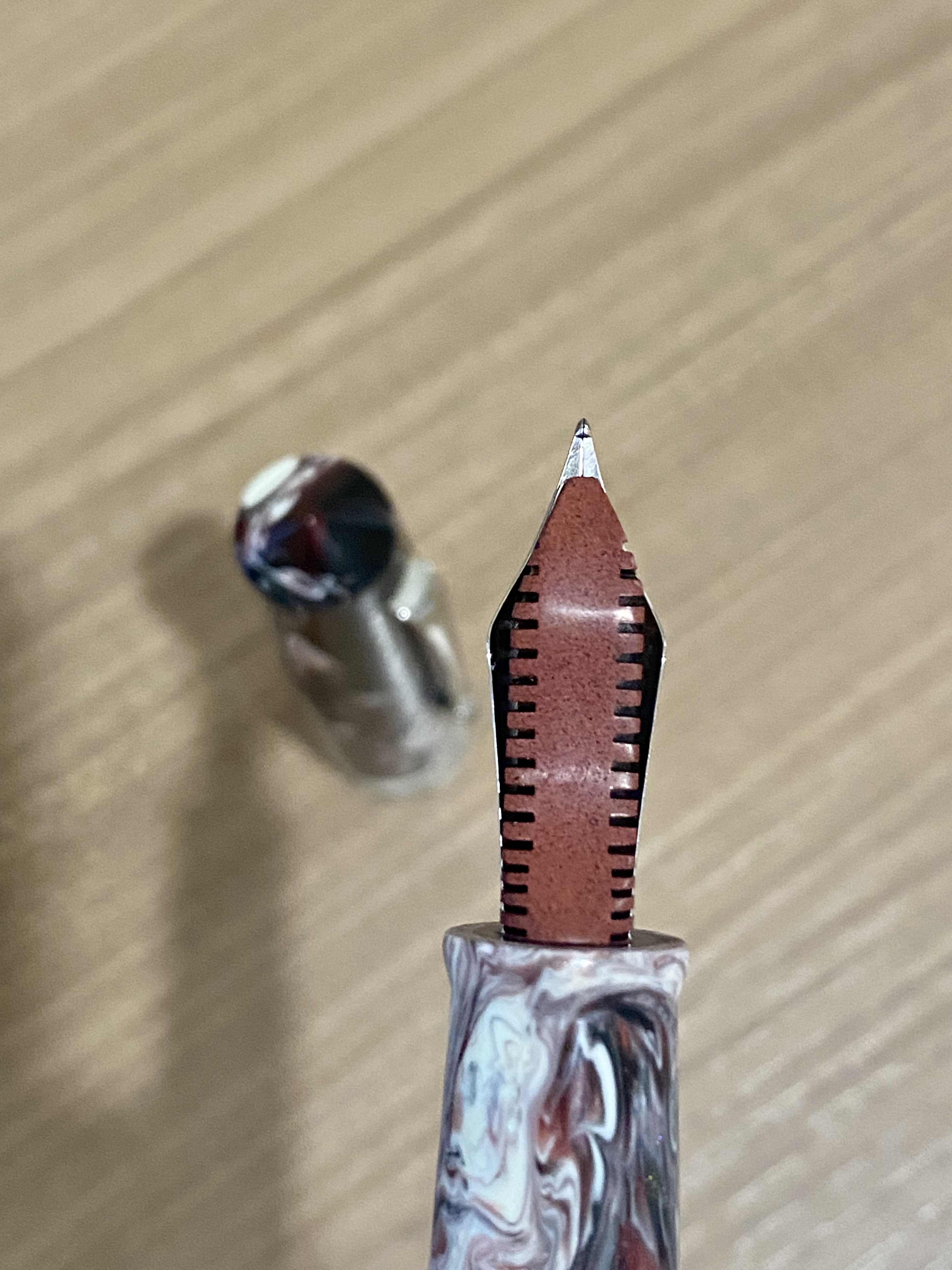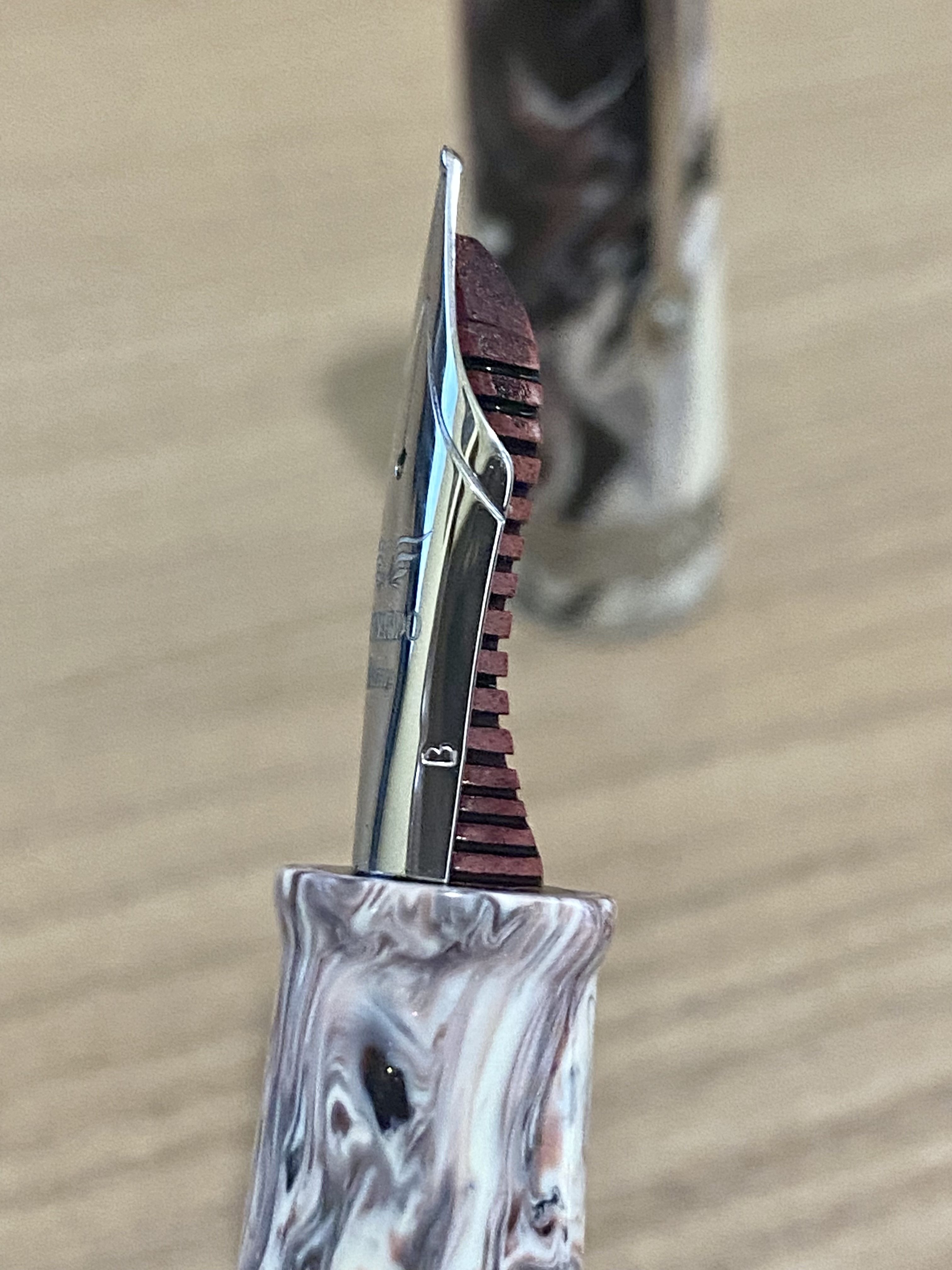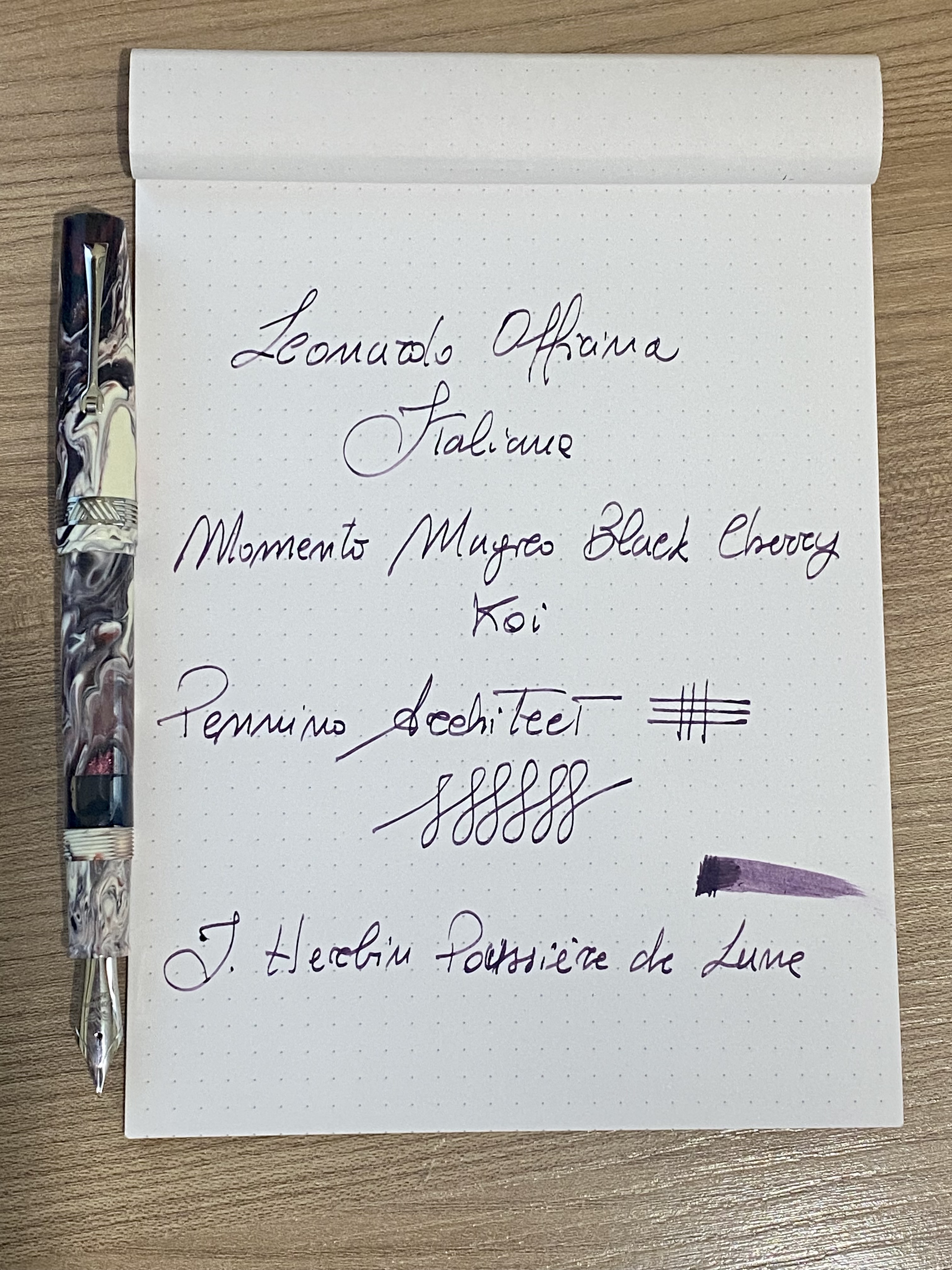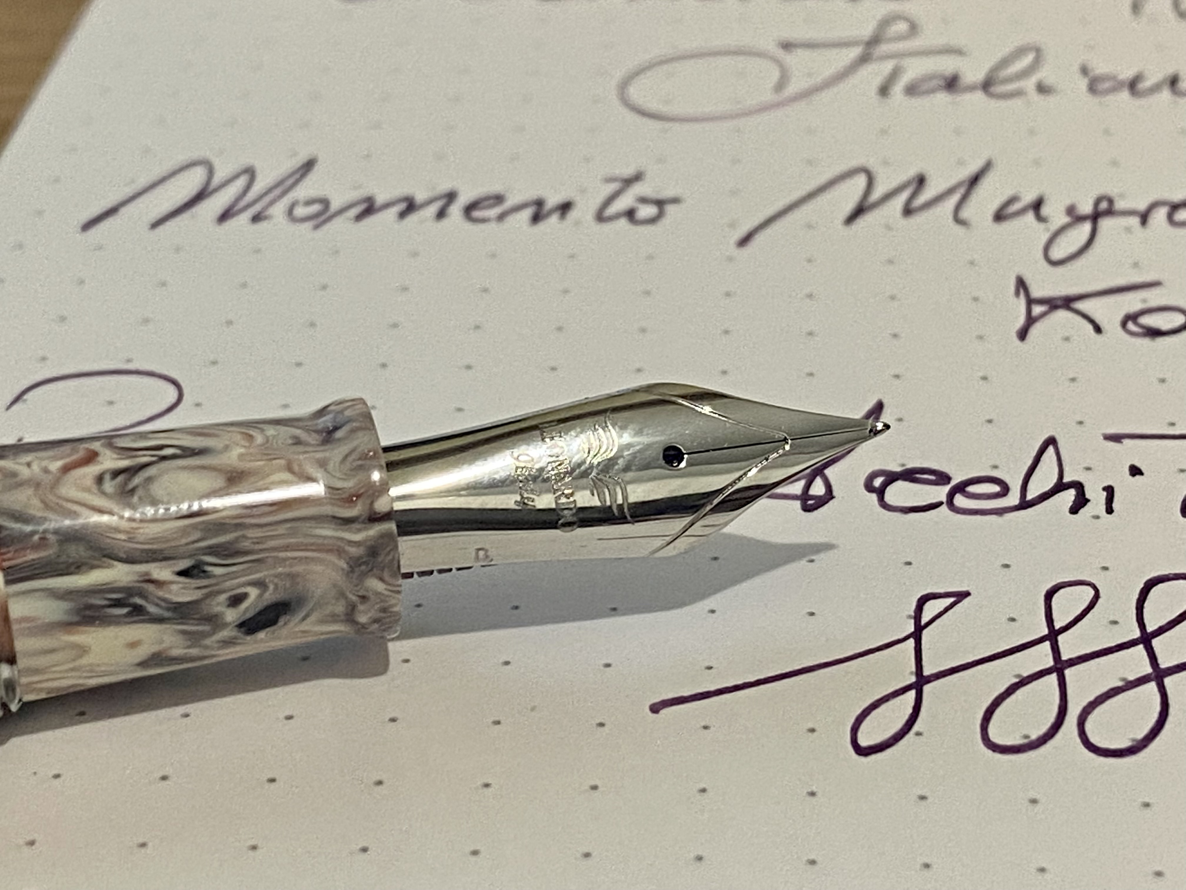 L'architect è in pratica il contrario di uno italico, e questo è un vero architect tagliente e dal feedback pronunciato, è un pennino che va capito e assecondato, bisogna trovare la giusta inclinazione su carta e poi via, scivola restituendo un piacevole effetto calligrafico che trovo particolarmente idoneo a chi prediligi tratti più fini. Il pennino consente anche una certa rotazione verso sinistra o destra, ed in queste condizioni il feedback è meno accentuato ma il flusso tende a diminuire, tenuto perfettamente perpendicolare invece offre un bel flusso generoso ma mai abbondante. Comunque con il suo alimentatore in ebanite non perde un colpo, scrive pagine su pagine senza mai fermarsi un attimo. Preciso comunque che io appena arrivata l'ho subito caricata con il J.Herbin Poussiere de Lune e non ho usato altri inchiostri.
