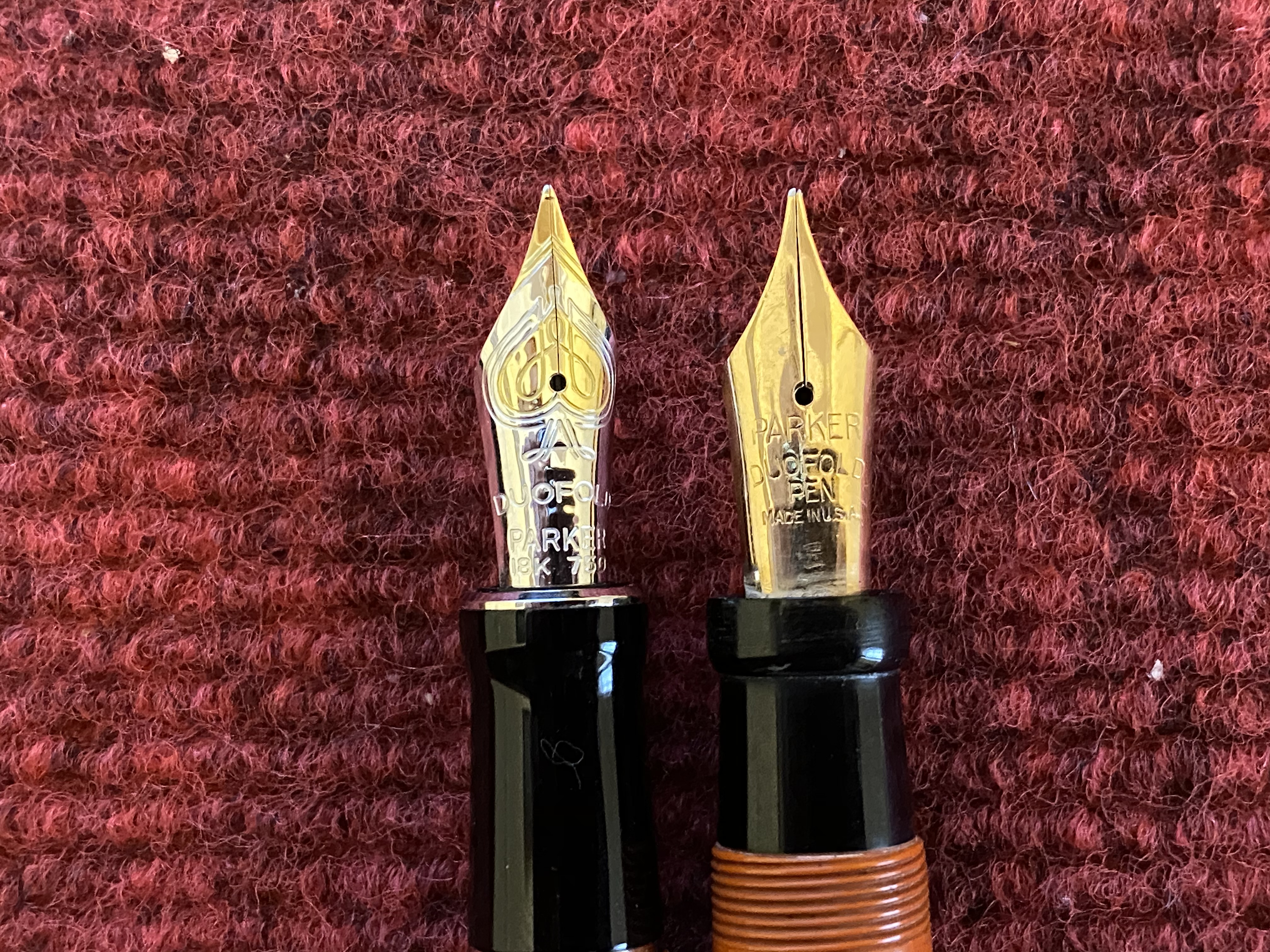 Materiali: la nonnetta è fatta in permanite, una plastica prodotta da Dupont a cui Parker affibbiò questo nome, ne più ne meno che plastica. La moderna è fatta in resina. Direi che considerata l’età e l’inevitabile invecchiamento del materiale la moderna vince.