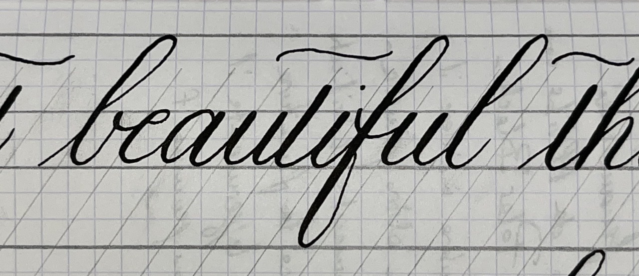 Ho voluto esagerare: ho tentato un Copperplate con corpo lettera da 10mm (una f minuscola copre 4cm) e ci ho riempito una pagina senza interruzioni. È un sollievo assoluto e, nonostante non abbia rispettato lo stile, il risultato mi gonfia il cuore.