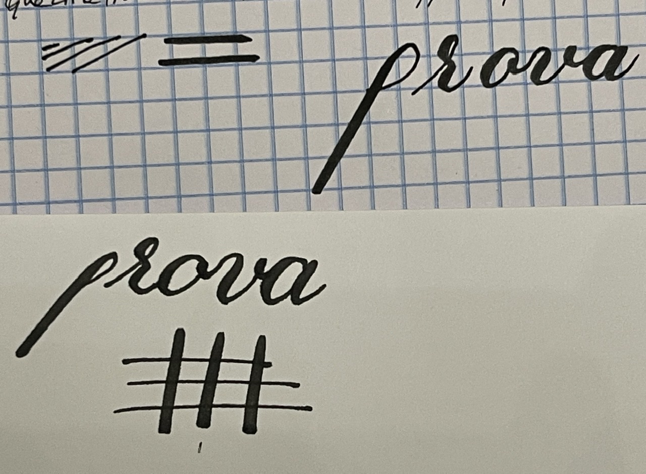 I quadretti sono di un blocco Pignastyl (resa perfetta), il foglio bianco è di carta da fotocopie della peggiore specie che spiuma qualsiasi cosa, anche gli EF con Diamine Green Black parecchio stitico. In questo caso appena accennato lo spiumaggio.