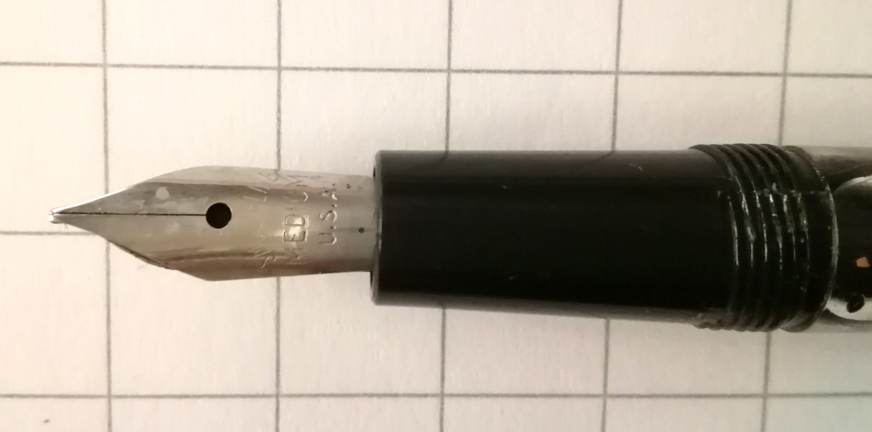 Però di questa penna non so praticamente nulla, e probabilmente qualcuno può aiutarmi a capire meglio di che si tratta: modello, periodo di fabbricazione... inoltre penso che il pennino possa non essere originale, per due motivi: innanzitutto su di esso si legge chiaramente "U.S.A." e mi pare che Conway Stewart fosse un produttore inglese, per cui la cosa non quadrerebbe, a meno che siano stati montati pennini prodotti altrove sulle penne più economiche, come penso sia questa. Tuttavia osservando come il pennino poggia sull'alimentatore (ultima foto) si direbbe che quest'ultimo sia stato disegnato per un pennino più lungo o di forma differente. Se qualcuno che conosce meglio di me queste penne può illuminarmi...