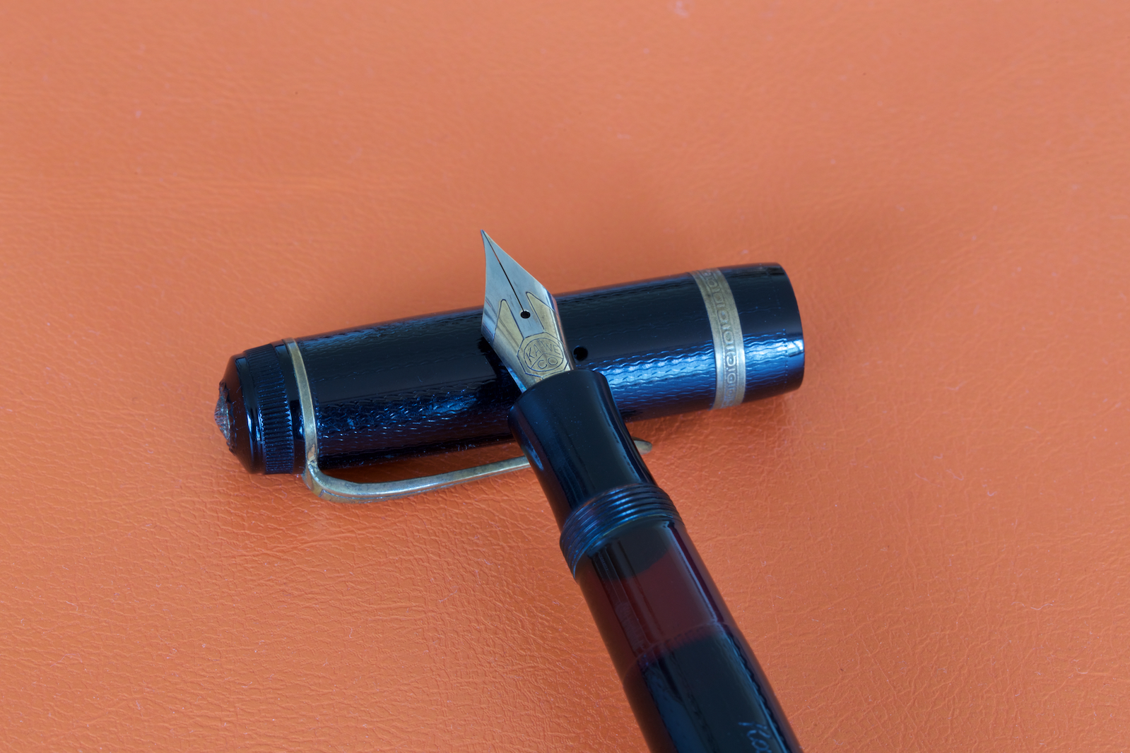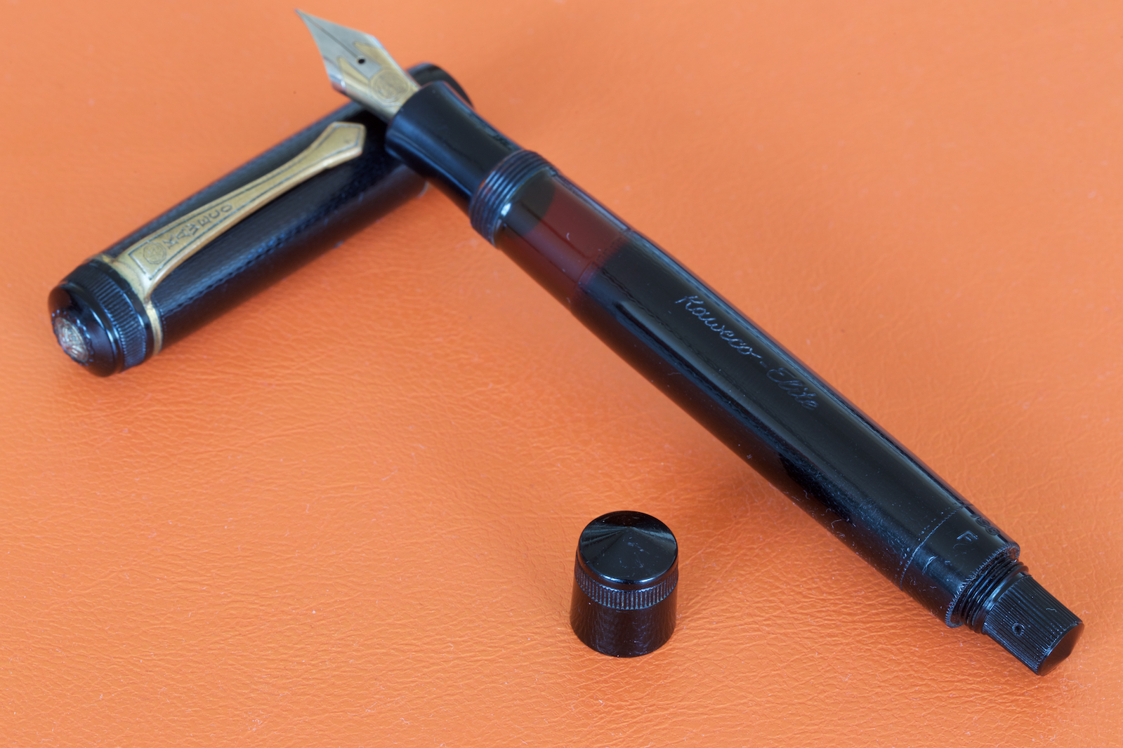 Il ritrovamento di questa penna mi ha reso molto felice sia per il suo stato di conservazione sia per le sue forme. È una penna che da quello che leggo nel Wiki nasce nel 1937, in celluloide con caricamento a stantuffo. Il pennino della mia pare essere in acciaio bicolore, tratto fine e molto rigido. Scrive assolutamente bene ed è molto leggera. La 190 era la misura più grande tra quelle in produzione.
