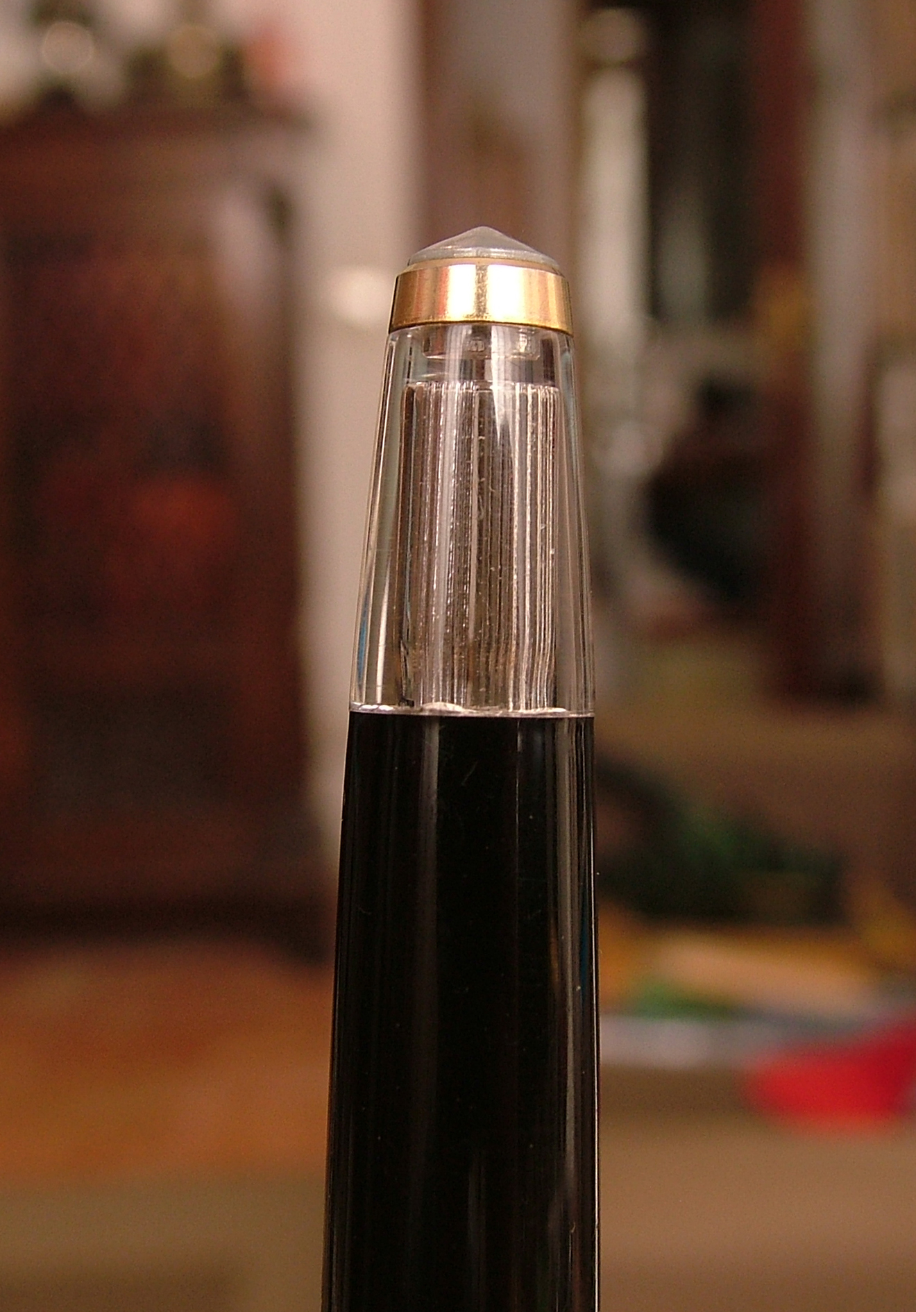 Molto interessante, mi sembra una reinterpretazione del caricamento vacumatic di parker. Parto dal presupposto che sotto il fondello trasparente ci sia un pulsante, puoi confermarlo?