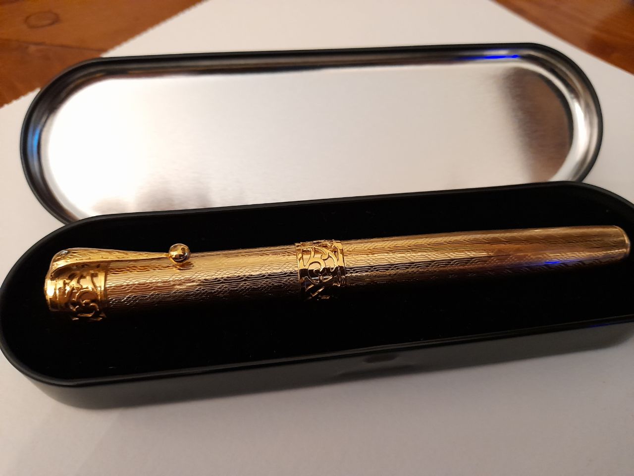 Che dire, è bellissima e scrive magnificamente: pennino medio piuttosto abbondante, feedback piacevole e ben bilanciata. Sembrerebbe davvero laminata in oro, la lavorazione è fantastica dal vivo