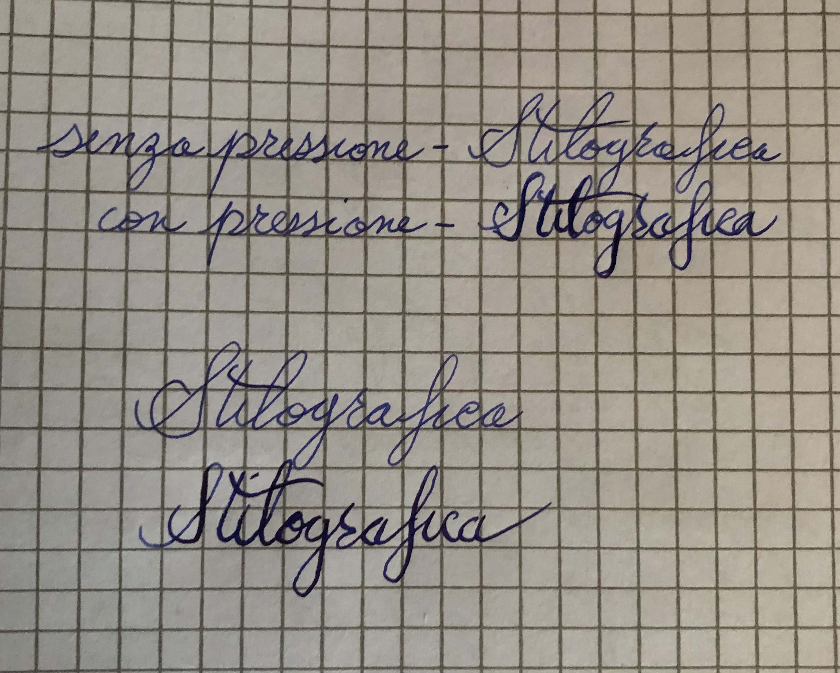 Insomma, l'elasticità del pennino si riesce ad ottenere facendo una bella pressione (anche molta) sulla penna, una cosa per me del tutto innaturale nella scrittura normale. Già faccio fatica a scrivere con la mano leggera figuriamoci se devo irrigidirmi per fare pressione durante la scrittura. Il risultato è qualcosa di simile