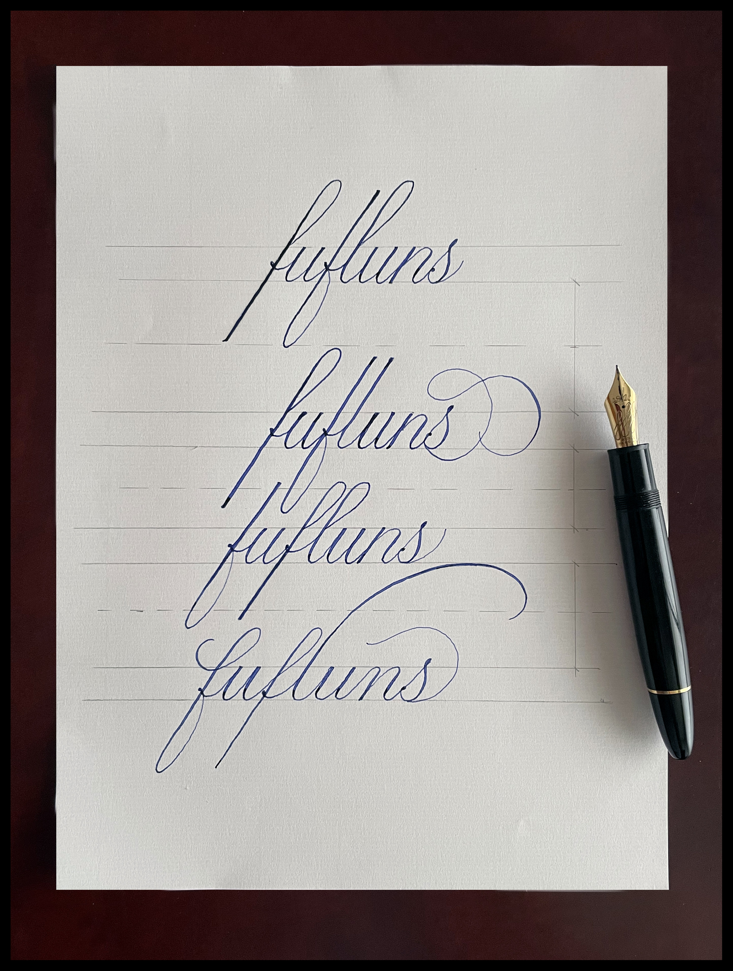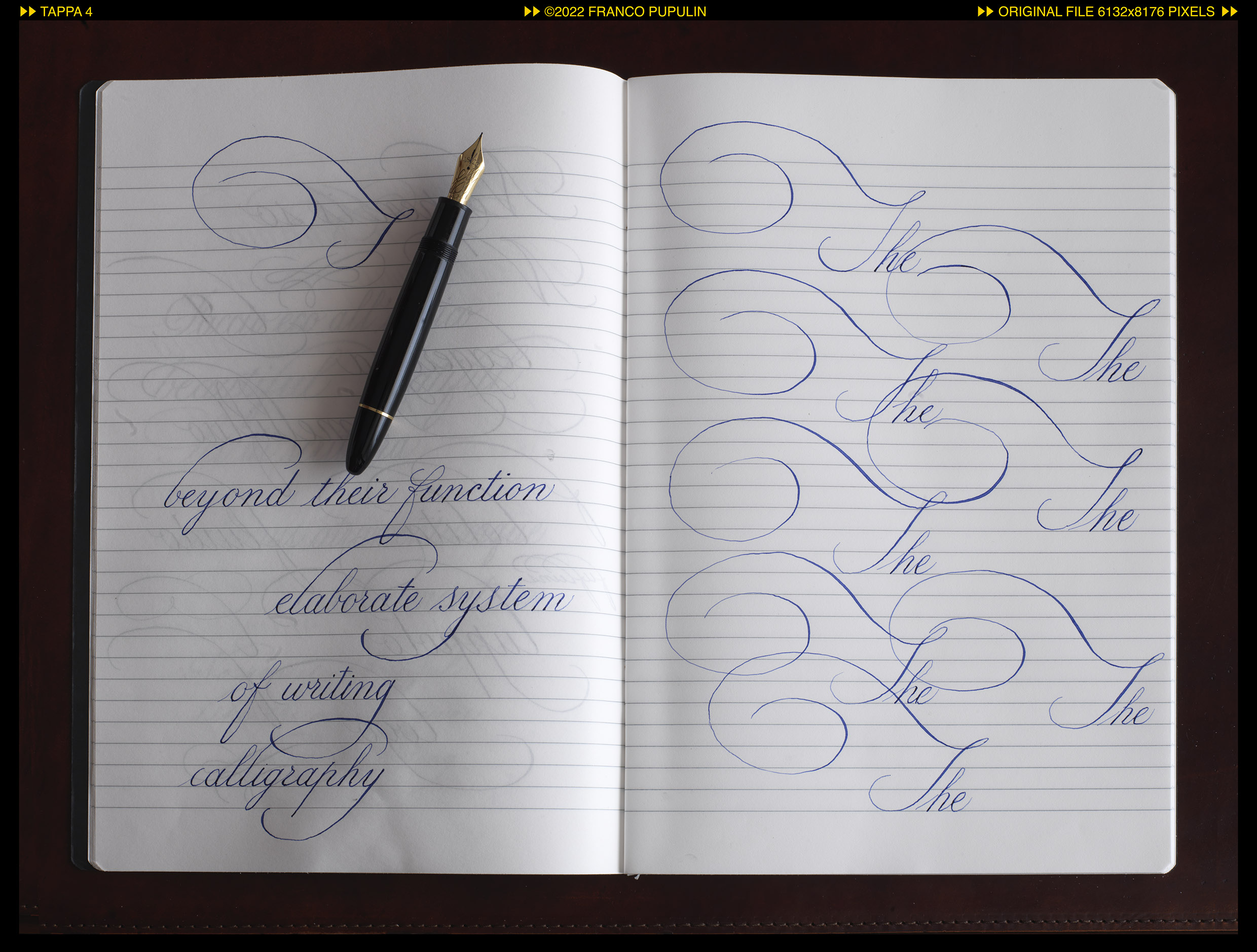 La parte più critica di questo lavoro é certamente una esecuzione decente delle due "T" che servono da capolettera, oltre alla curvatura armonica delle fioriture degli ascendenti e discendenti. Vado a praticare le due cose con qualche esercizio. Uso qui un quaderno più grande, con maggior spazio per la scrittura (é un quaderno A4 EcoQua di Fabriano, con carta di 85 g/mq), ma con le righe anch'esse di 8 mm, la stessa altezza che voglio utilizzare per la versione finale. Noterete che l'inchiostro Blue Permanent si comporta egregiamente su entrambi i tipi di carta, per quanto non sofisticate. Tempo totale necessario per questa quarta fase: altri 30 minuti.