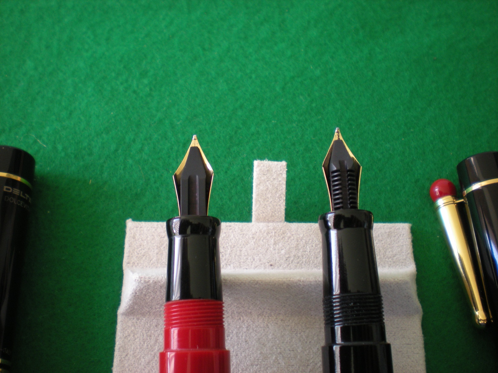 Si tratta di alimentatori Bock, che venivano montati anche sulle Visconti. Quello montato sulla penna rossa ce l'ho anche io su una Visconti Van Gogh Mini, e il comportamento è assolutamente impeccabile: ha sopportato sessioni di scrittura lunghissime e molto veloci, senza batter ciglio, smettendo di dare inchiostro quando la cartuccia si esauriva. Quesllo montato sulla penna nera, invece, è problematico, e ne ho parlato a proposito dei problemi riscontrati sulla mia Visconti Rag-Time, che lo monta ed è chiaramente più recente rispetto all'altro. Ne ho sostituiti ben 3, insieme al pennino, senza risolvere. E' l'alimentatore che mi ha persuaso a non acquistare più Visconti.