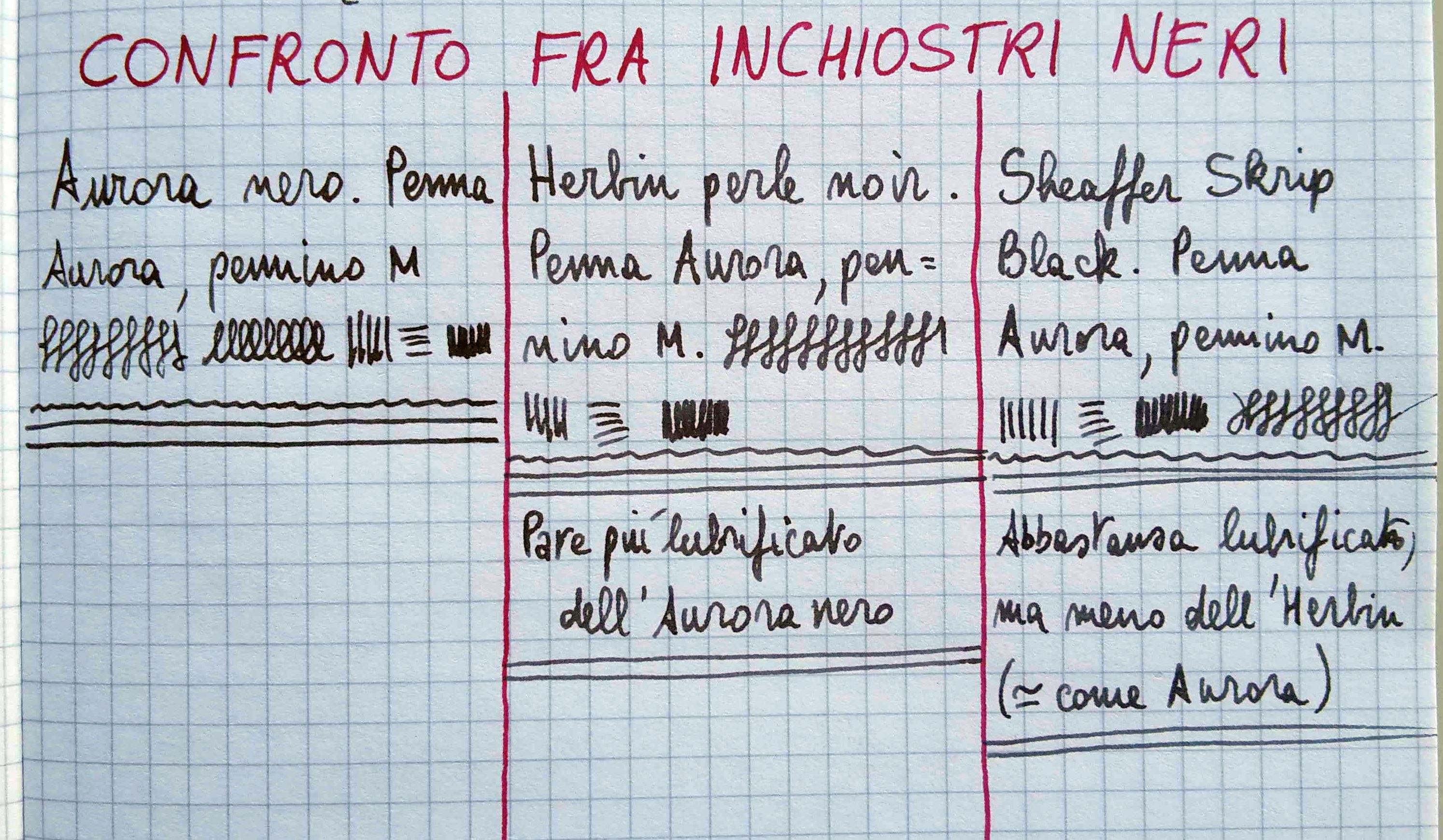 Le mie impressioni dal vivo: come colore, il più nero dei tre è l'Aurora, seguito dallo Sheaffer e poi dall'Herbin. Di contro, quello che sviluppa più sfumature - comunque leggere - è l'Herbin, poi lo Sheaffer e il più uniforme è l'Aurora. Questo aspetto negli inchiostri colorati di solito lo trovo gradevole, ma nel caso del nero non sono troppo contento di vederlo sfumare nel grigio scuro.