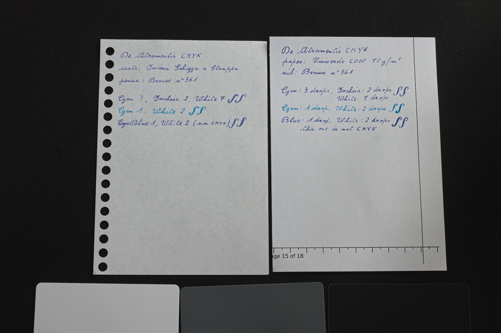 Poi già che facevo miscele ho provato a schiarire / desaturare sia il ciano che il blu regolare con una parte di inchiostro e due di bianco, e nelle foto ci sono anche quelle prove.