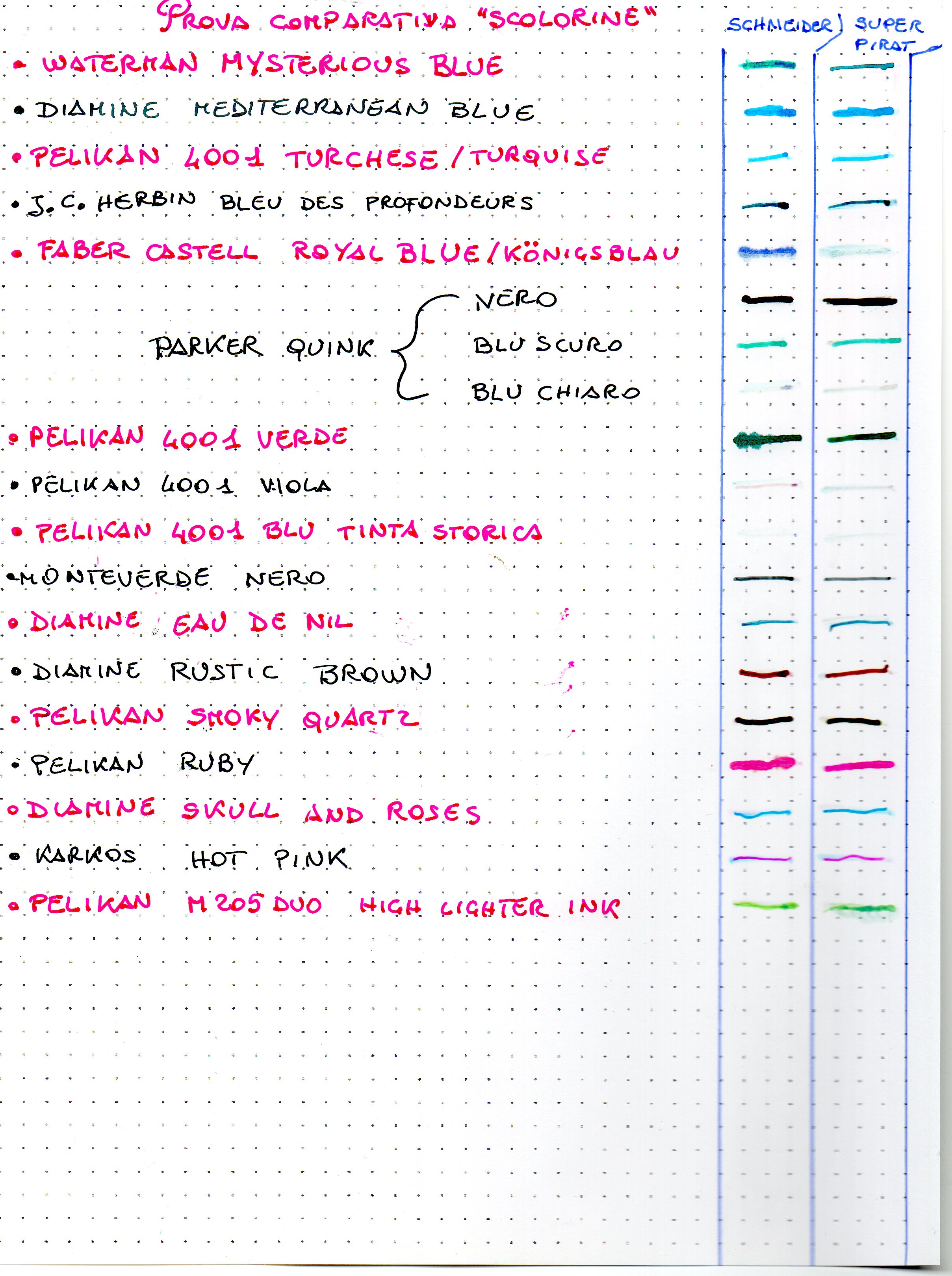 Oggi avevo voglia di test e così mi sono messo a testare sia con la SUPER PIRAT PELIKAN che con una SCHNEIDER CORRY alcuni inchiostri che ho nel mio scaffaletto a muro.