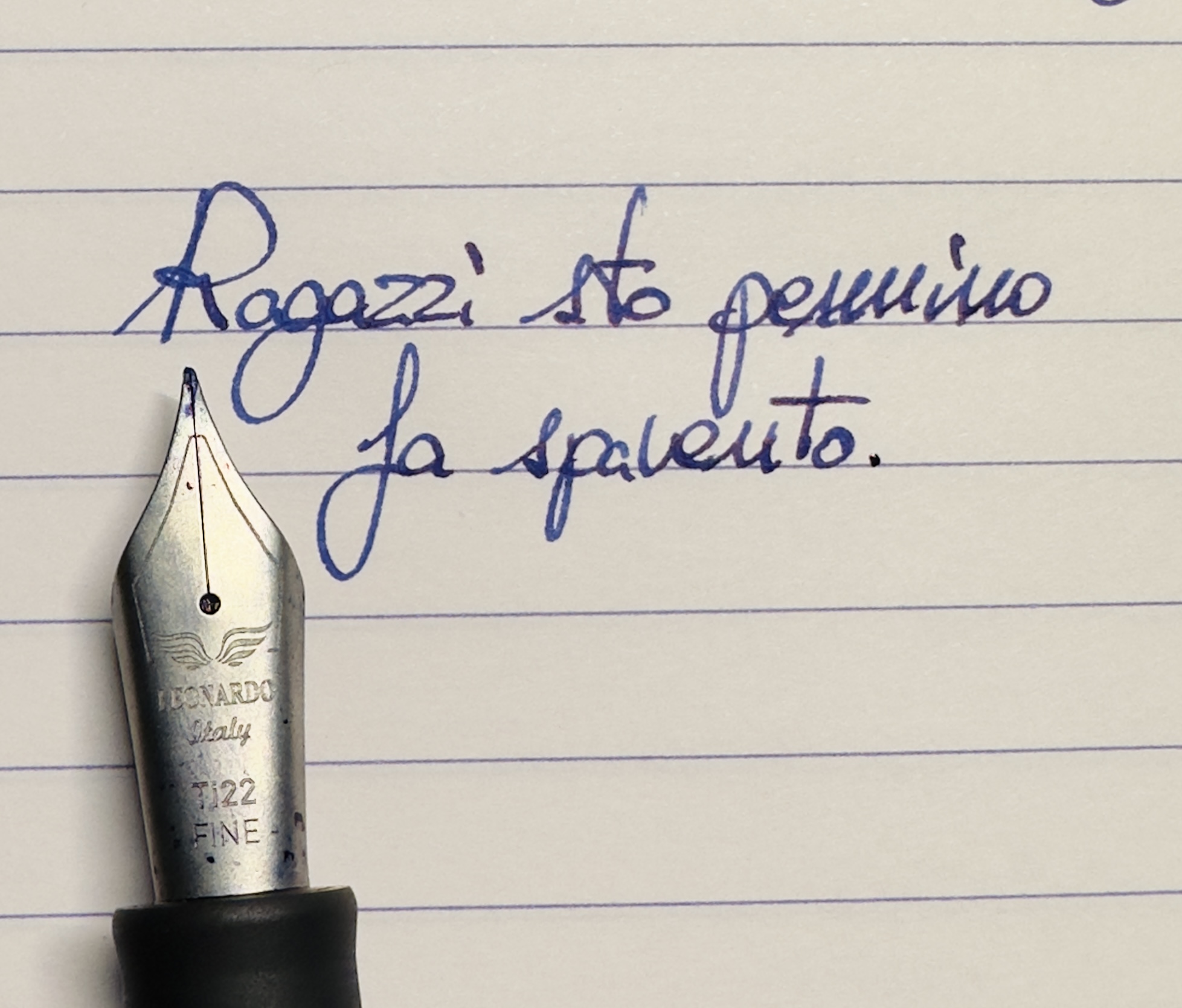 La nuova lamina che Leonardo è riuscito ad ottenere partendo dallo standard Bock è impressionante, sembra di scrivere su dei marshmallow. Il pennino flette con una pressione minima, le qualità elastiche sono degne di nota per la velocità con cui i rebbi ritornano, il flusso è sempre adeguato, perfetto sia che la penna scriva sotto il suo peso, sia che si applichi pressione. Ho richiesto un grinding CSI molto tagliente, più un italic che uno smooth italic. Il feedback accompagnato dalla dalla morbidezza e dalla rapidità del pennino rendono unica l'esperienza di scrittura.