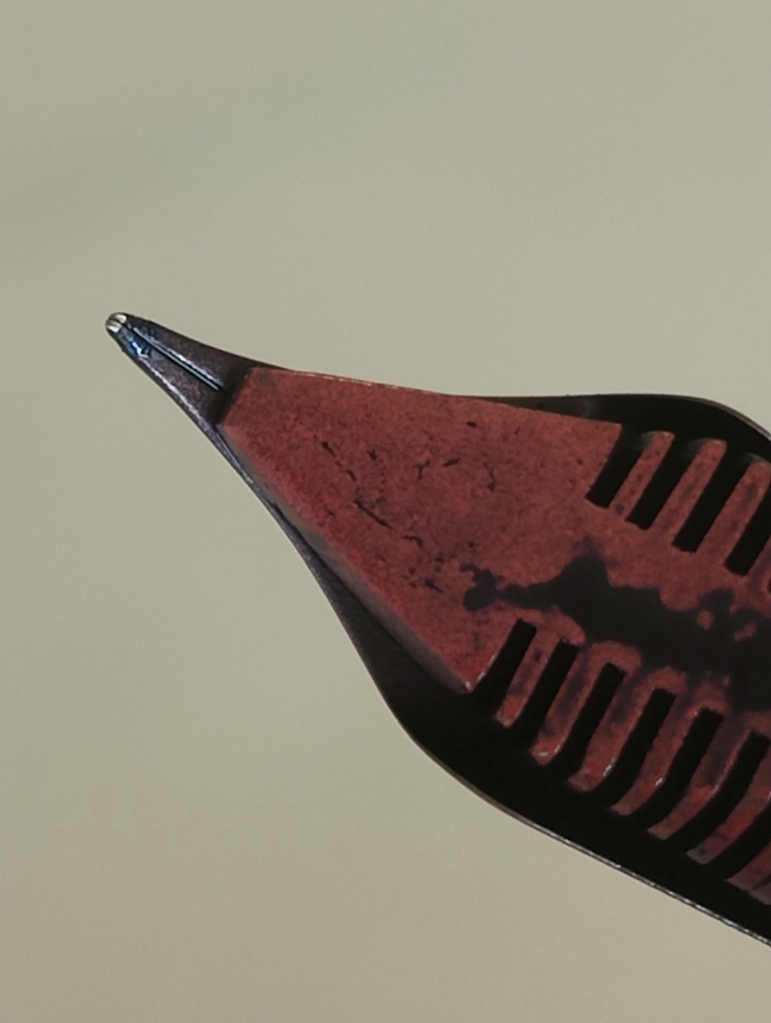 Il pennino in titanio che Francesco ha definito scugnizzo napoletano io ce l'ho nella gradazione CSI F sul modello Momento Zero Grande Primary Manipulation #1. Concordo con Francesco: i primi pennini di titanio che ha proposto Leonardo sono dei "flessibili con il trucco". La loro morbidezza aiutata dalle dimensioni del pennino #8 da' la sensazione di avere tra le mani un flessibile che, però, in realtà è un elastico. Il pennino presenta una superficie molto porosa ed un tono più scuro del palladio in cui sono fatte le metallerie.