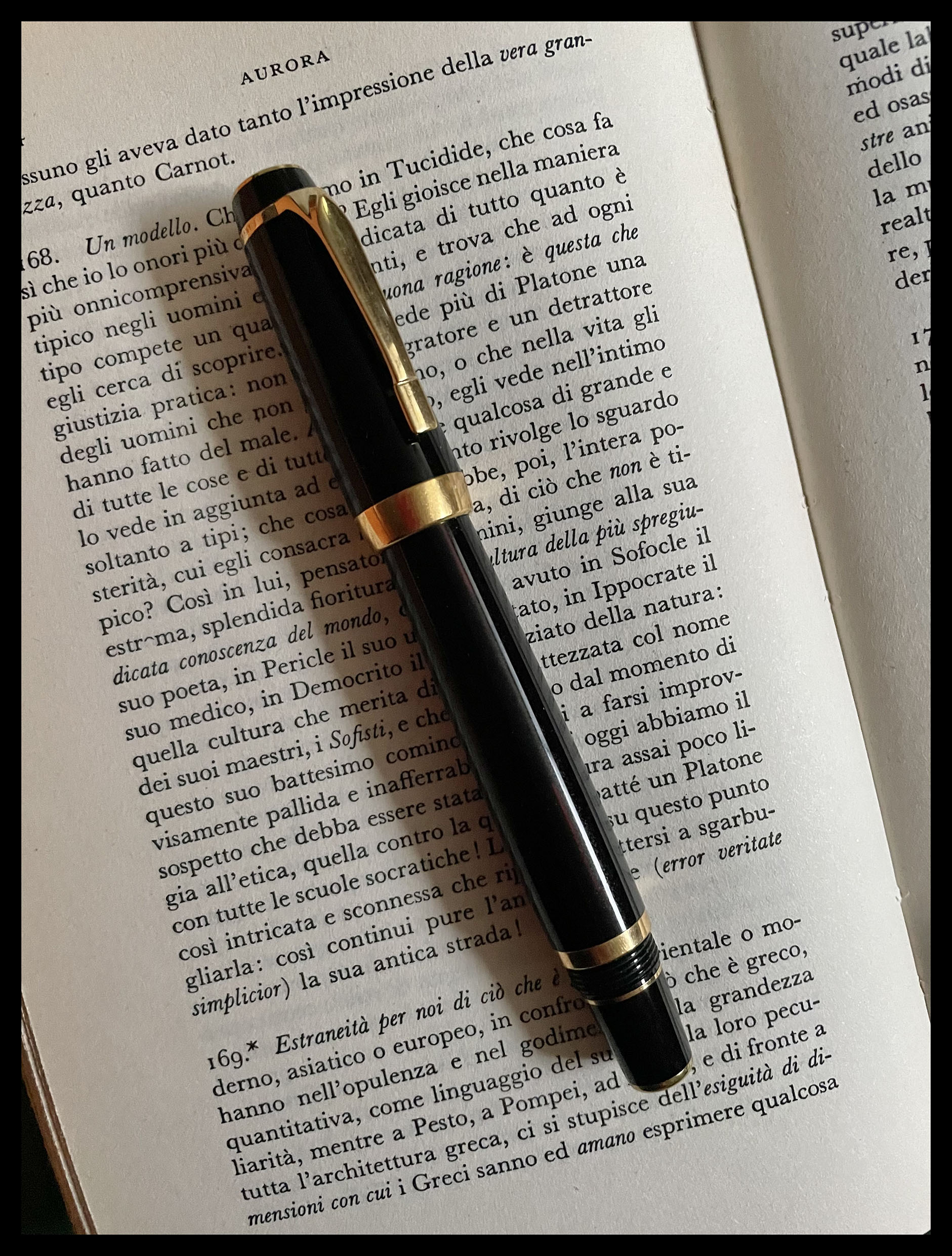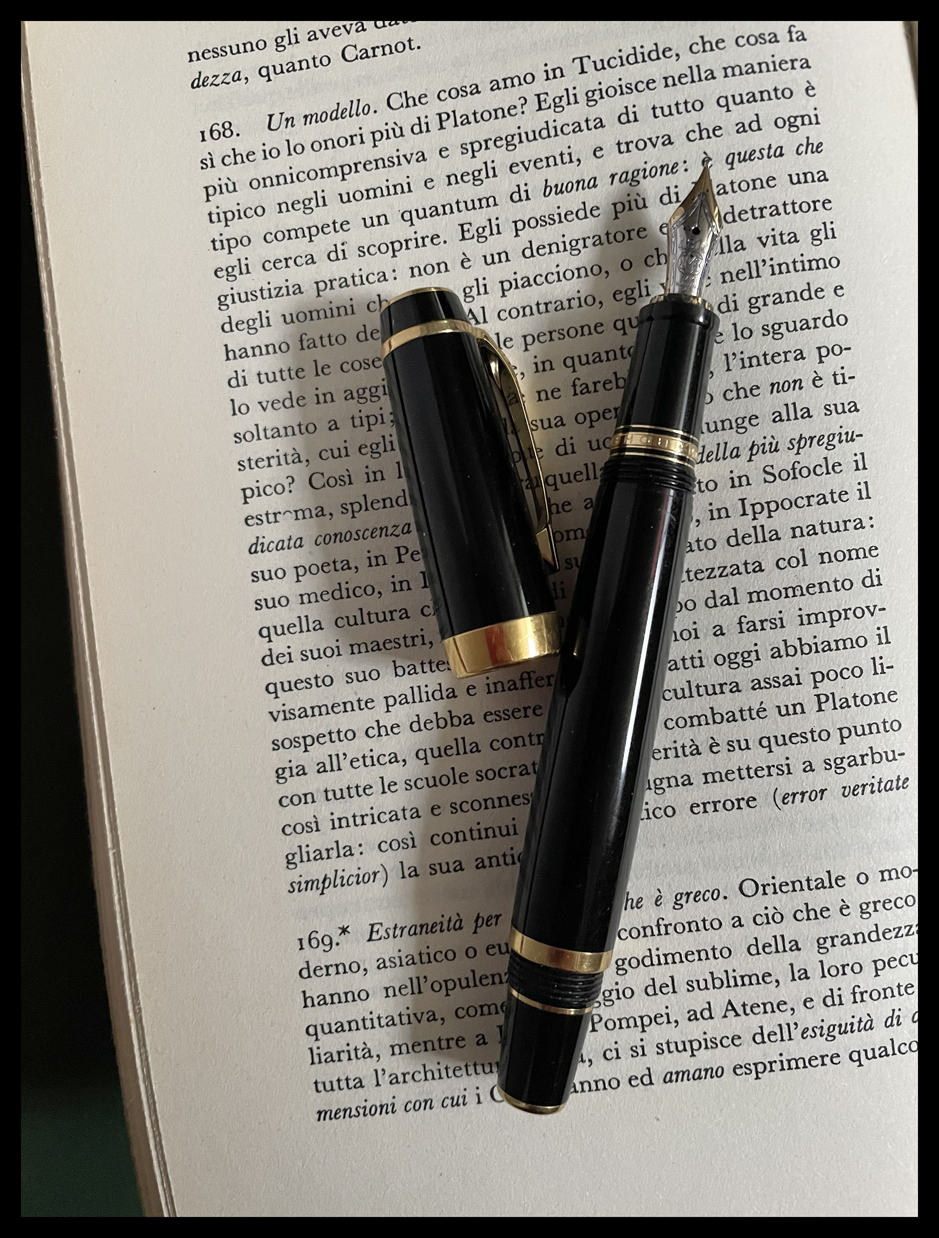 Trovo che tutte le Bohème siano bellissime, tanto quelle di resina quanto quelle di metallo. Mi sembra che la pietrina sintetica si addica a questa penna, soprattuto il quarzo fumé e la pietra nera, ma la mia preferenza - per mio uso personale - va senza dubbio ai modelli senza pietra e, come mi sono ormai reso conto da tempo, all’abbinamento del nero con l’oro, che trovo più “caldo” e più classico. Mi sono dunque messo in caccia di una Bohème Midsize senza pietra in finiture dorate vari mesi fa. Impresa davvero ardua! E' talmente raro trovarne una in vendita che sembra non essere mai esistita. Infine ne ho scovata una che univa molte delle cose che volevo: usata ma non troppo, un prezzo ragionevole e un pennino che non fosse medio: un fine, squisito come la maggior parte dei pennini fini di Montblanc. Arrivando a casa dei genitori, l’ho infine trovata tra le mie cose.