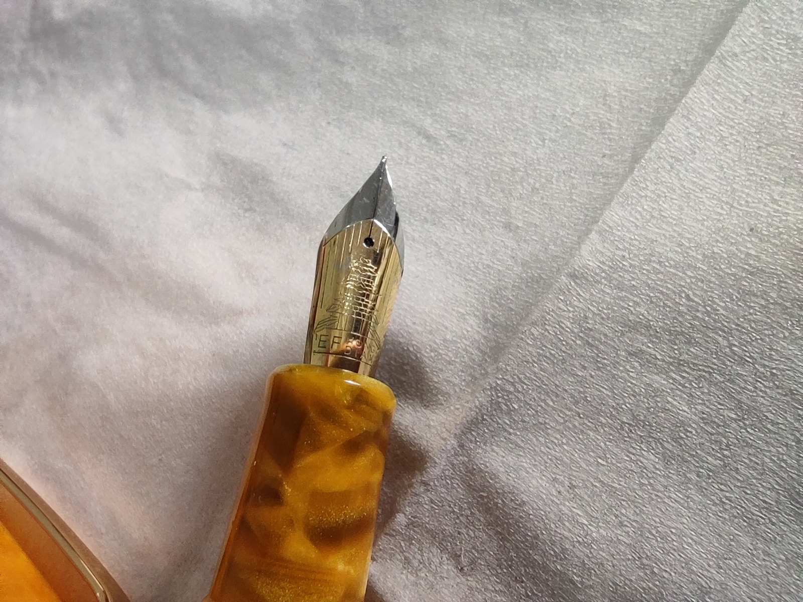 Veniamo alla penna, è una stilografica in resina arancione chiaro, tendente al giallo con pennino in acciaio extra fine.