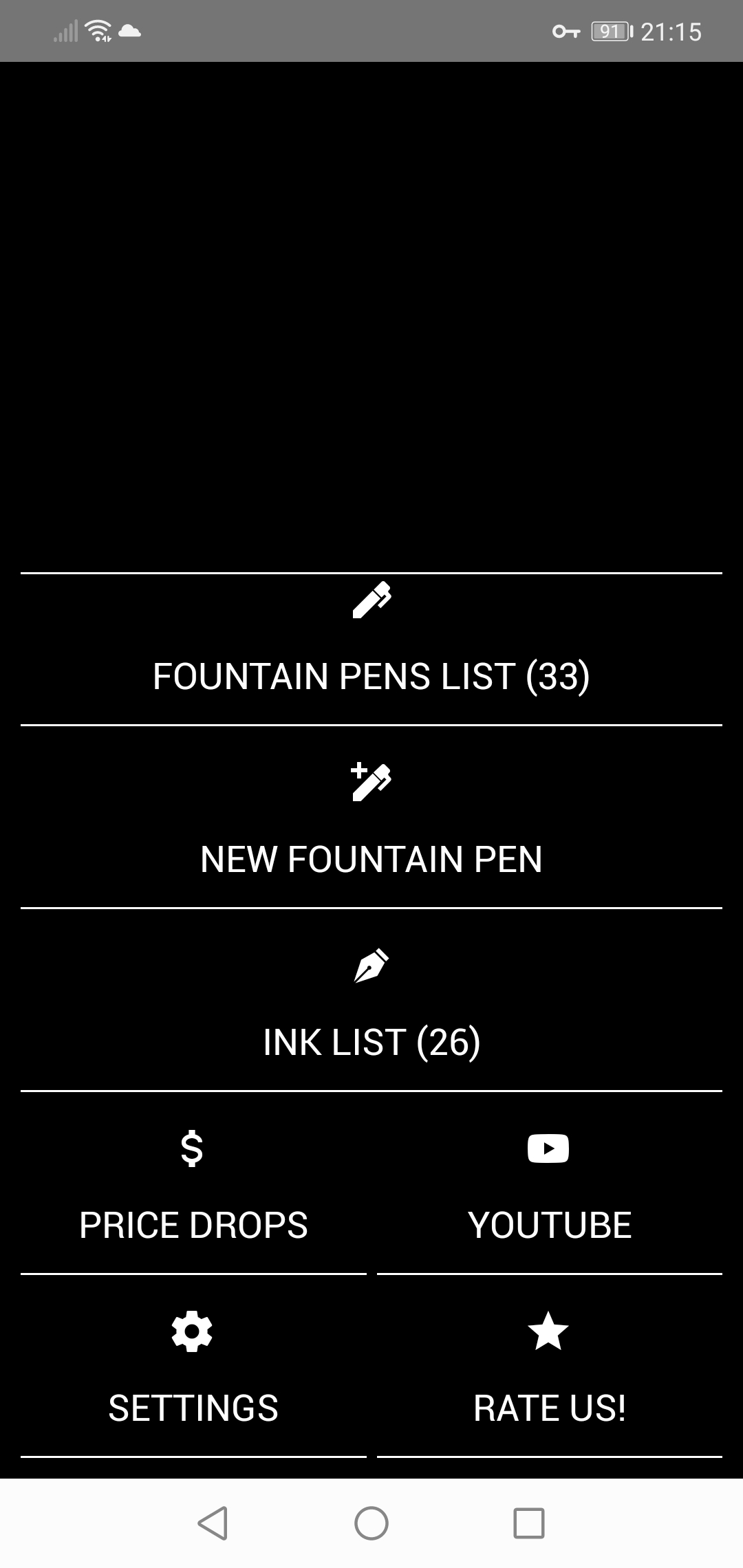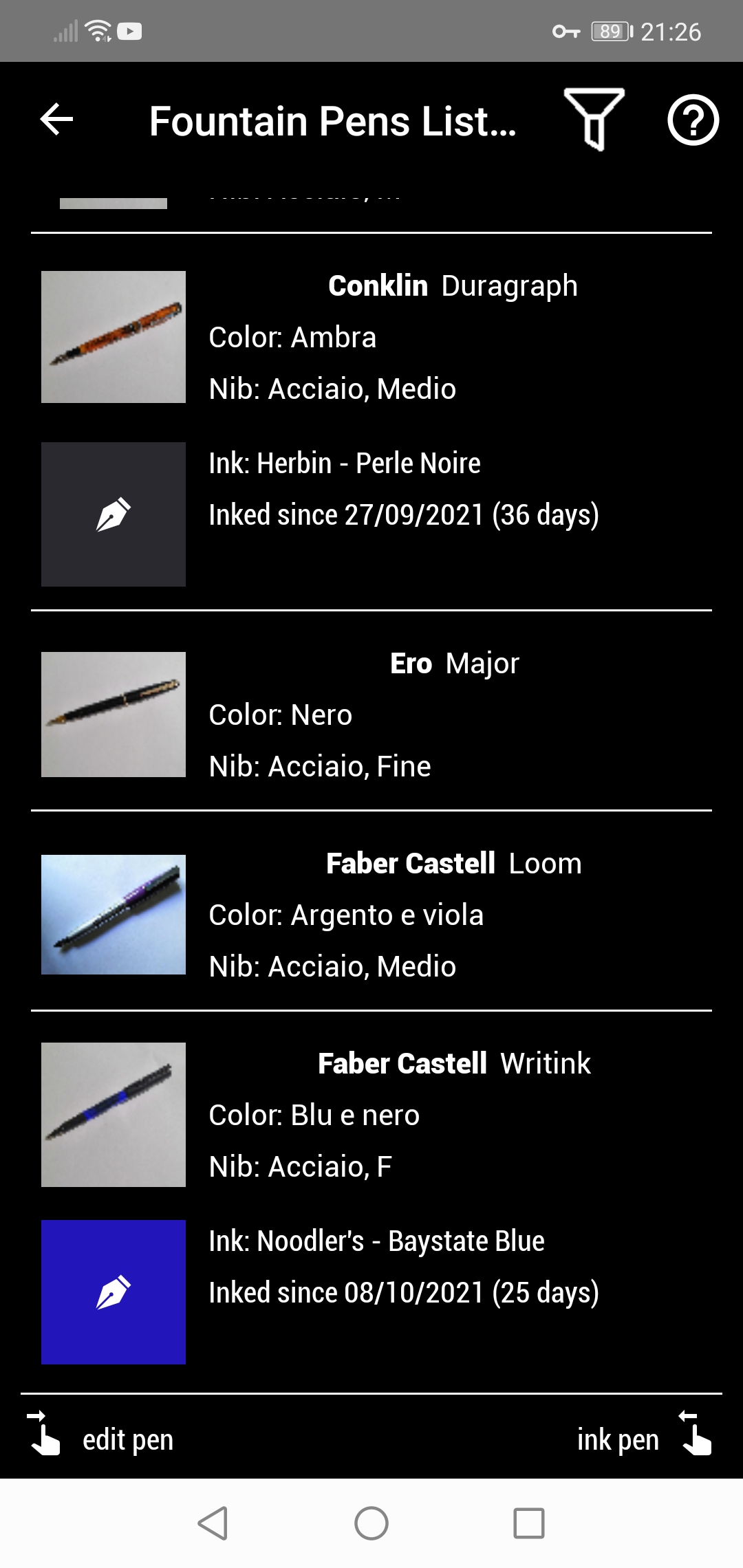 Ecco la risposta, la schermata iniziale della app che uso per tenere nota di penne e inchiostri. Puoi indicare anche quale inchiostro carichi in quale penna, e quando